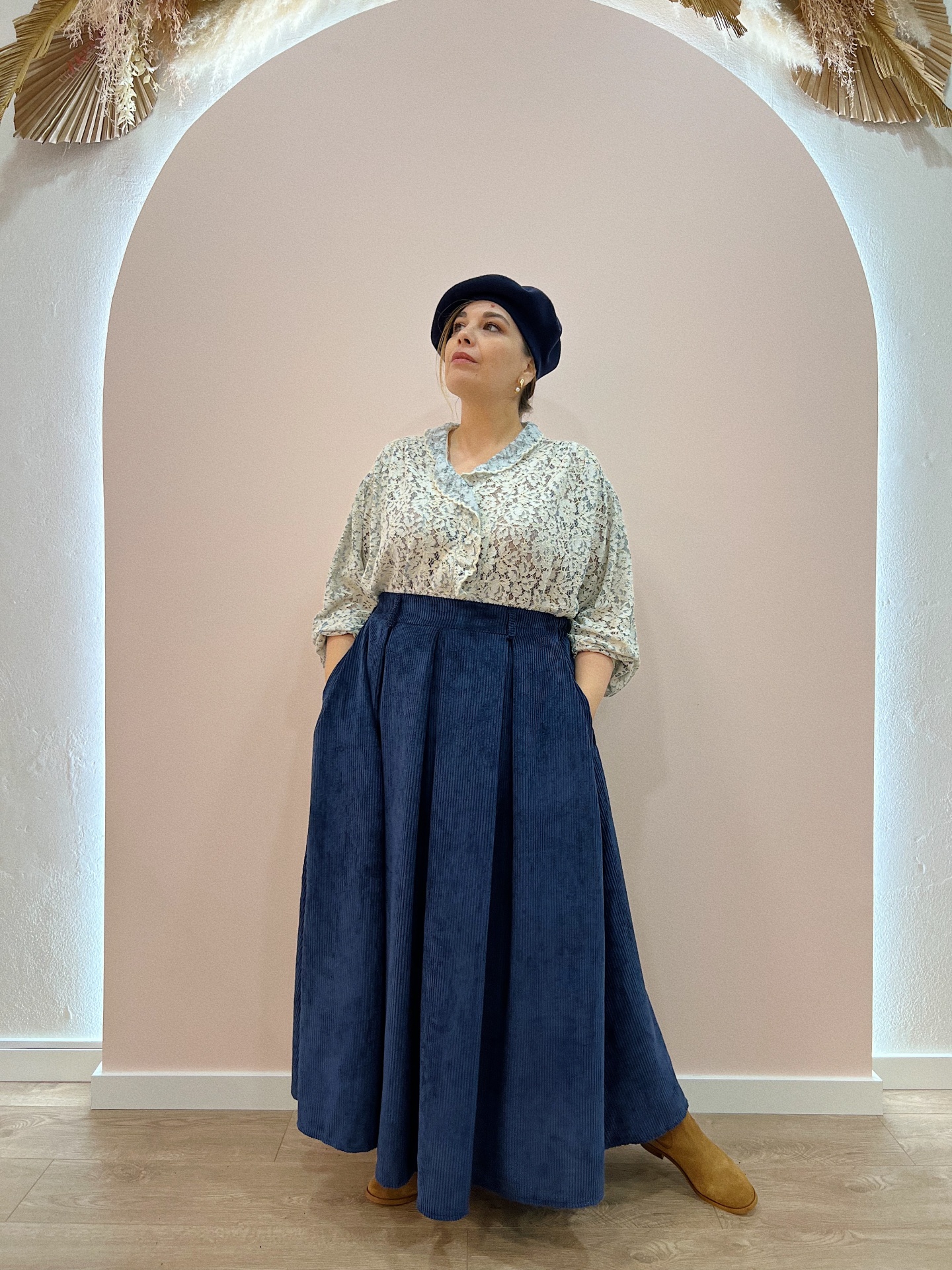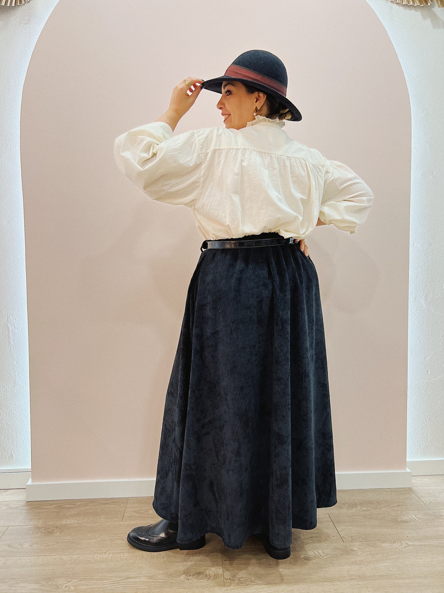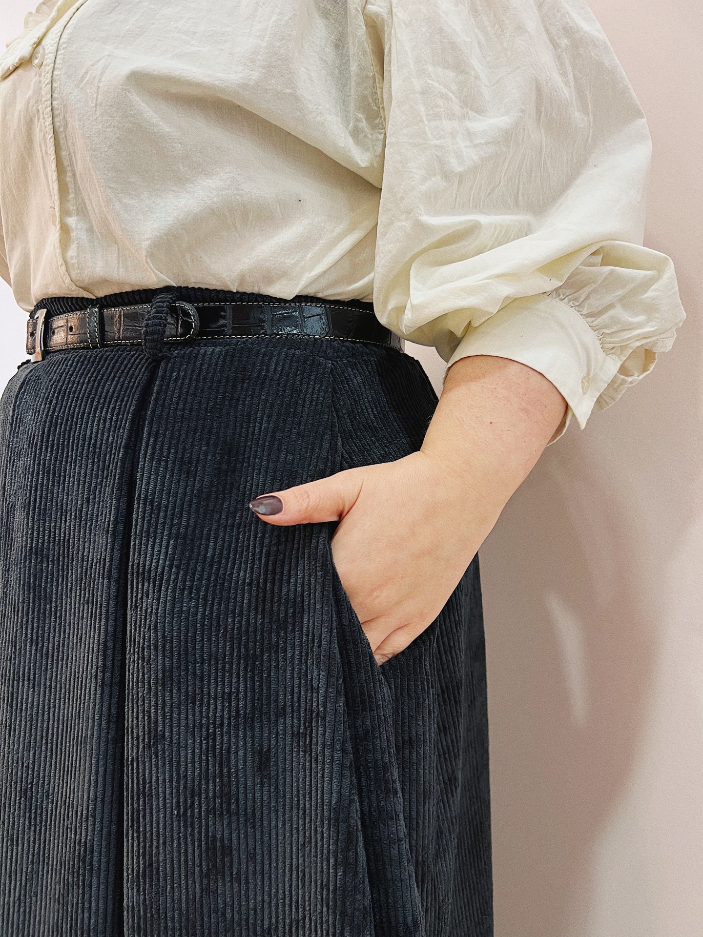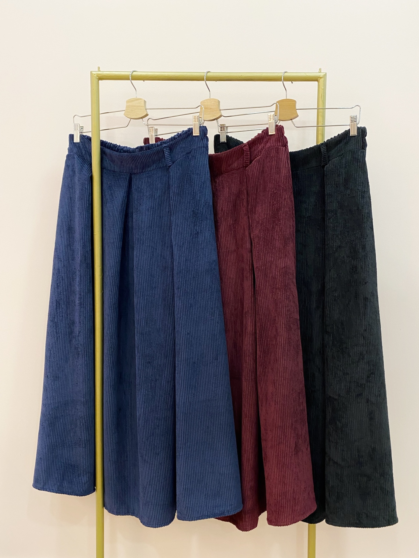 Saia de bombazine aveludada (quentinha) com comprimento midi e efeito rodado.