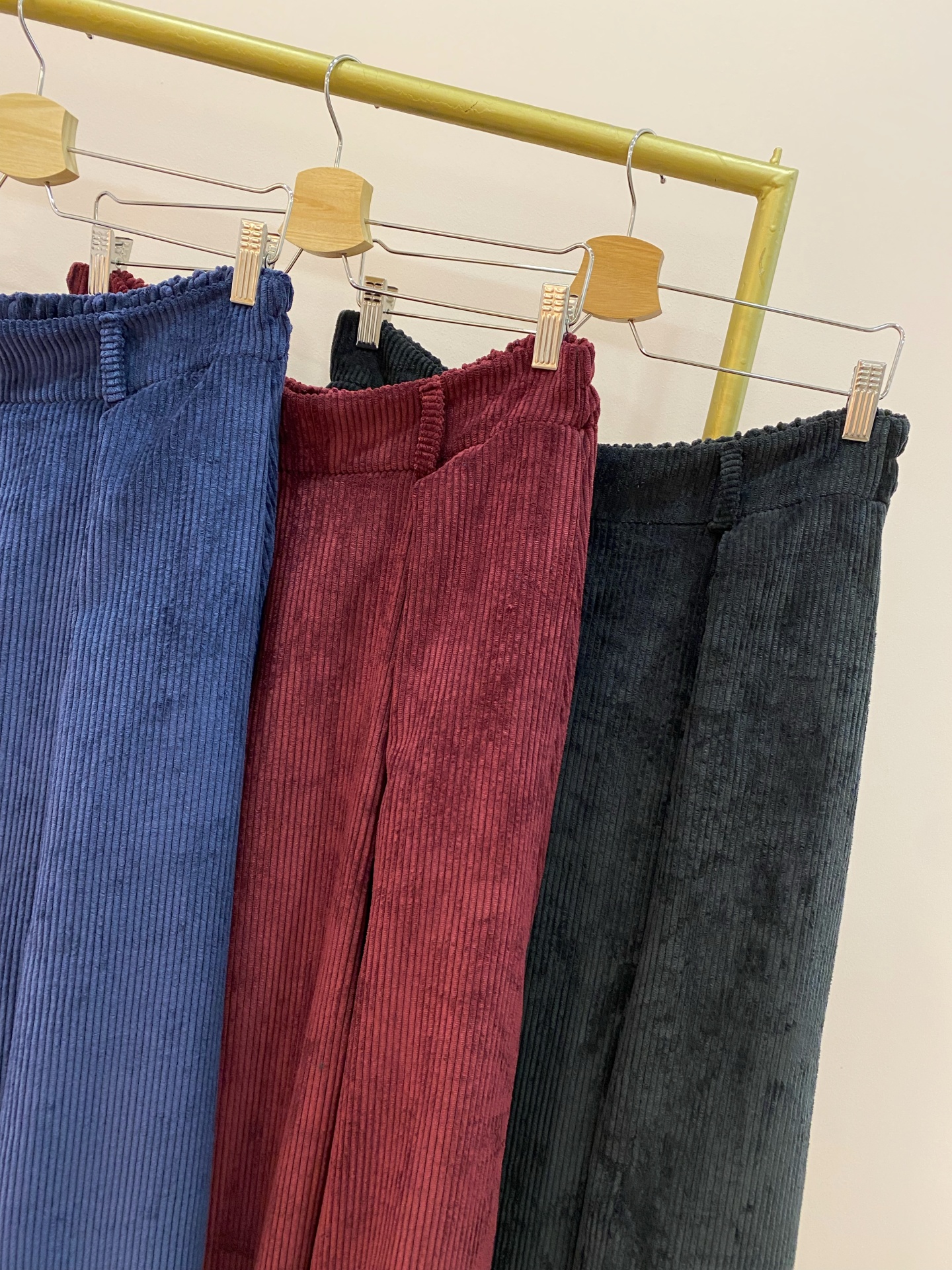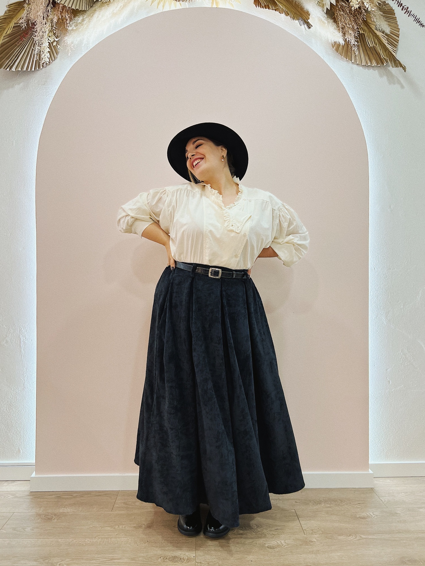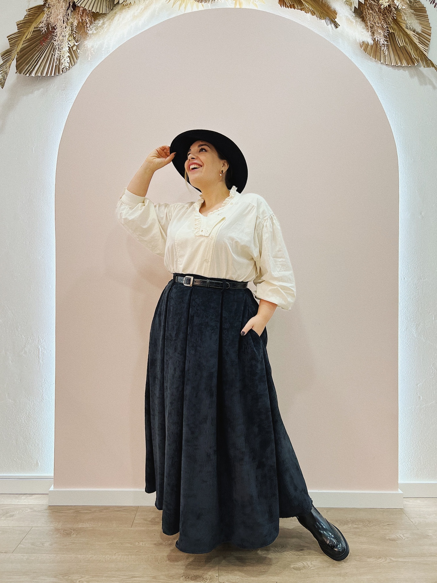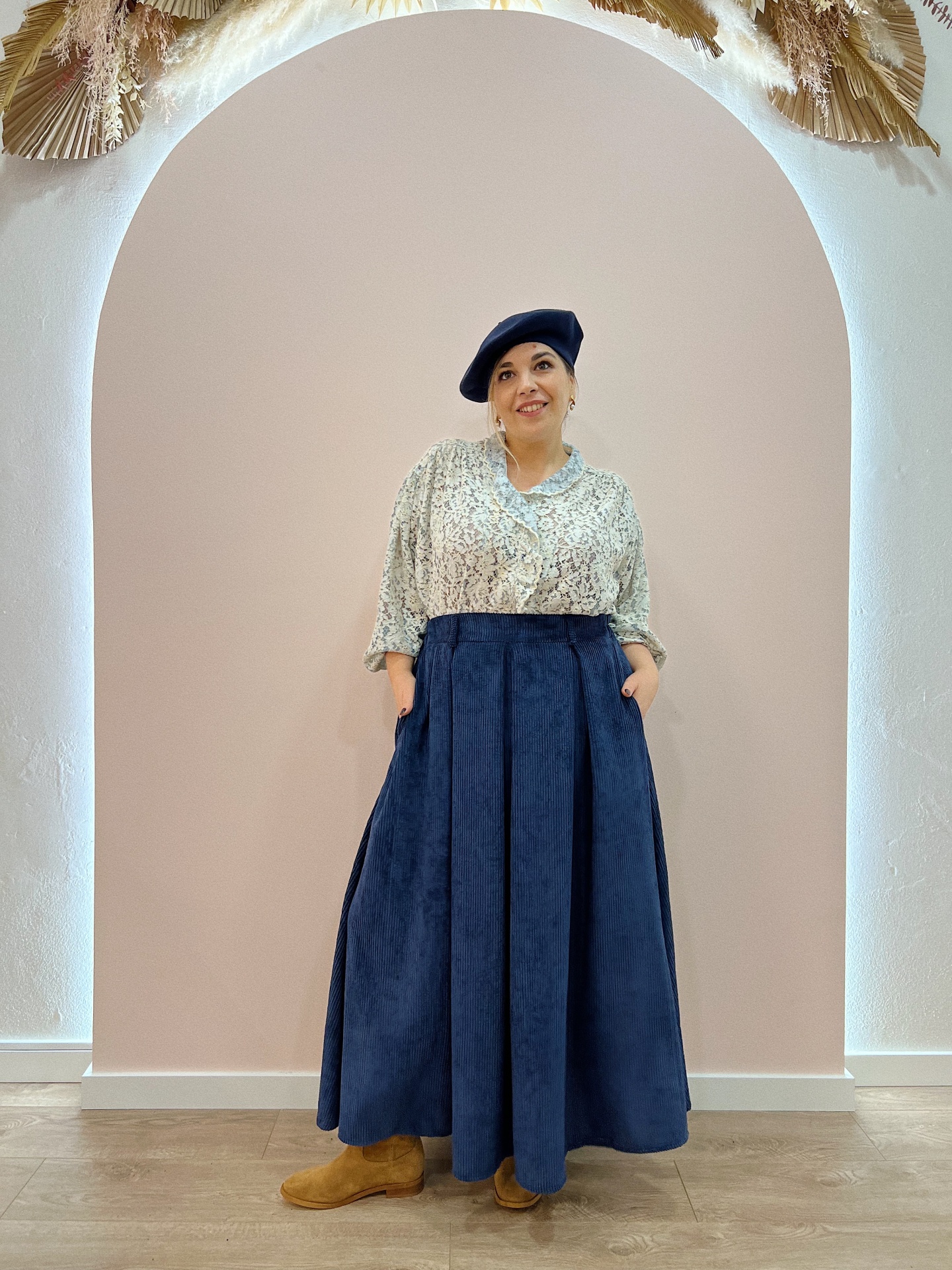 Saia de bombazine aveludada (quentinha) com comprimento midi e efeito rodado.