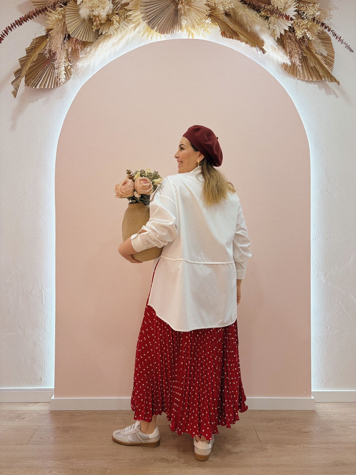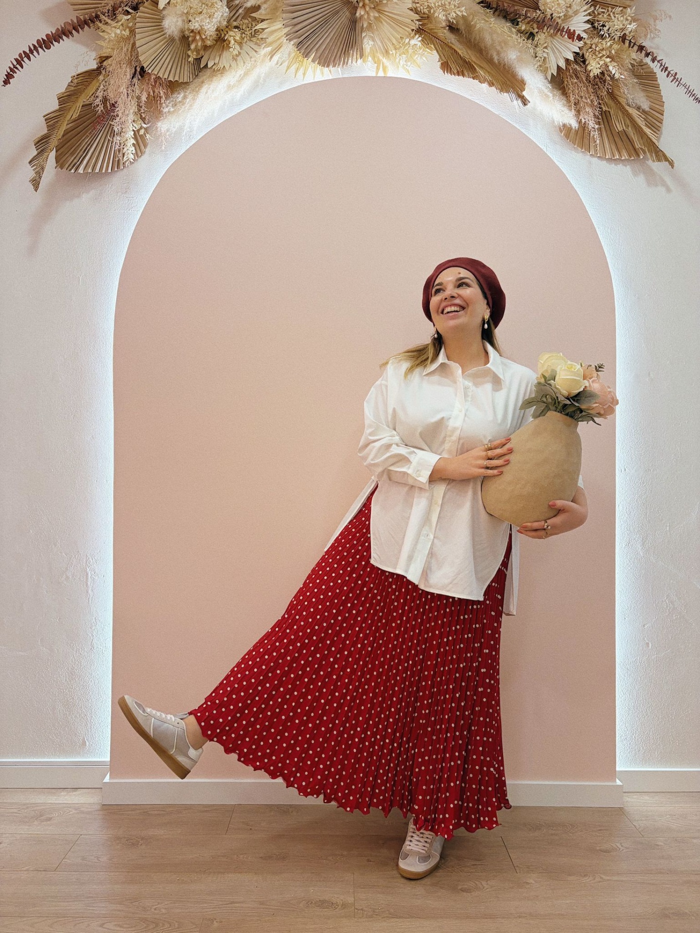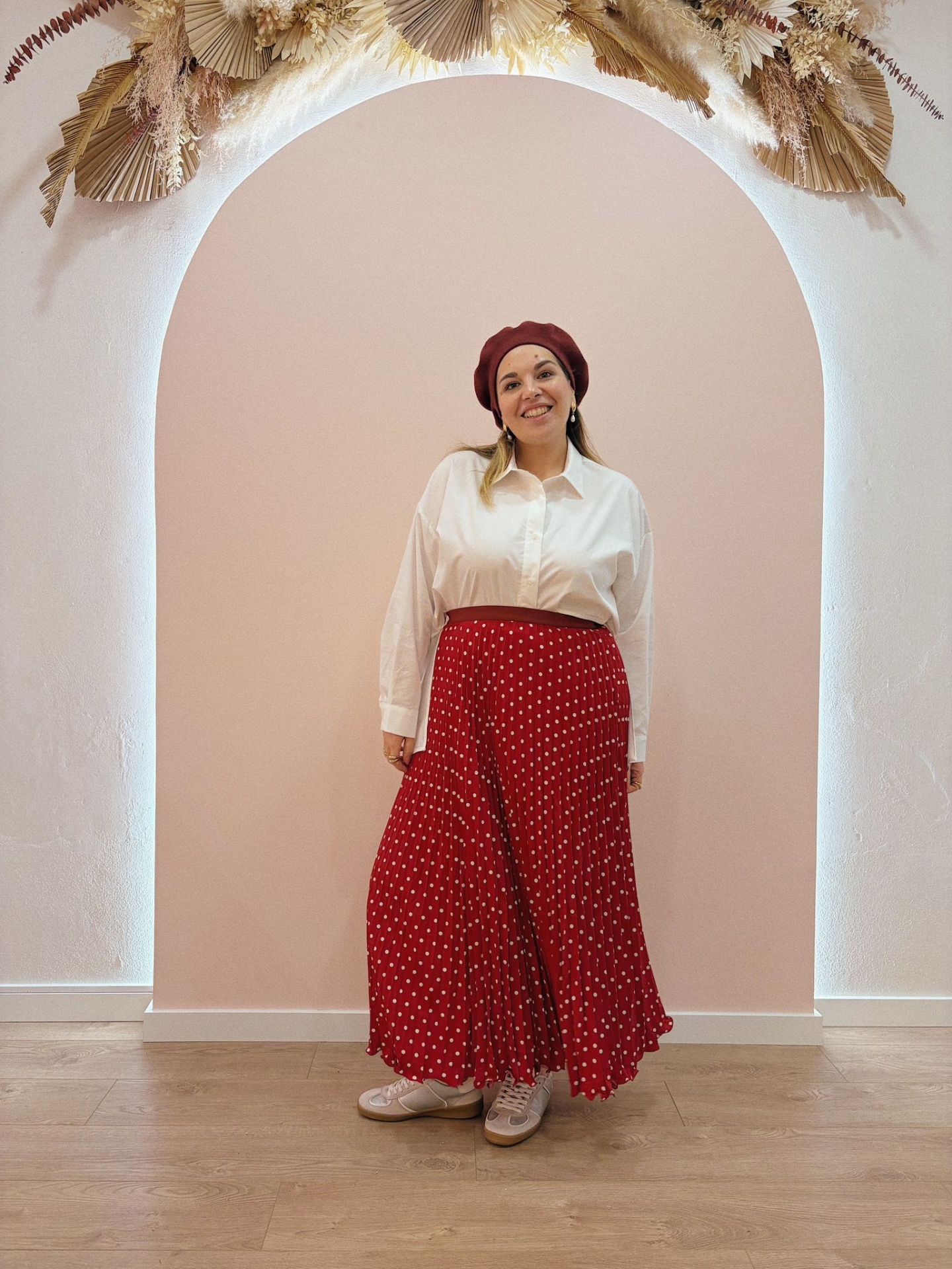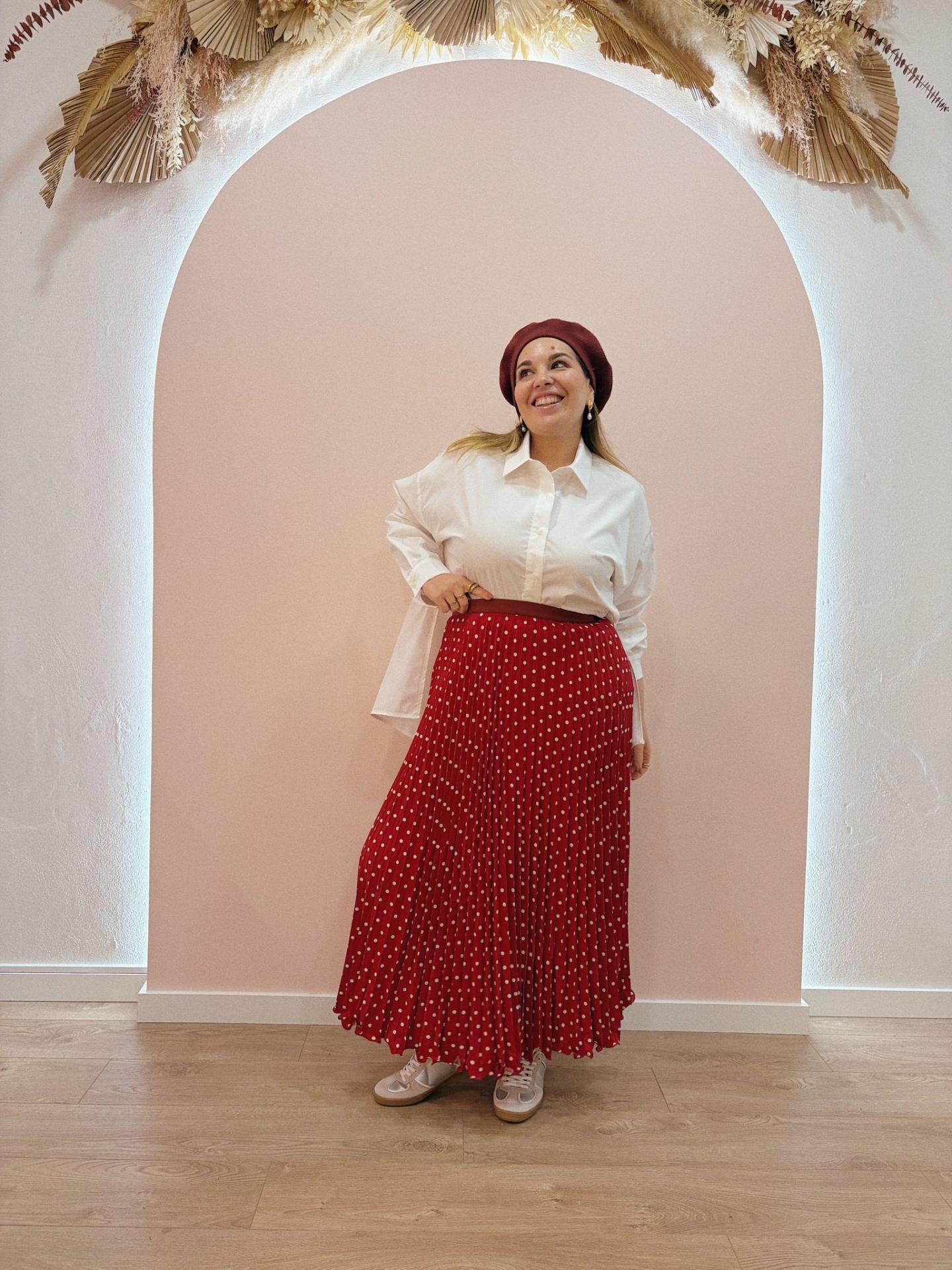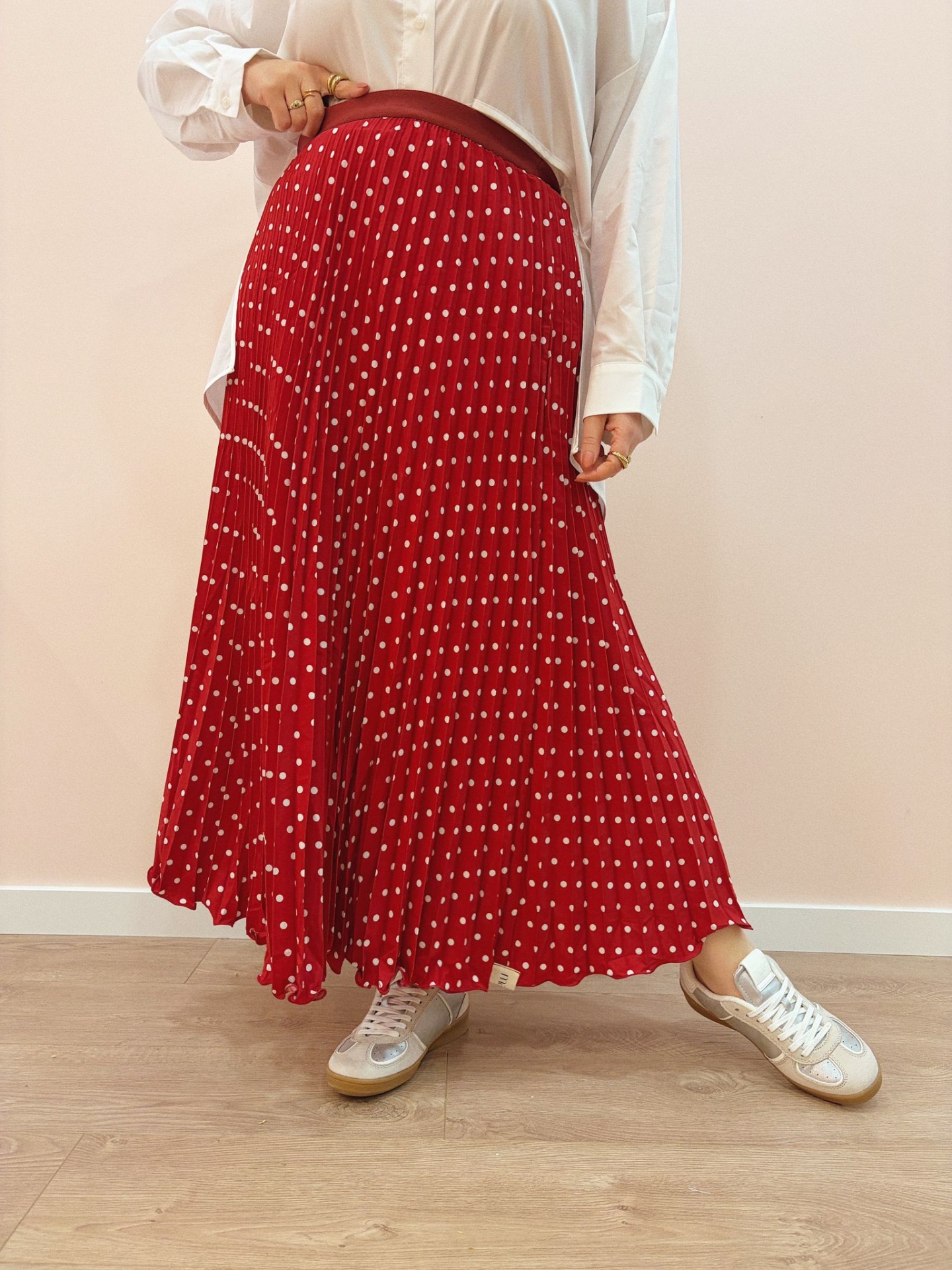 Saia midi vermelha plissada com padrão de bolinhas (polka dots) em branco.