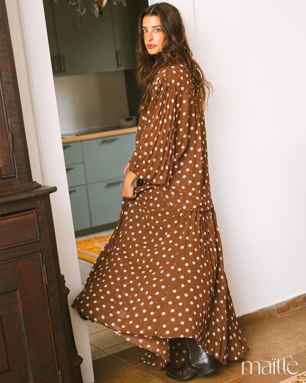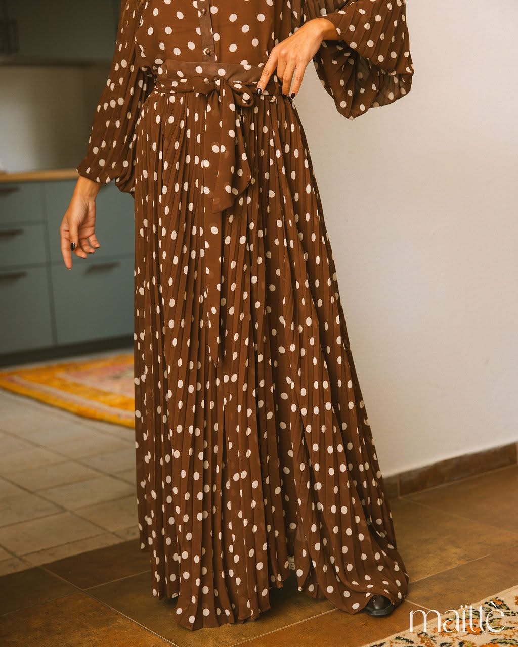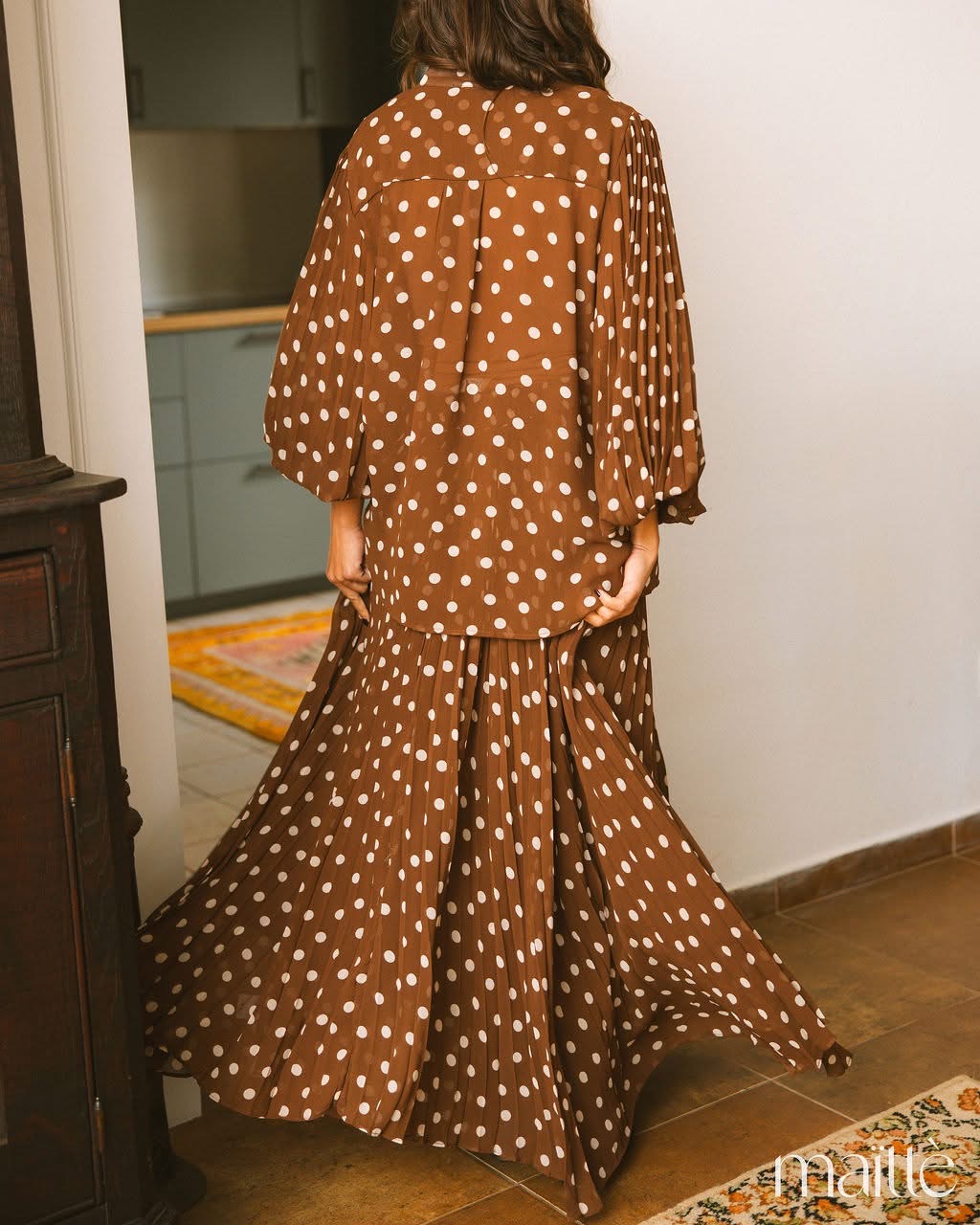 Saia comprida num tecido leve e suave (estilo chiffon) com padrão polka dots/bolinhas em crú.