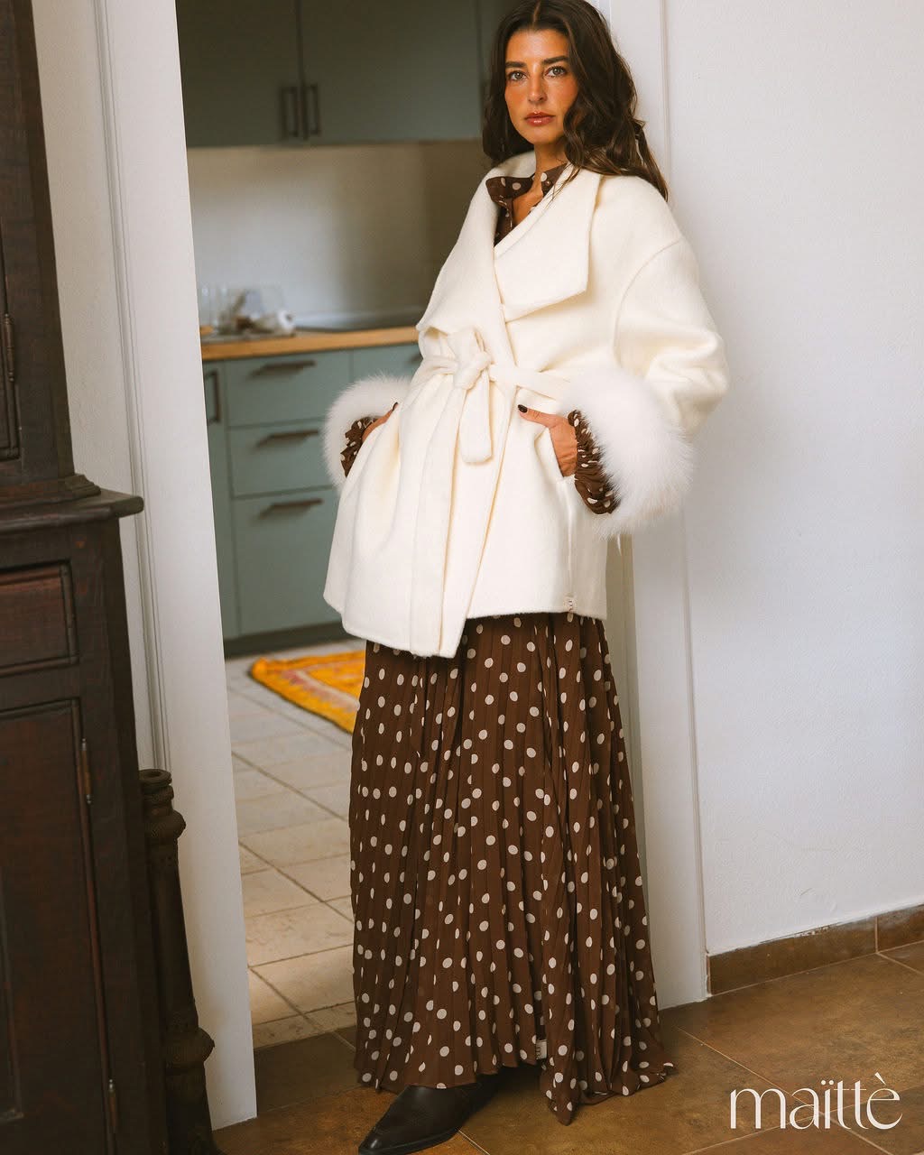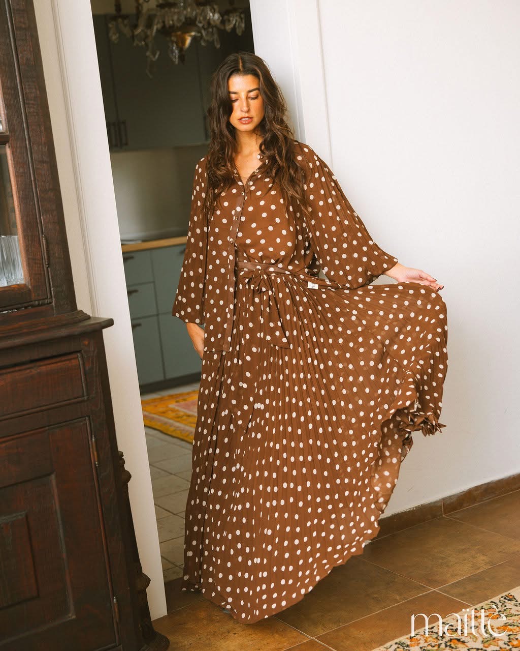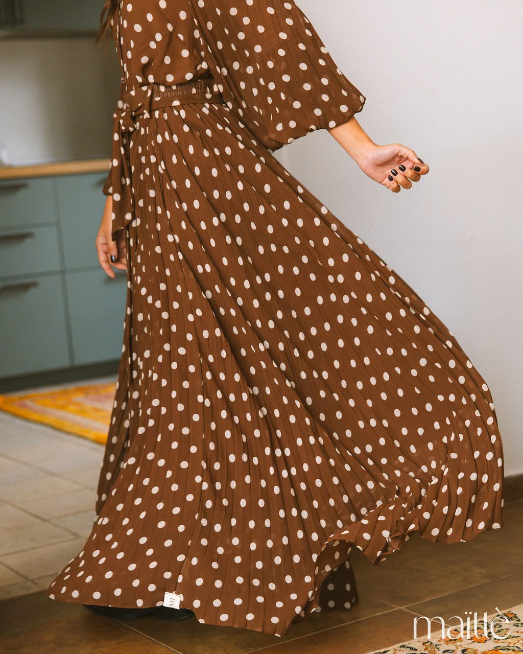 Saia comprida num tecido leve e suave (estilo chiffon) com padrão polka dots/bolinhas em crú.