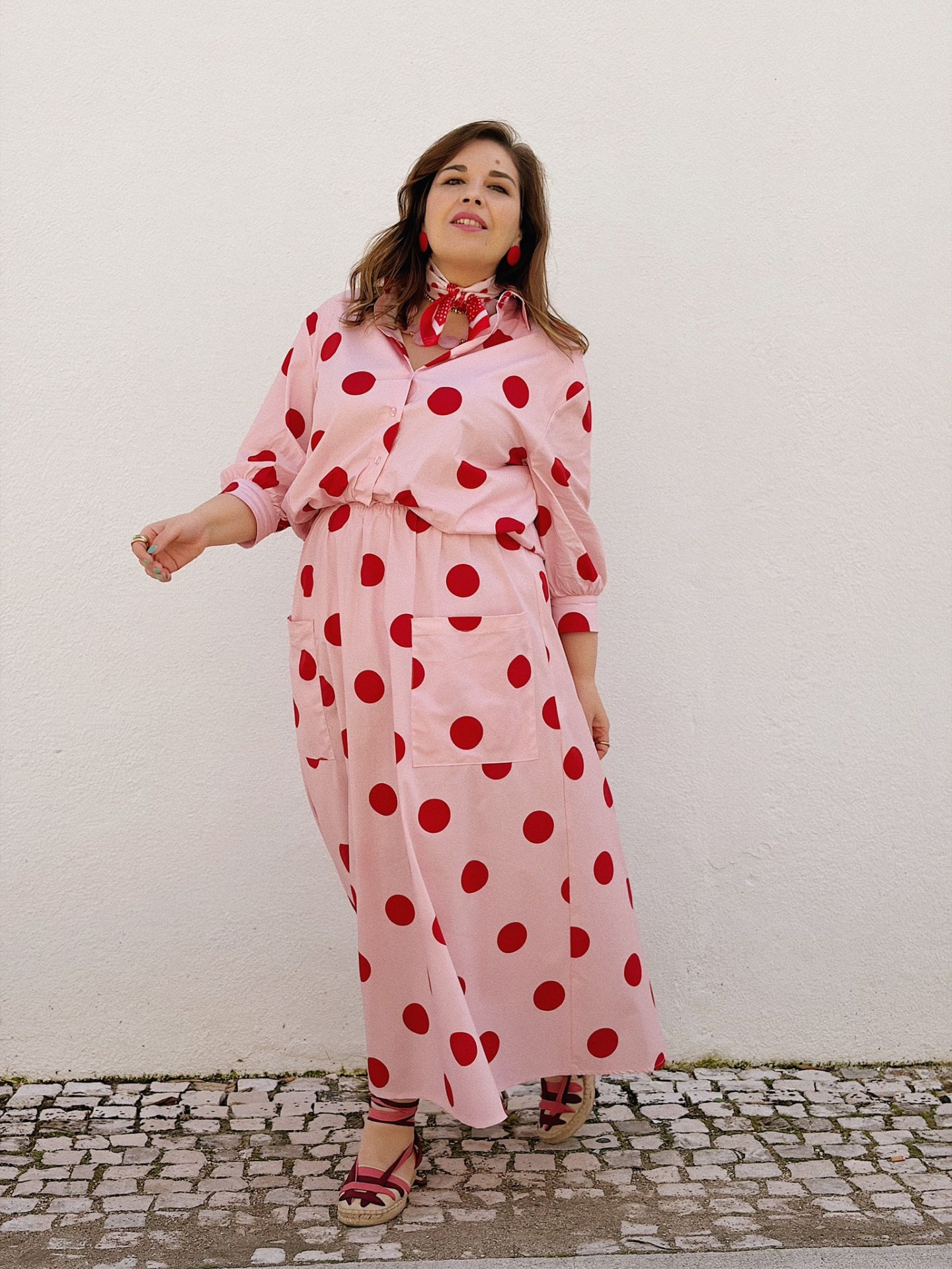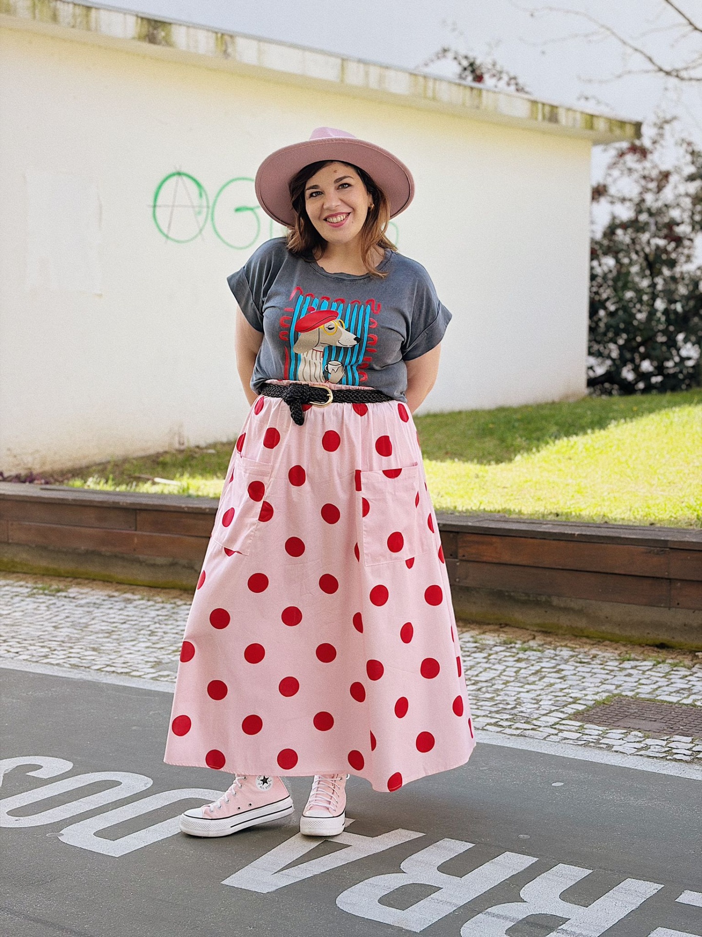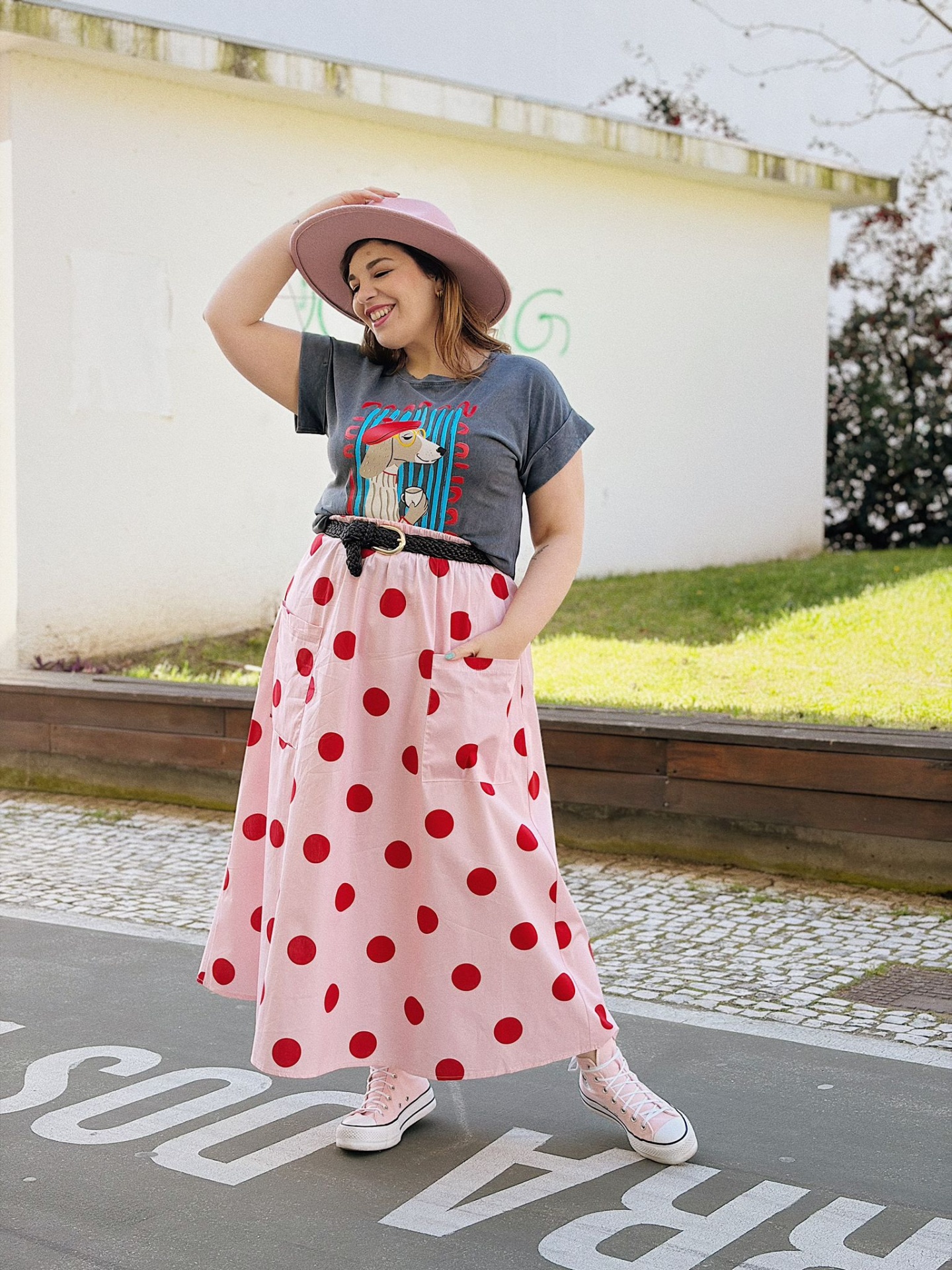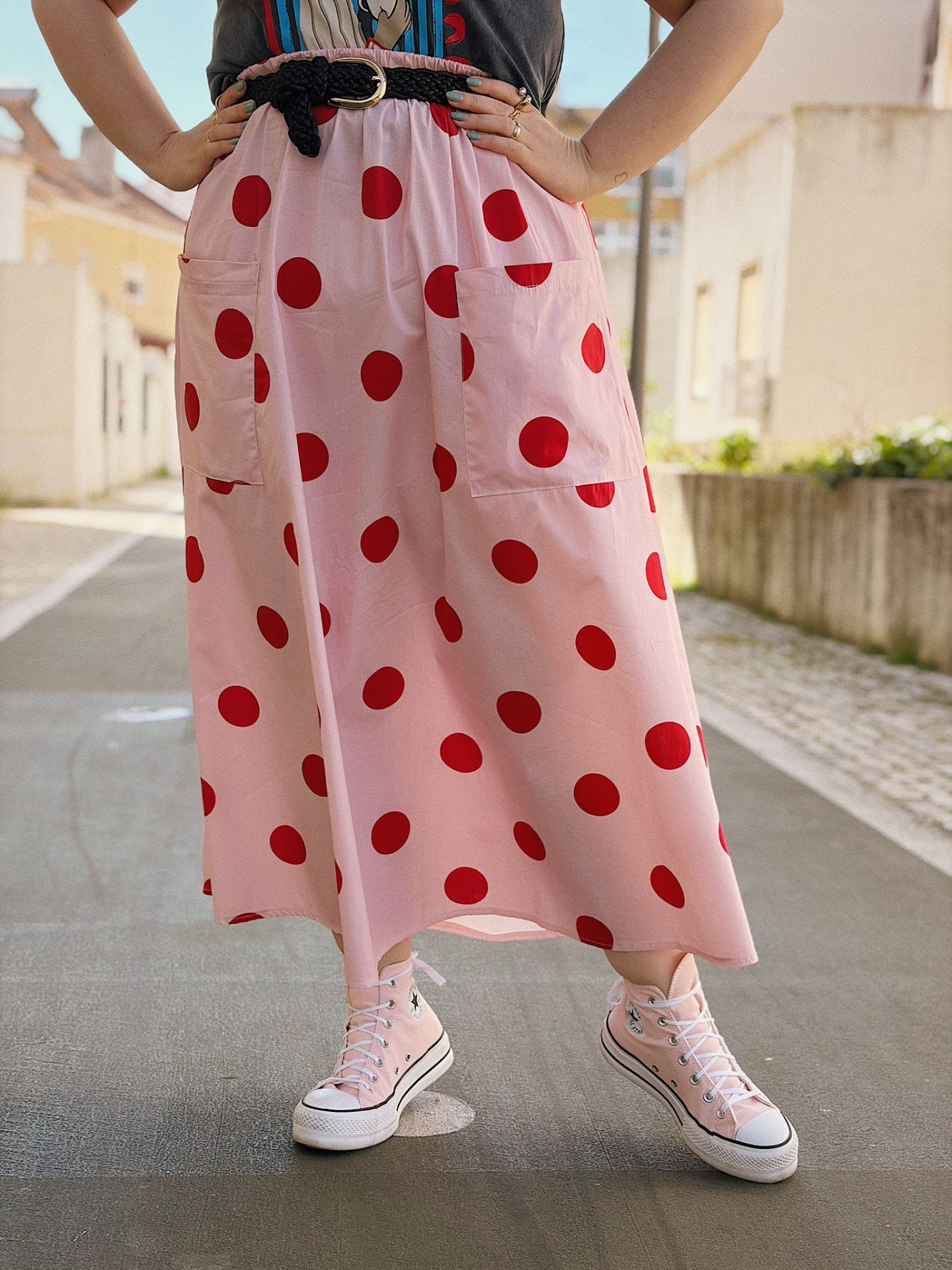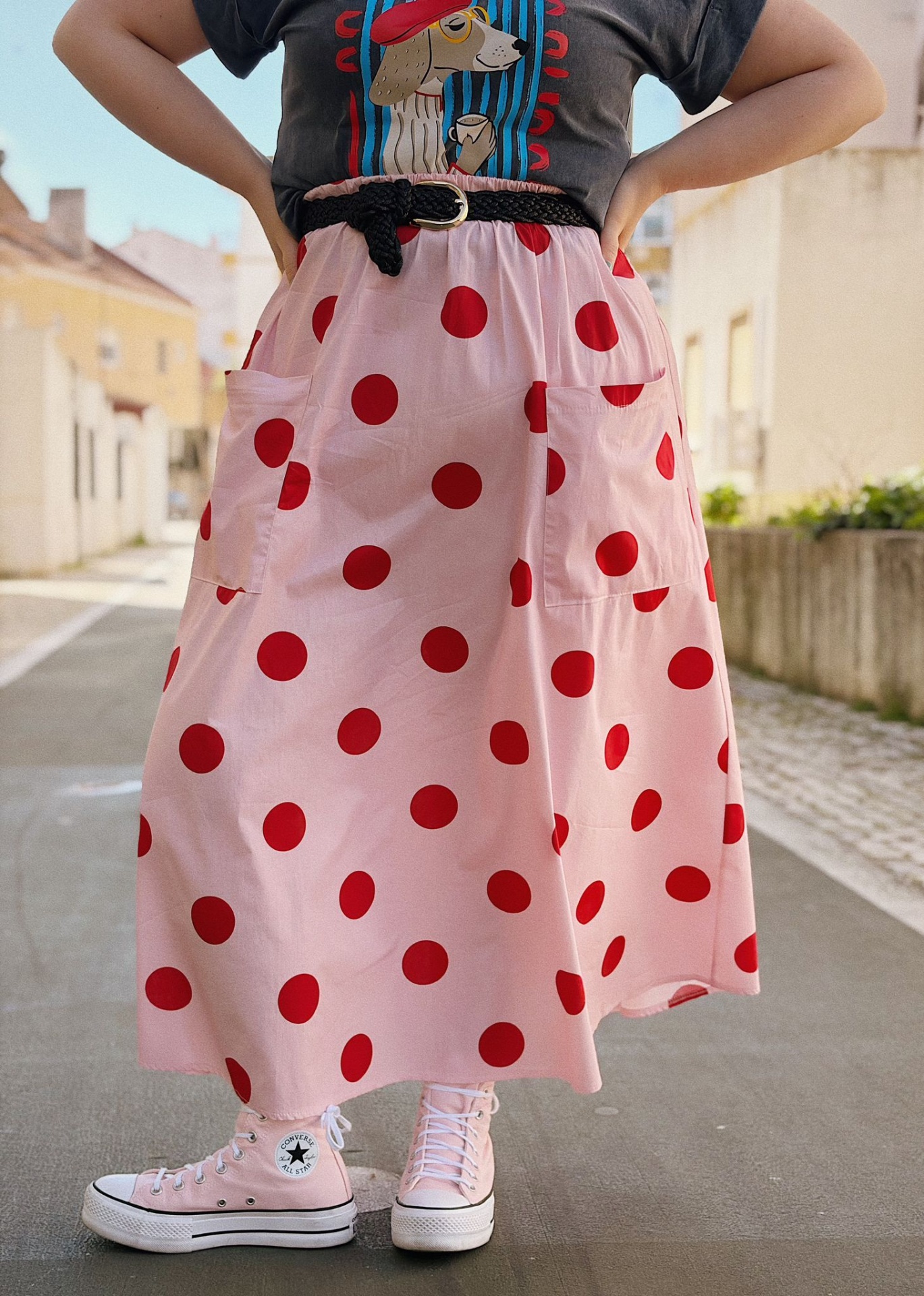 Saia de algodão em fundo rosa com padrão polka dots vermelho (bolinhas).