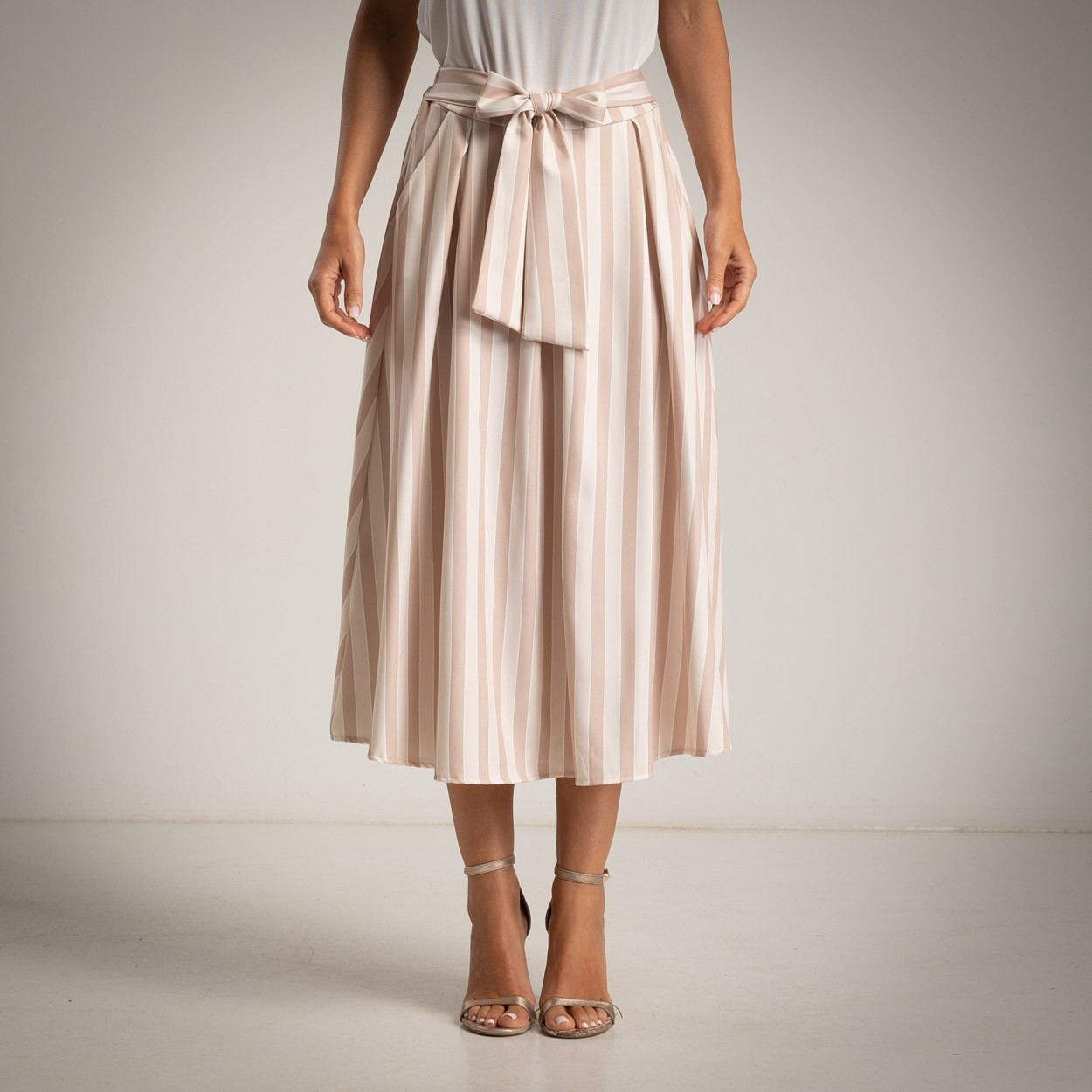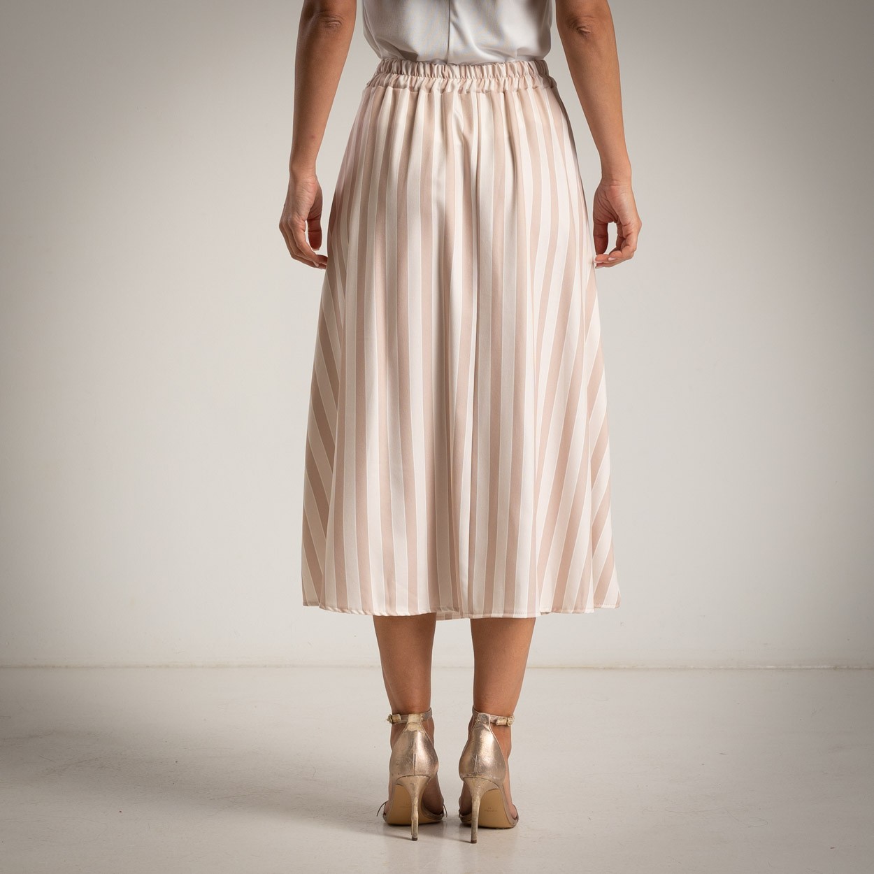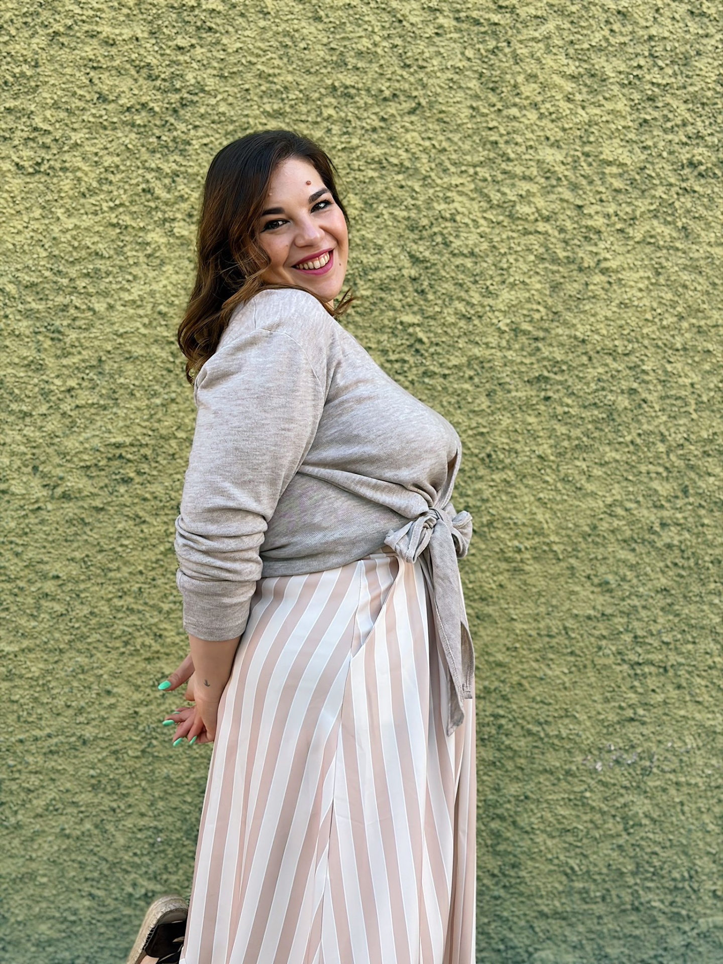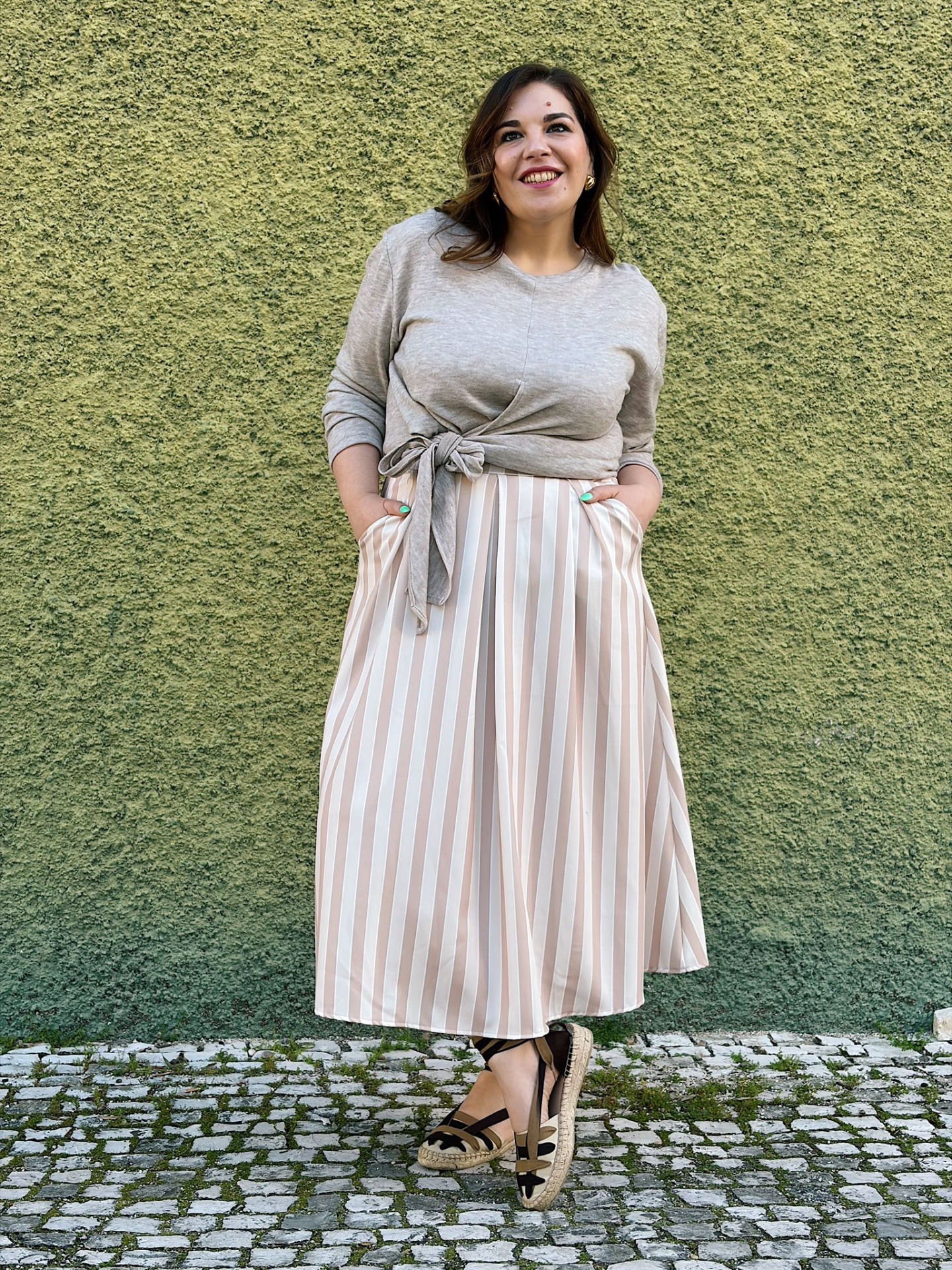 Efeito de laçada que pode ser usada a gosto. Cintura elástica atrás.