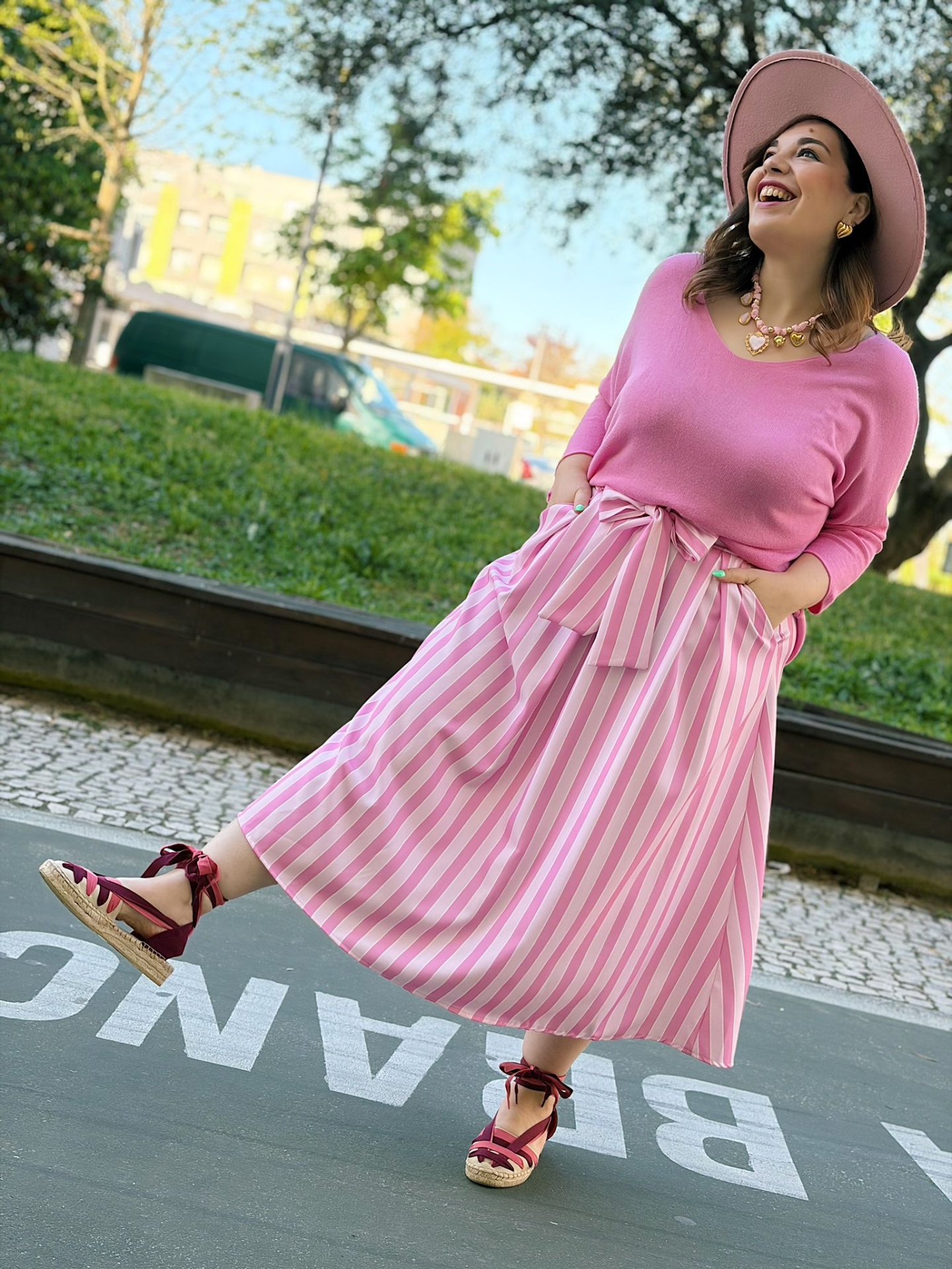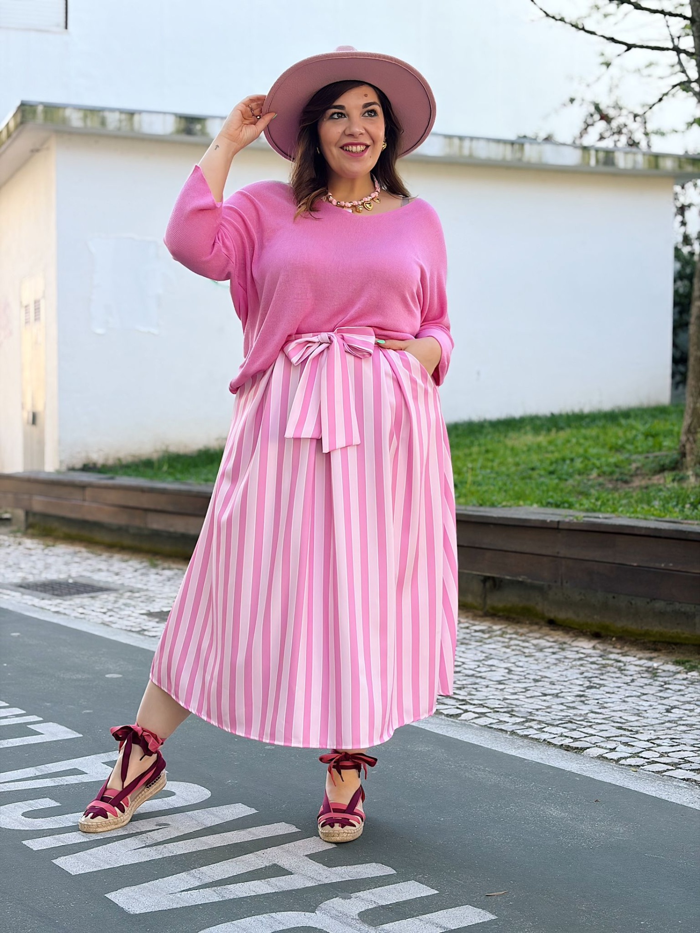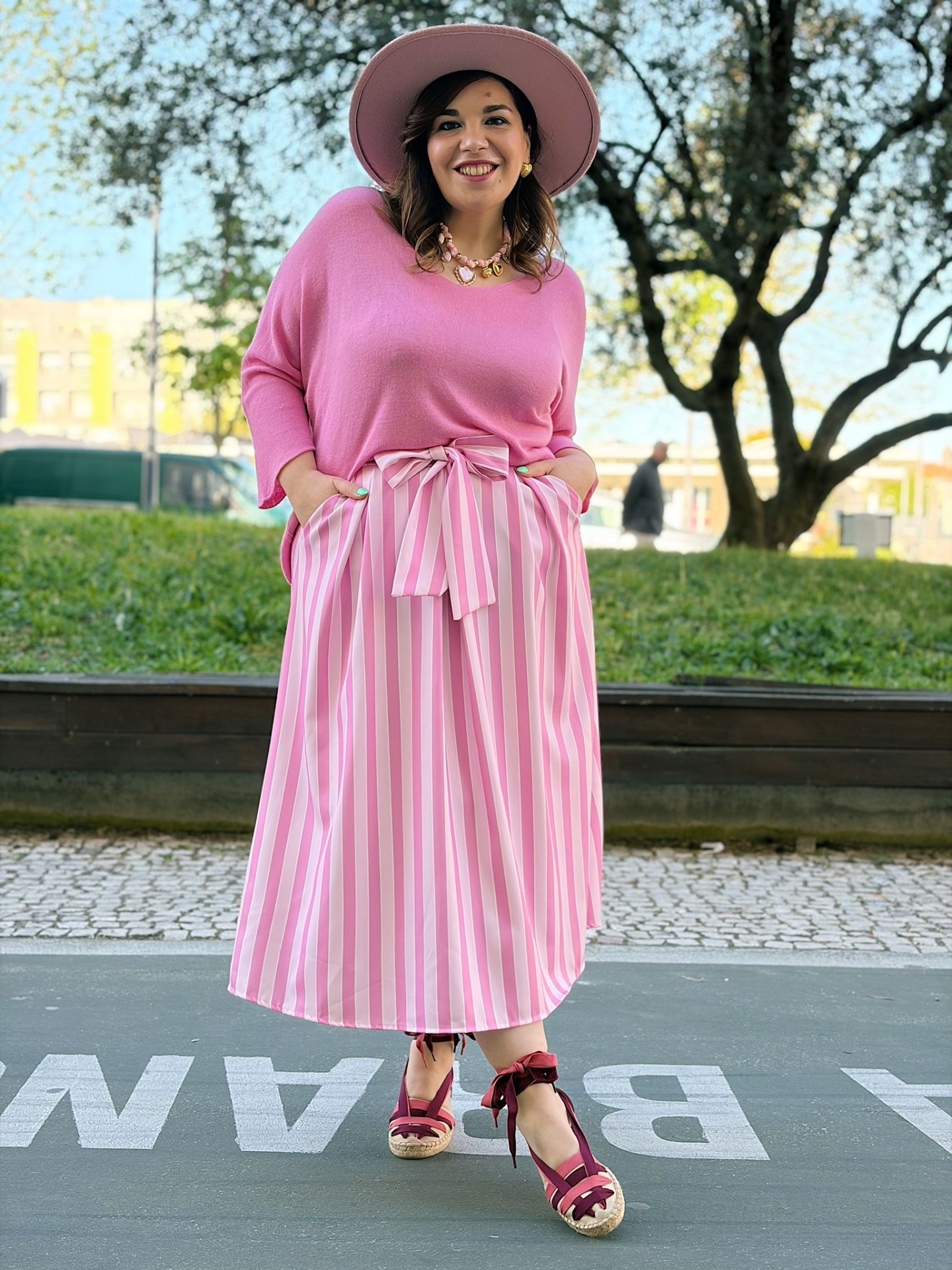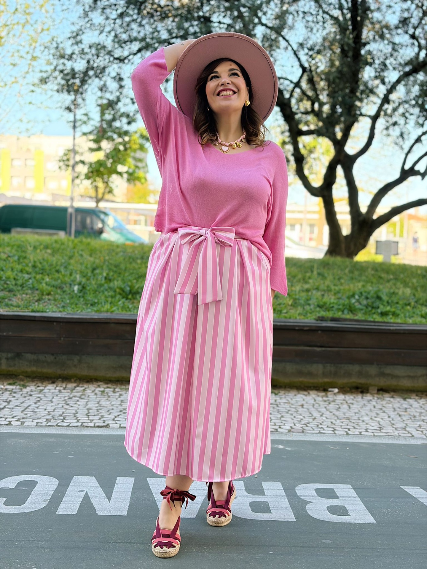 Efeito de laçada que pode ser usada a gosto. Cintura elástica atrás.