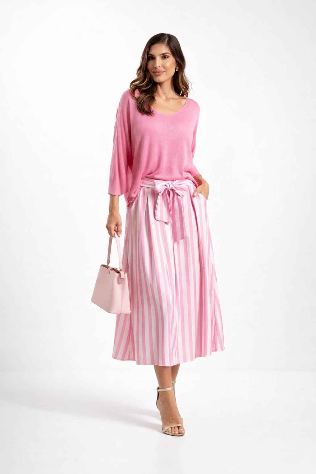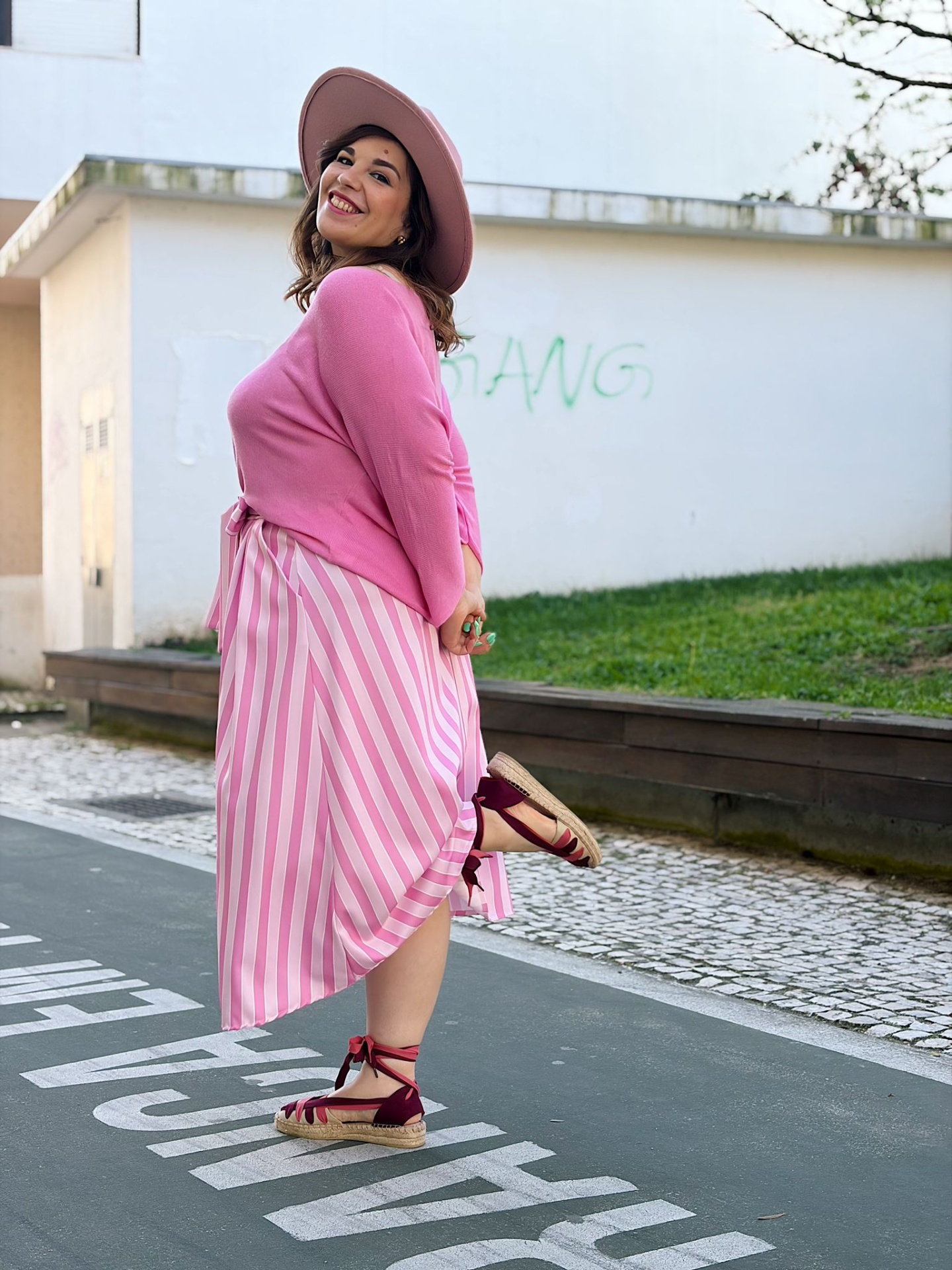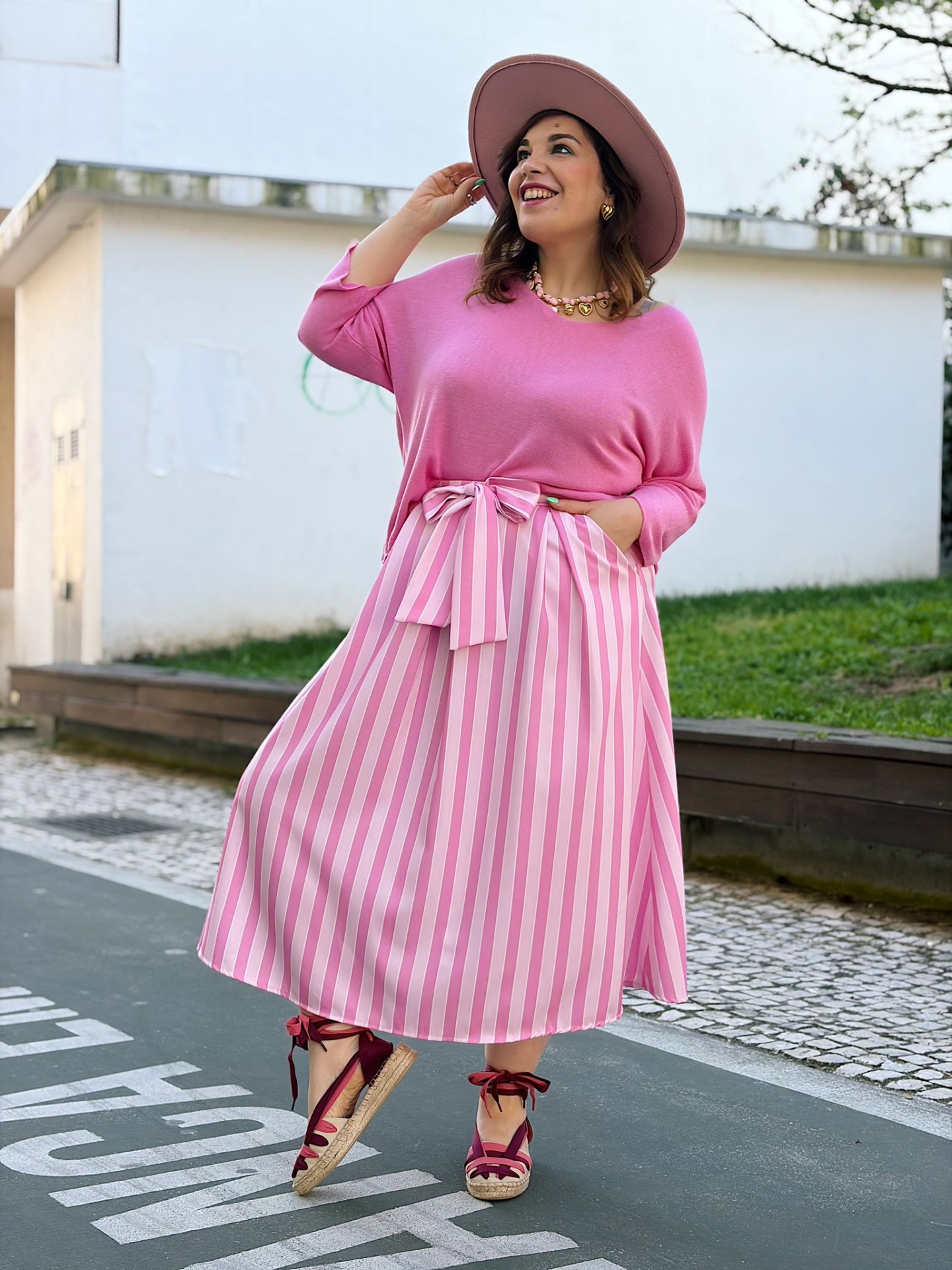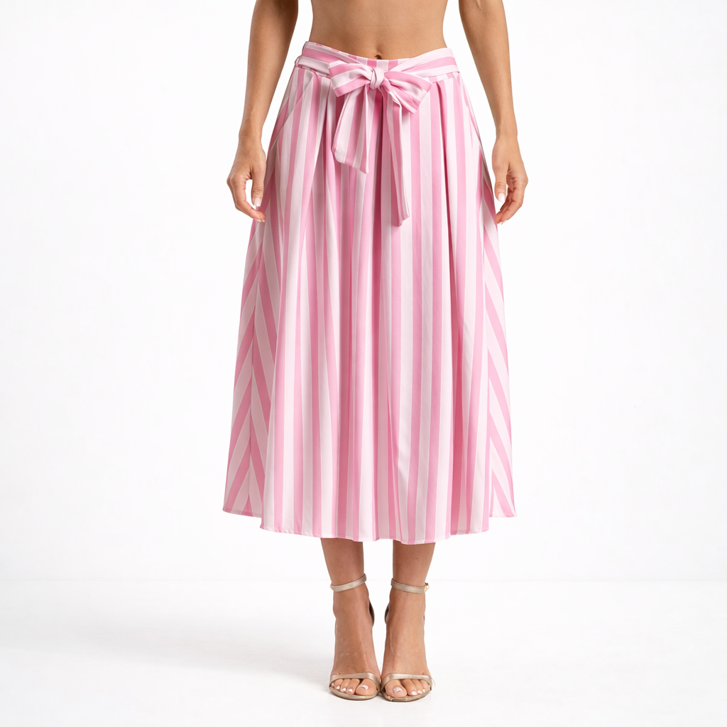 Efeito de laçada que pode ser usada a gosto. Cintura elástica atrás.