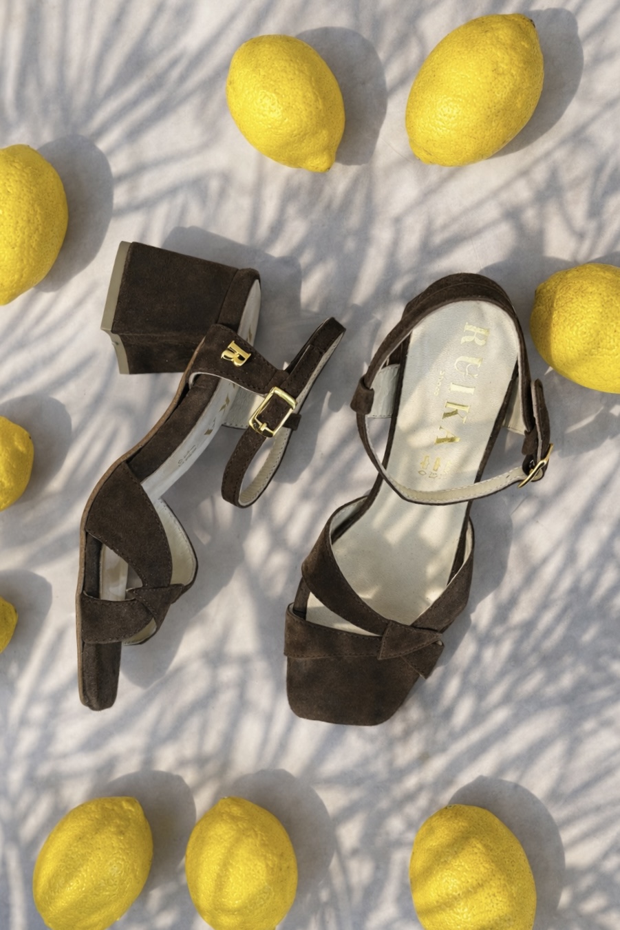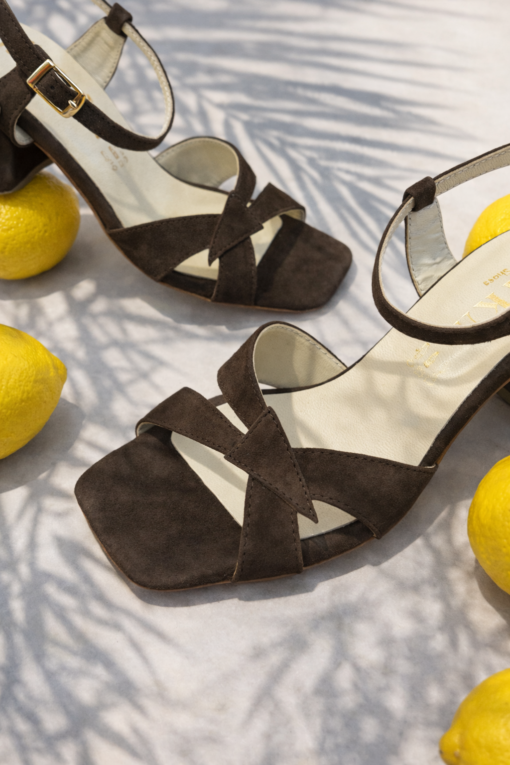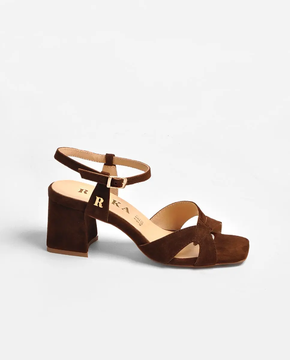 Sandálias de camurça castanhas (chocolate) com efeito de tiras assimétricas à frente.