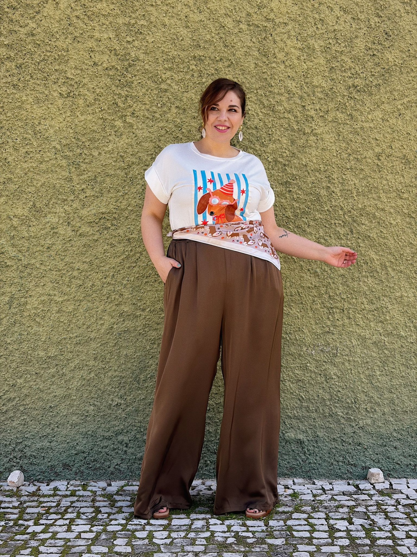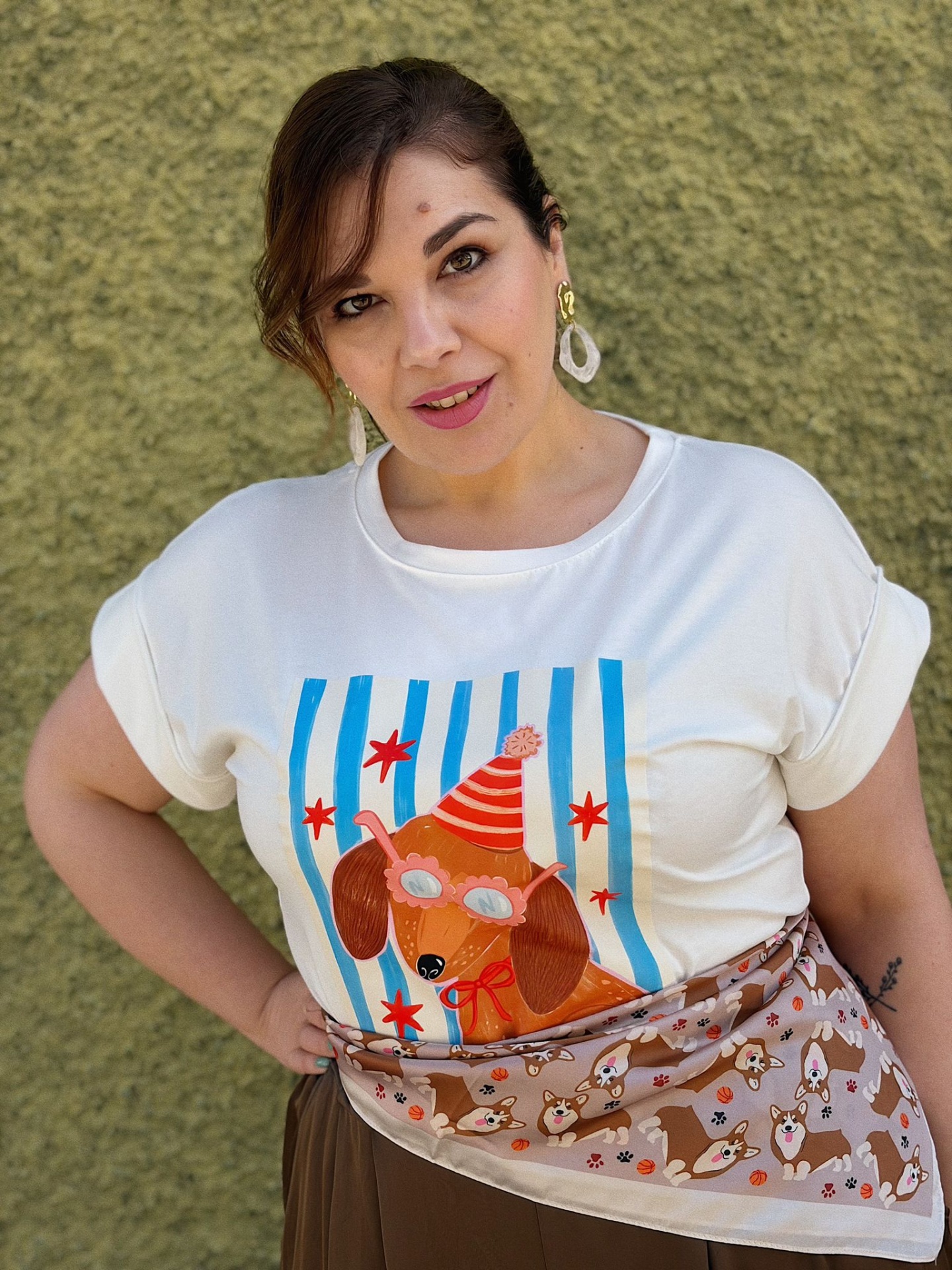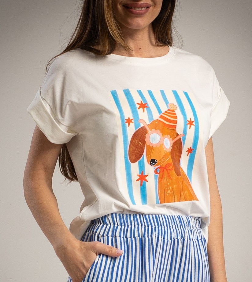 T-shirt de algodão com estampa divertida de cão com óculos e chapéu.