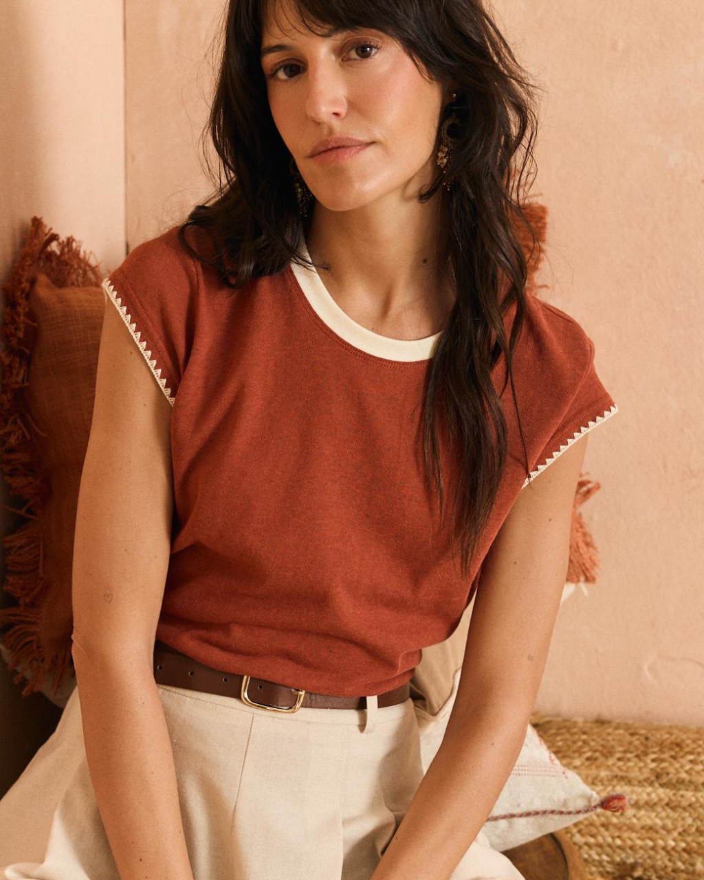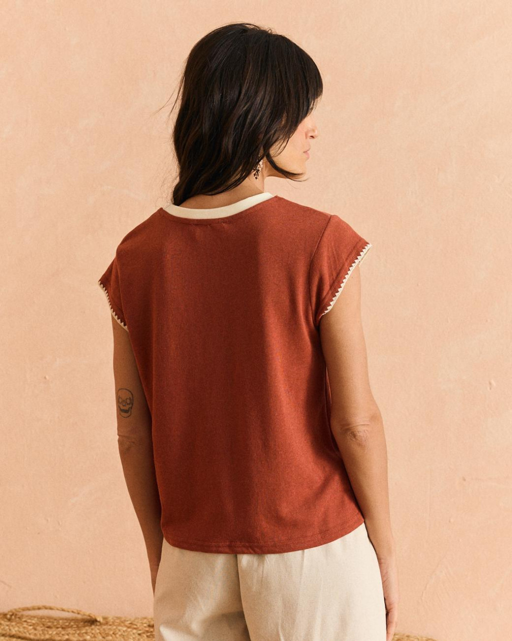 T-shirt de algodão em tom terracota com bordados em contraste.