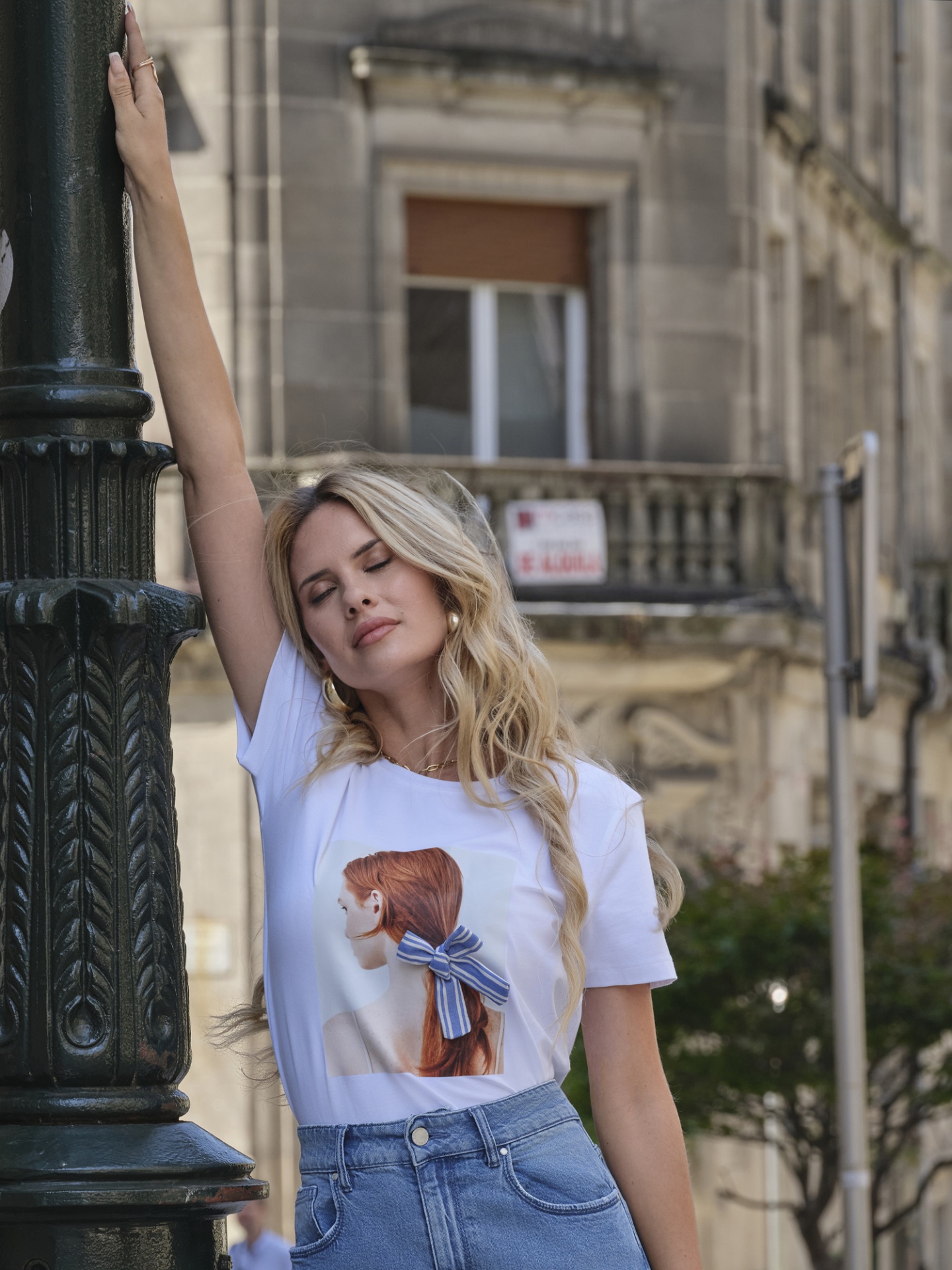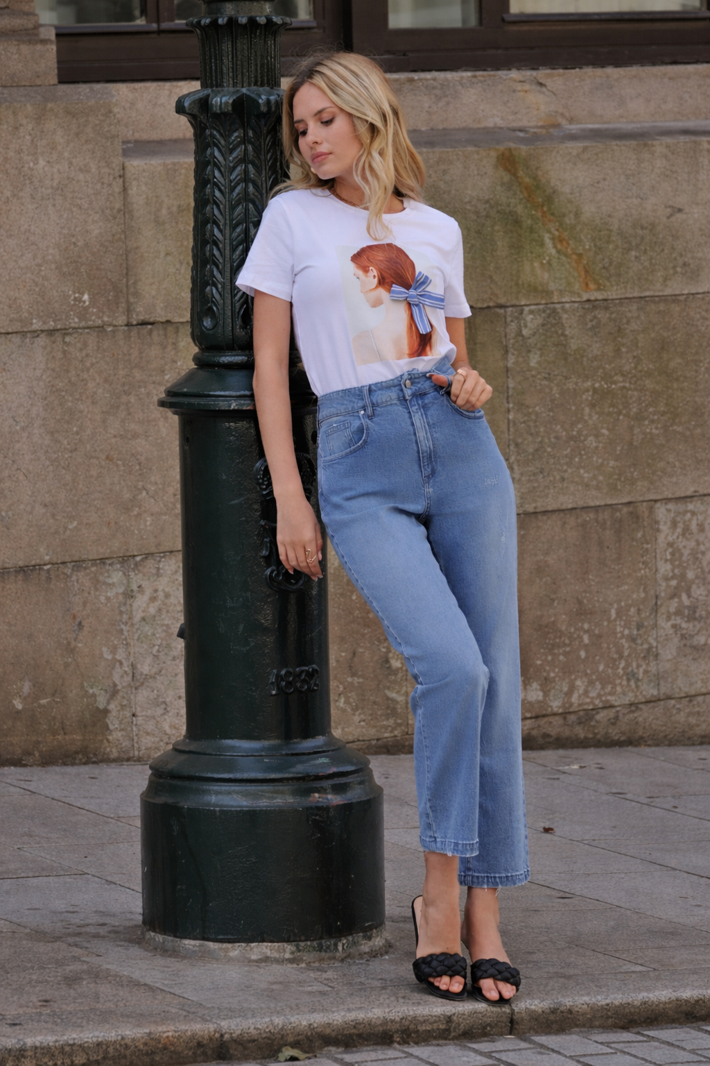 T-shirt branca de algodão macio e confortável com estampa de Mulher á frente com laçada de riscas em relevo.