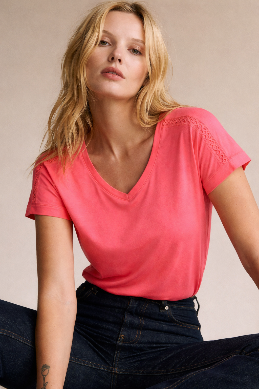Decote em V com mangas curtas e efeito de renda nos ombros.