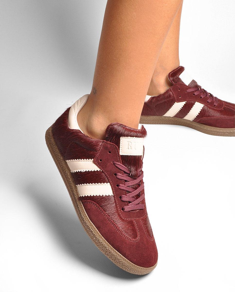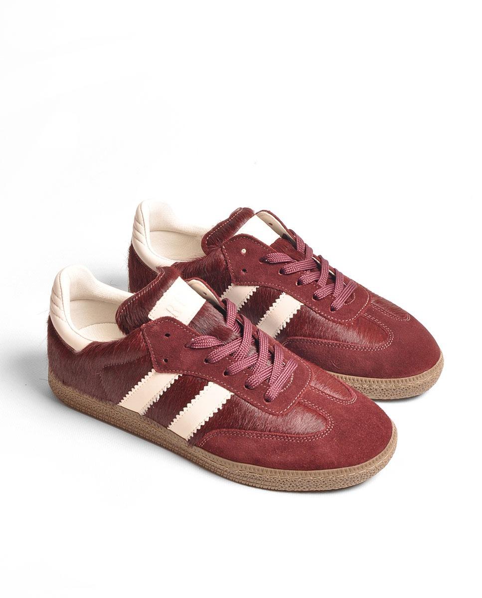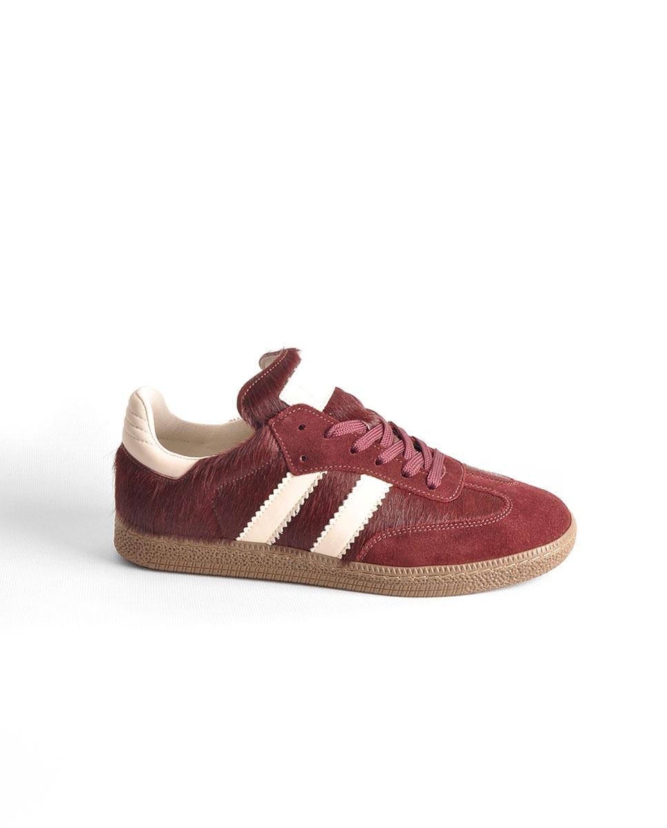 Tênis em pele (camurça) bordeaux escura com pêlo (pele) na mesma cor.
