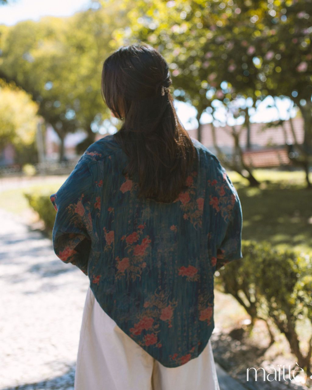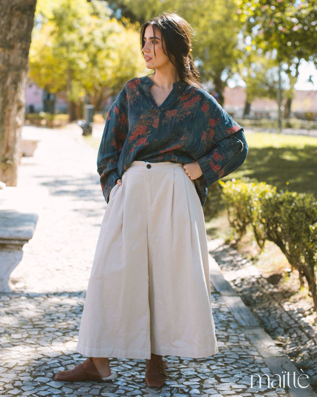 Túnica de algodão com padrão tie-dye em tons de azul e flores em tons de vermelho/bordeaux.
