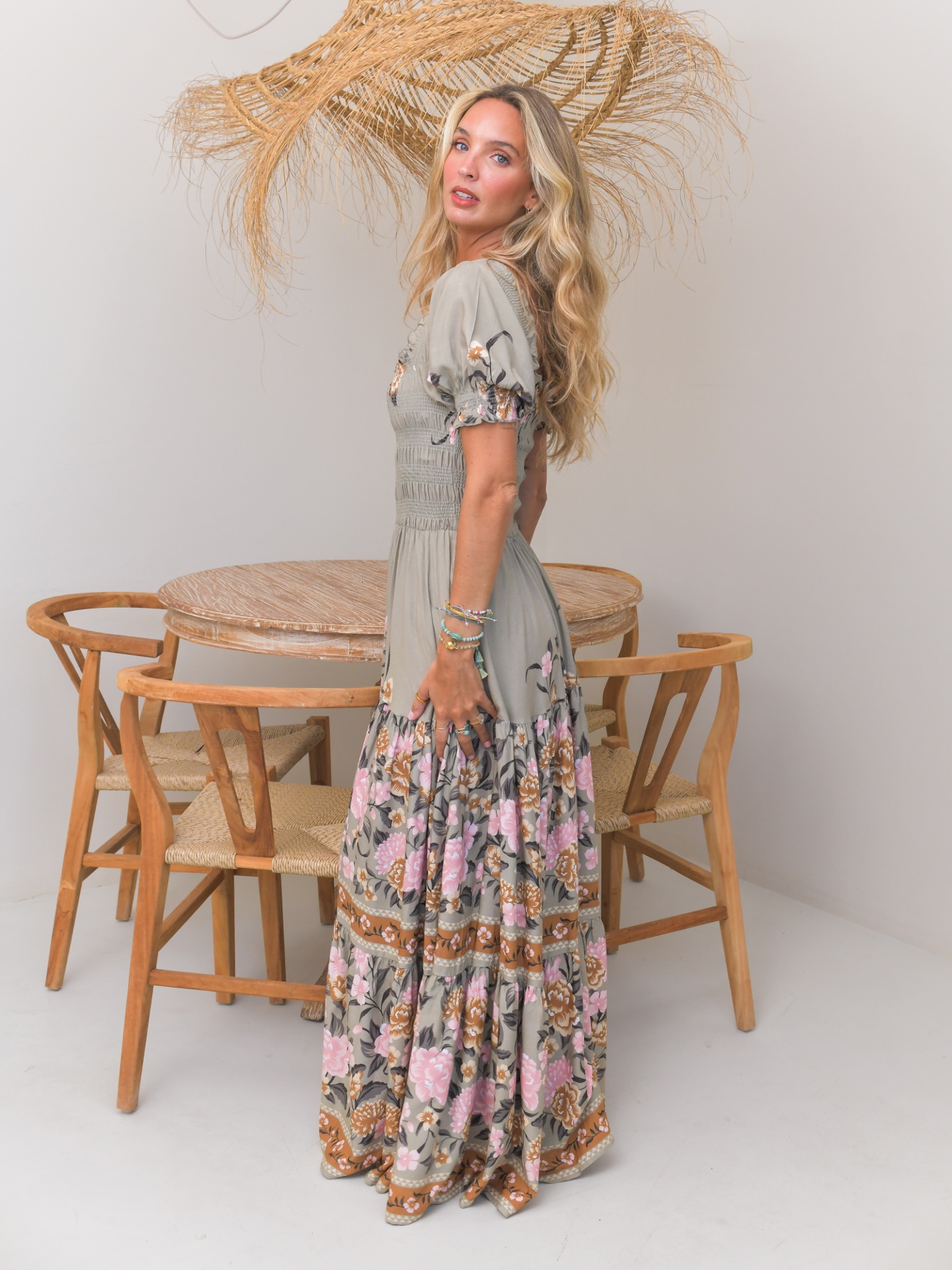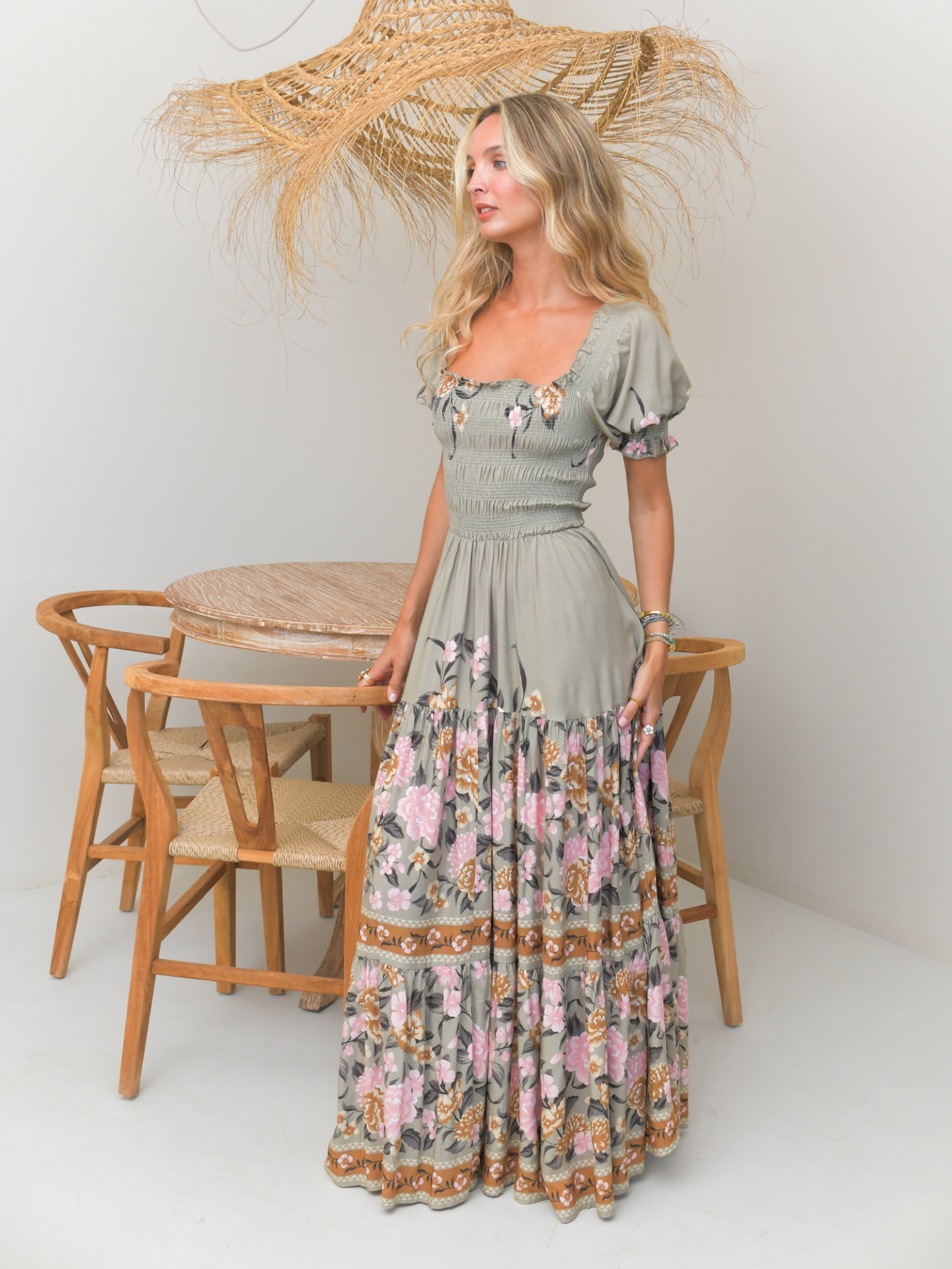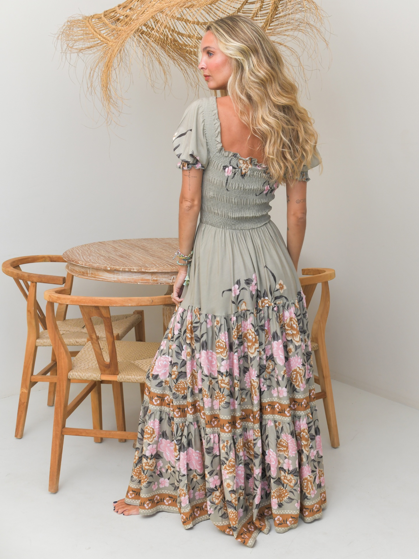 Vestido comprido romântico com padrão floral delicado em tons de verde e rosa.