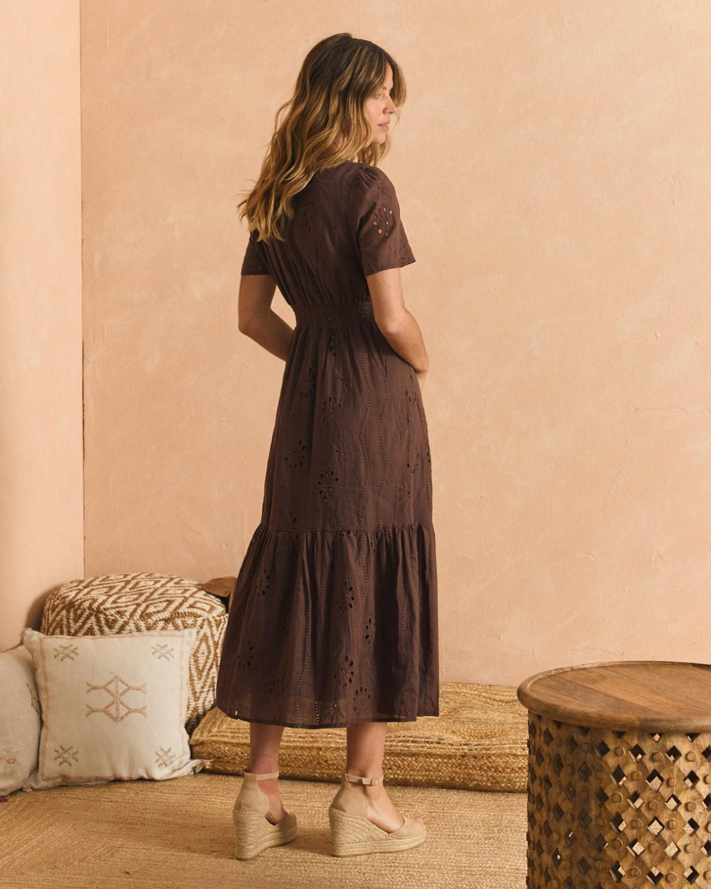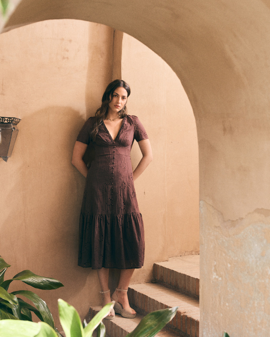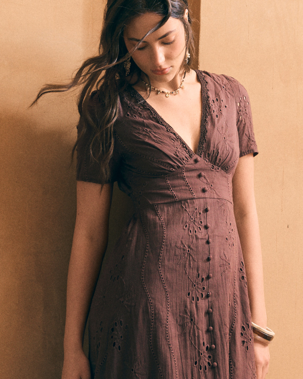 Vestido de comprimento midi em algodão bordado na cor castanha.