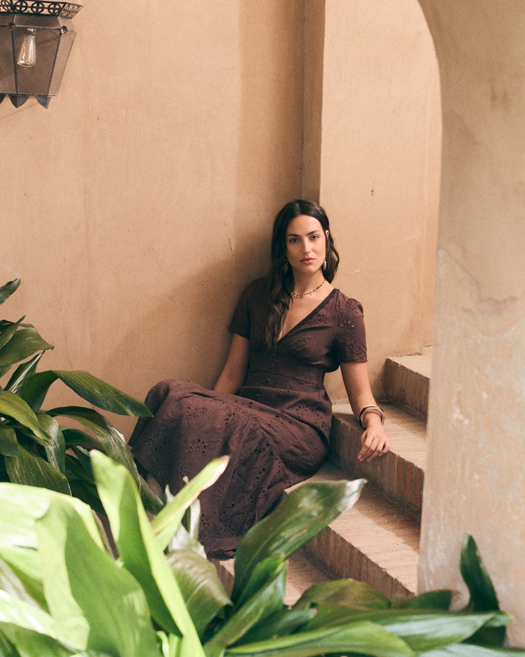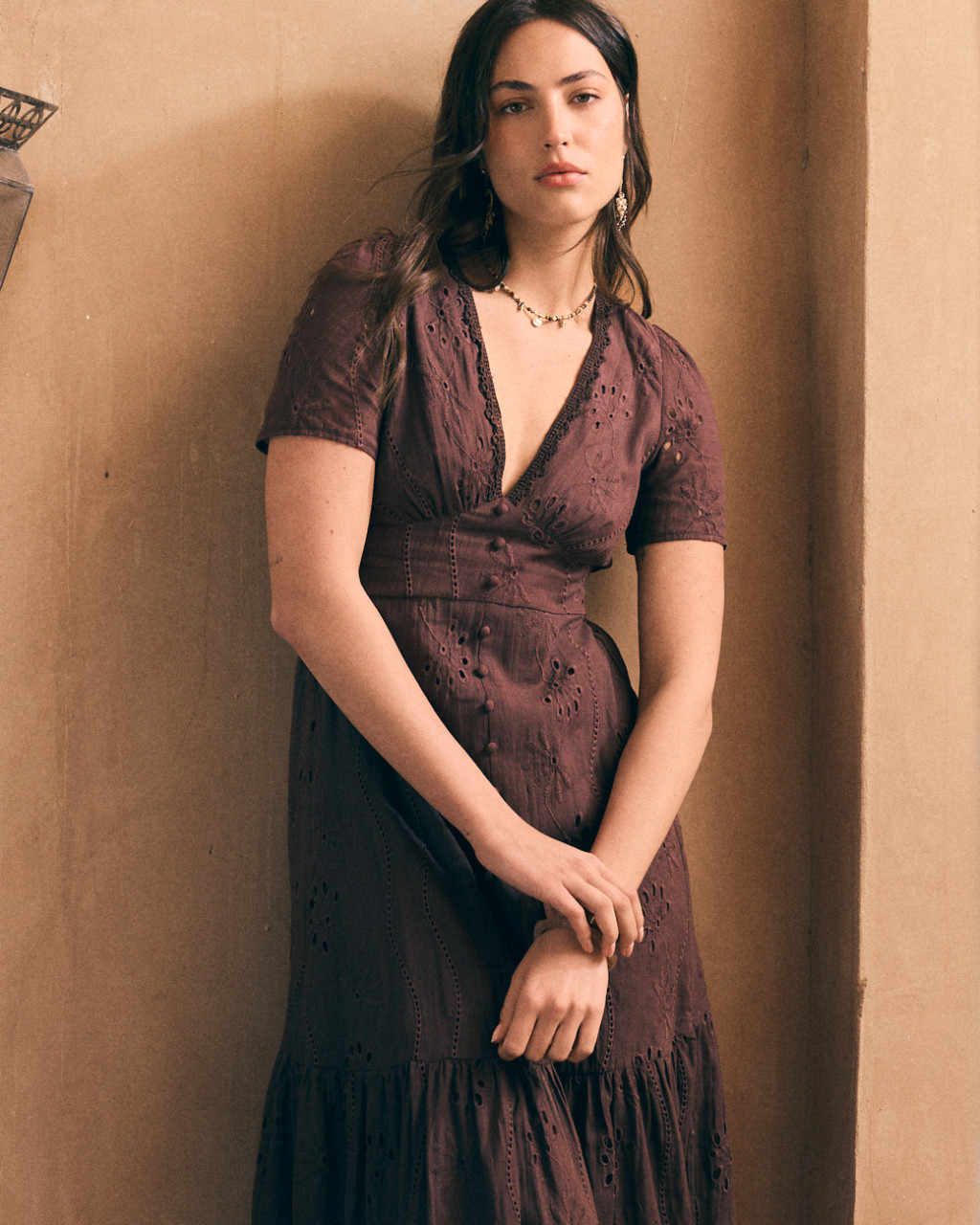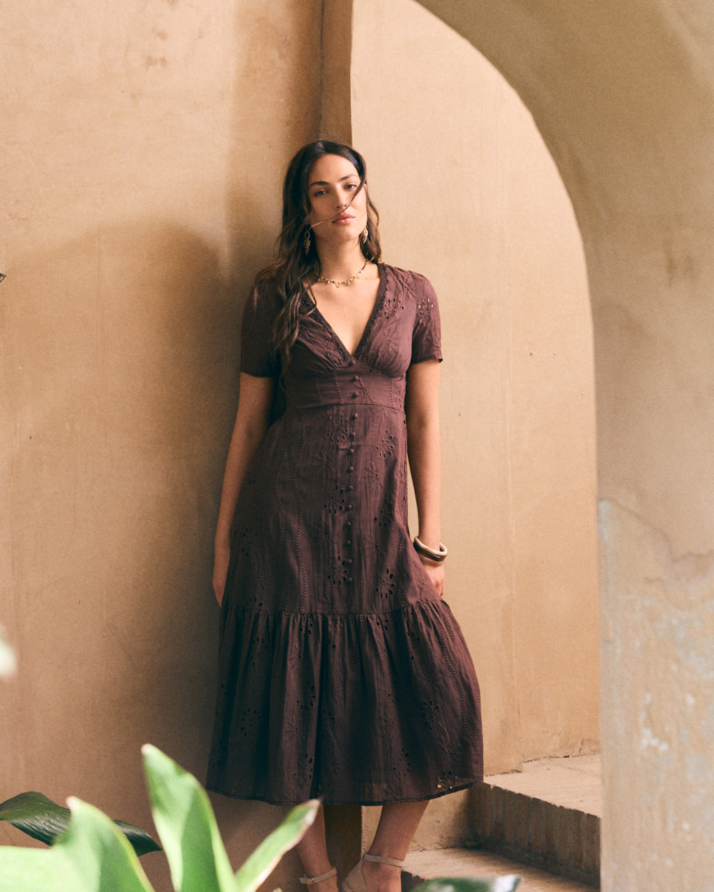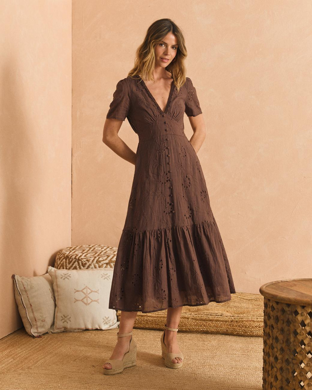 Vestido de comprimento midi em algodão bordado na cor castanha.