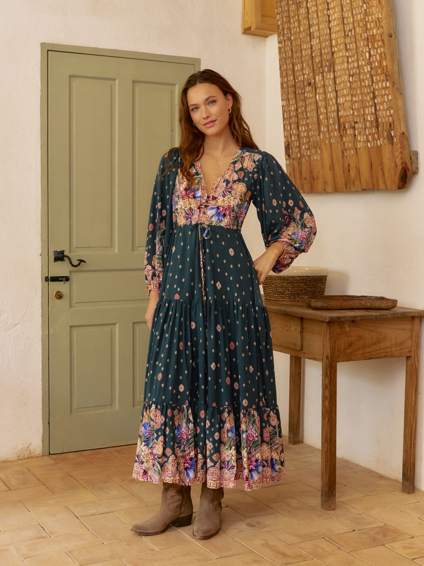 Vestido comprido de inspiração bohemia com padrão floral delicado.