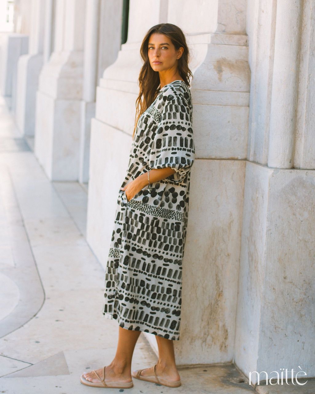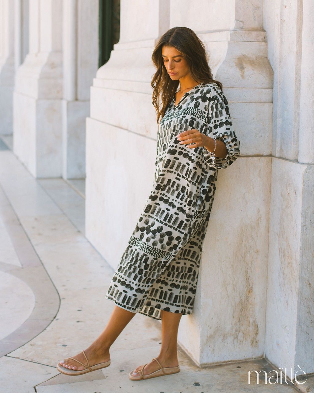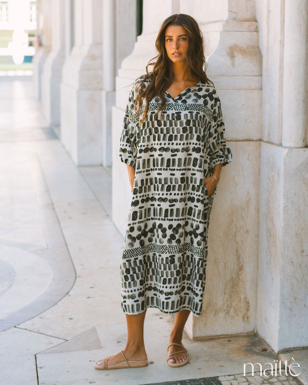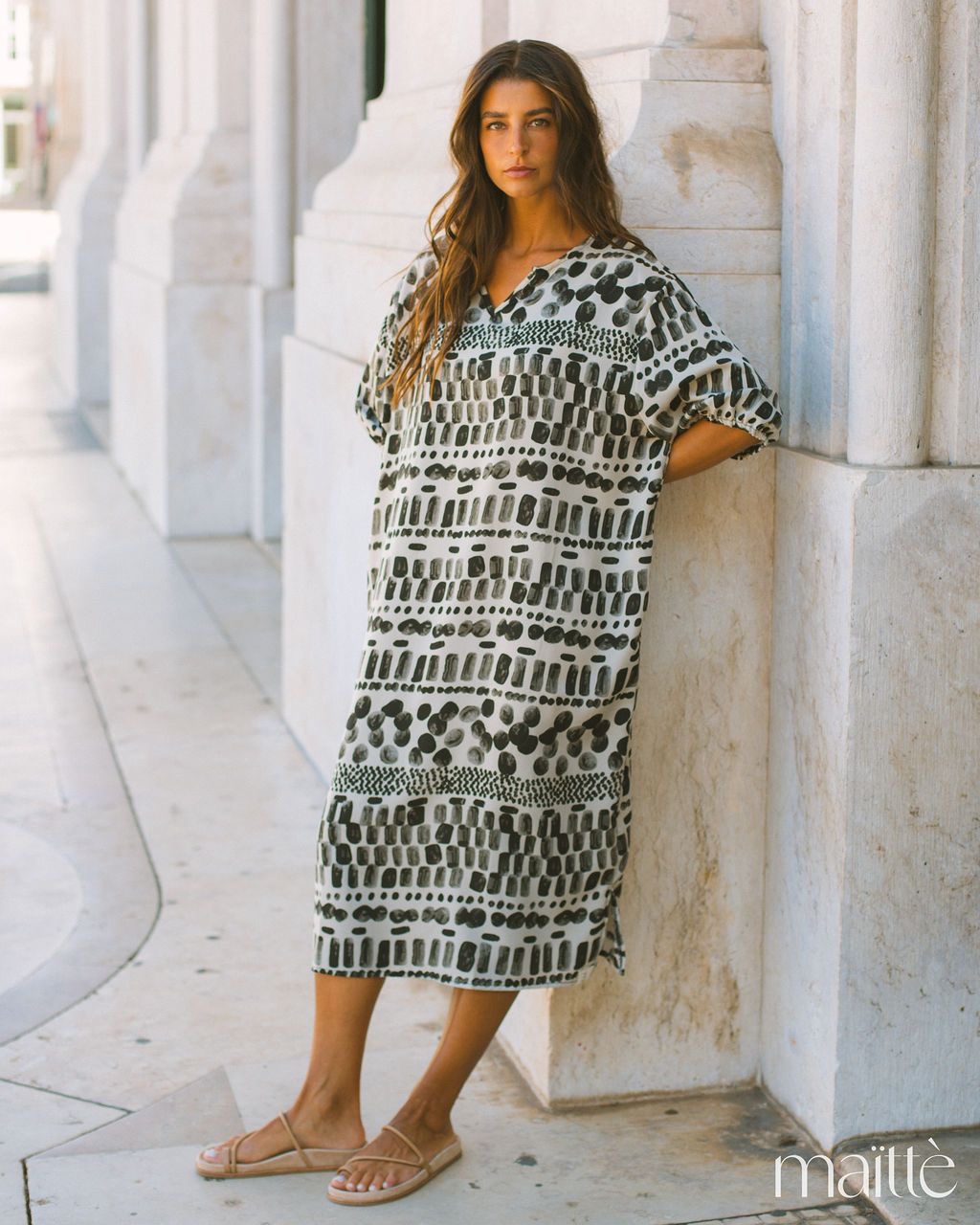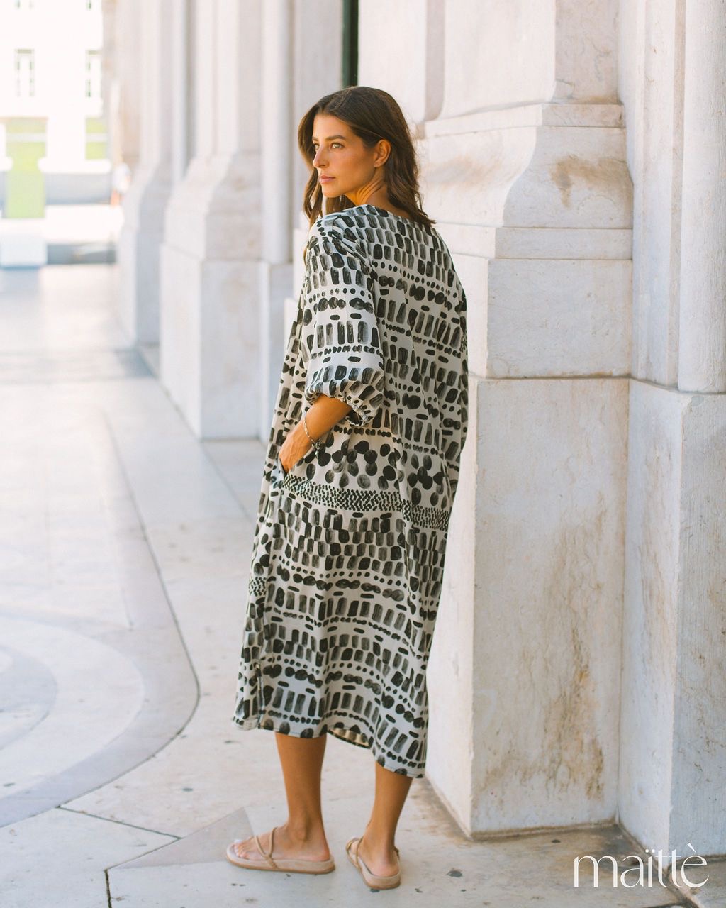 Vestido de comprimento midi com ajuste solto e corte recto.