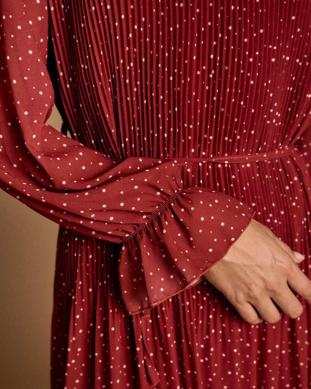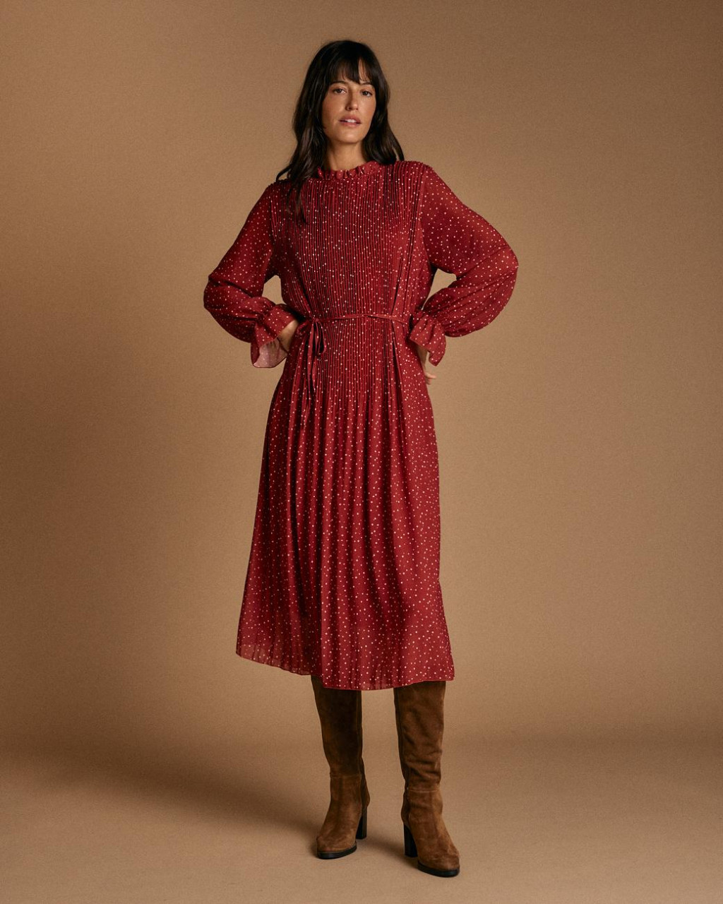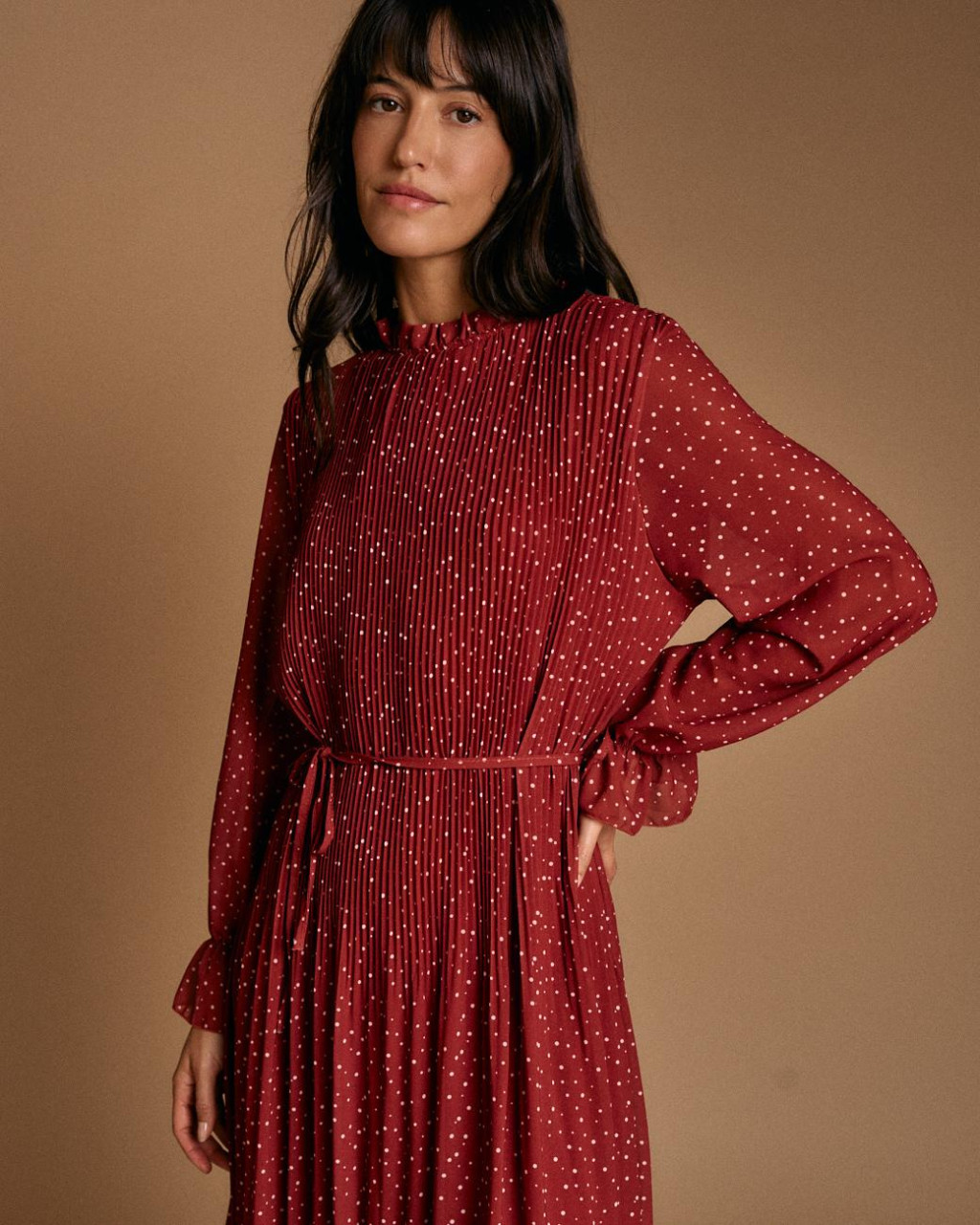 Vestido plissado num tecido fluído e leve com efeito plissado.