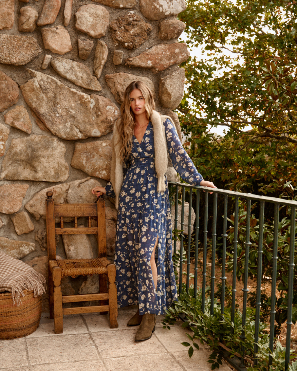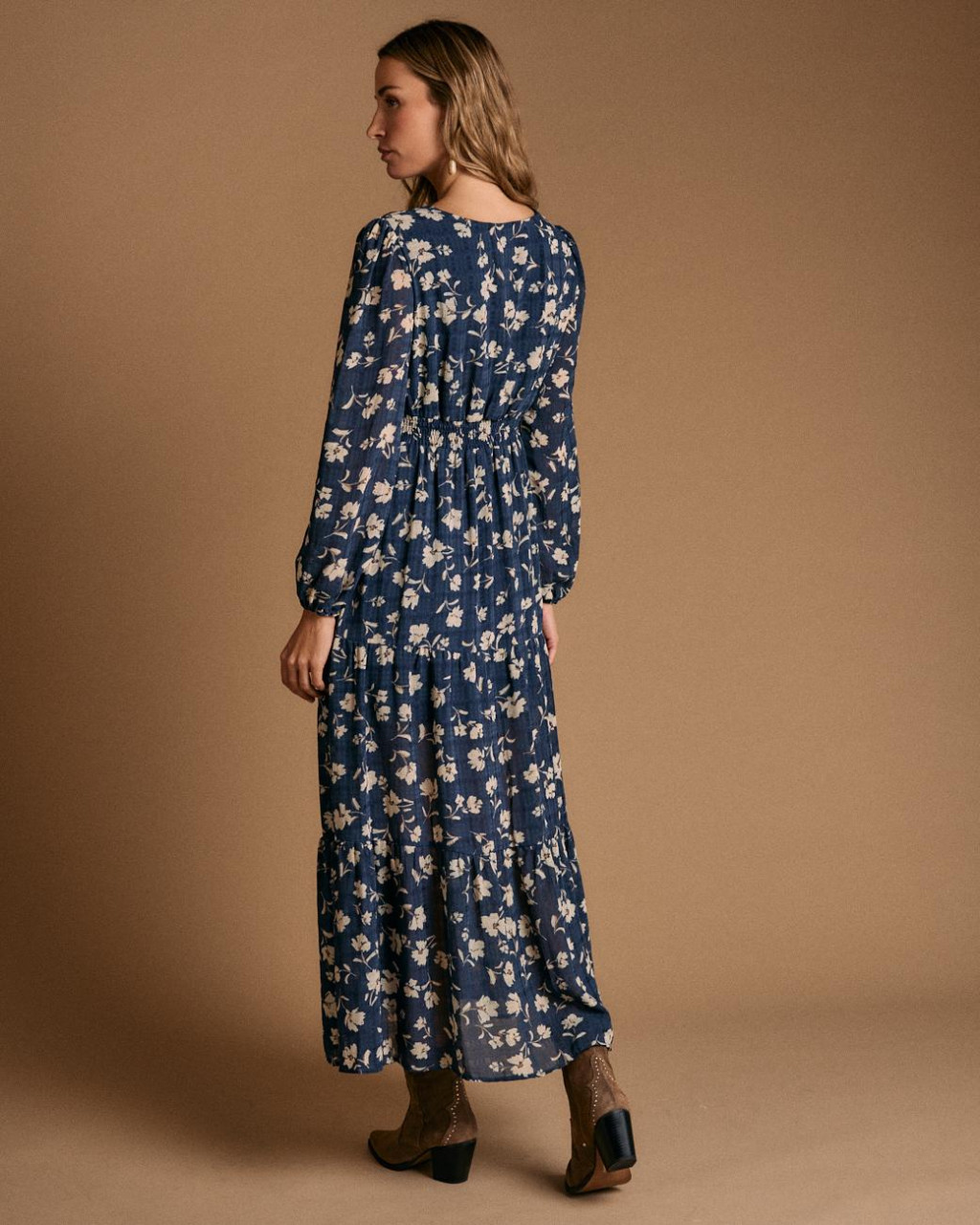 Vestido comprido em fundo azul com padrão floral delicado.