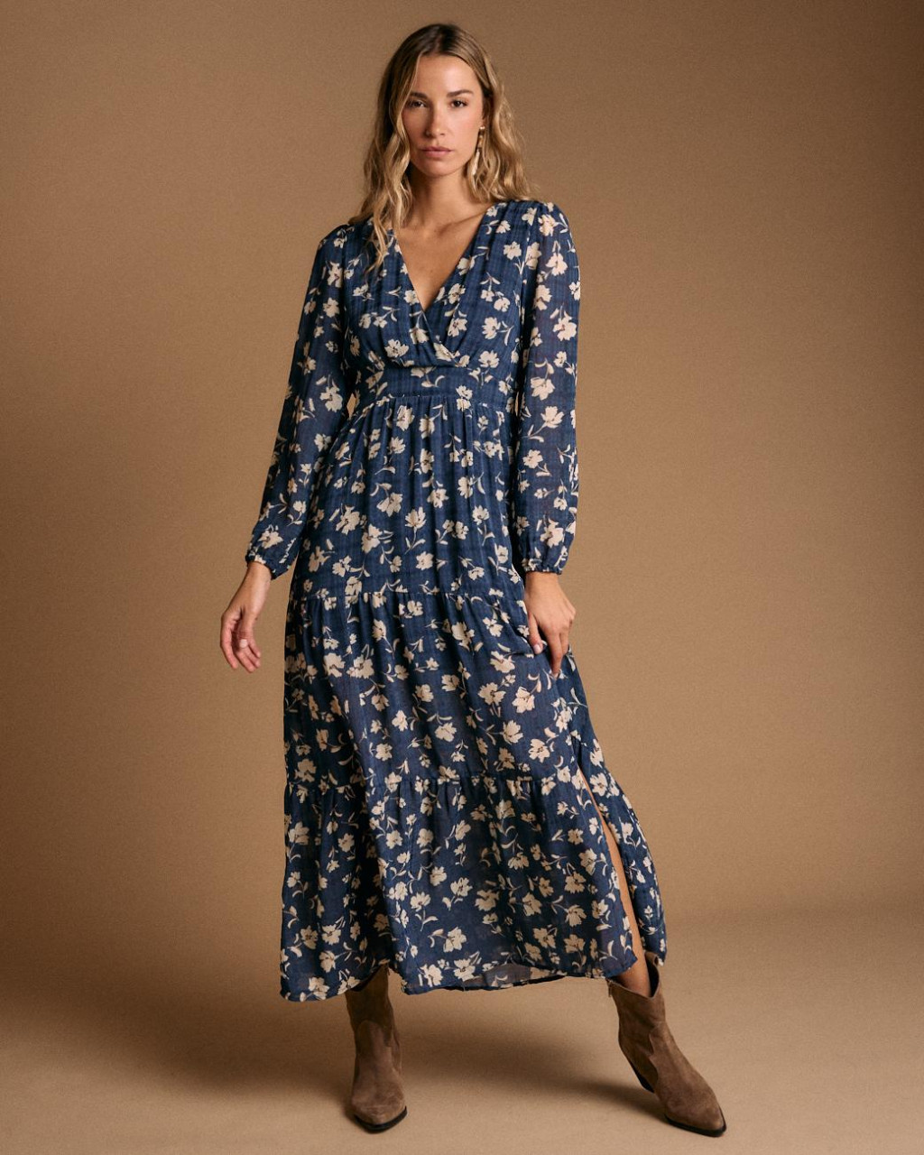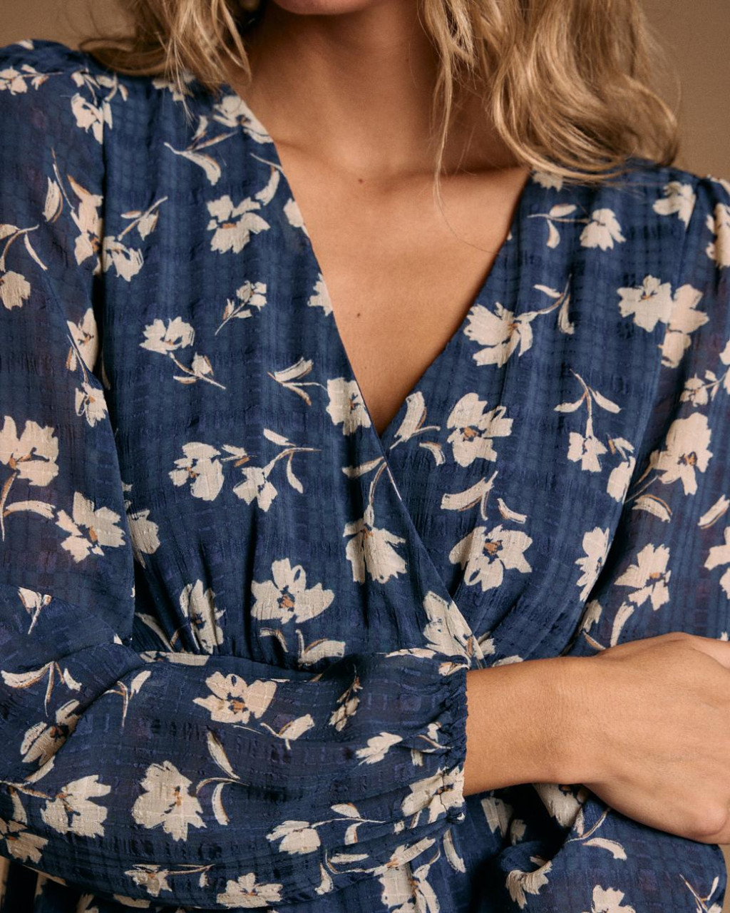 Modelo elegante com corte império. Decote em V com efeito trespasse.