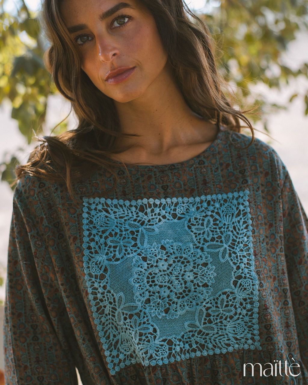 Ajuste solto com decote redondo e efeito de quadrado de renda azul na zona do peito.