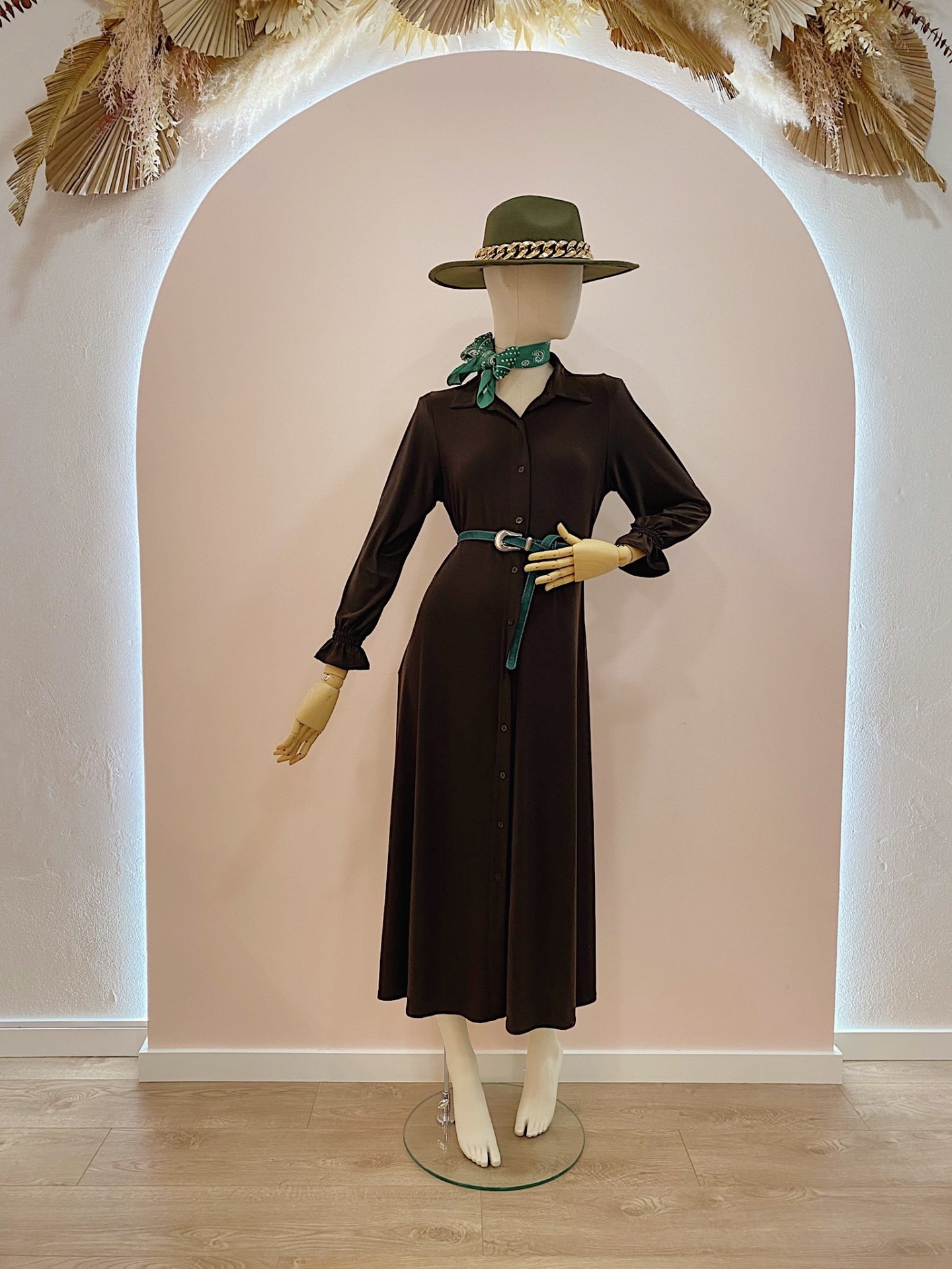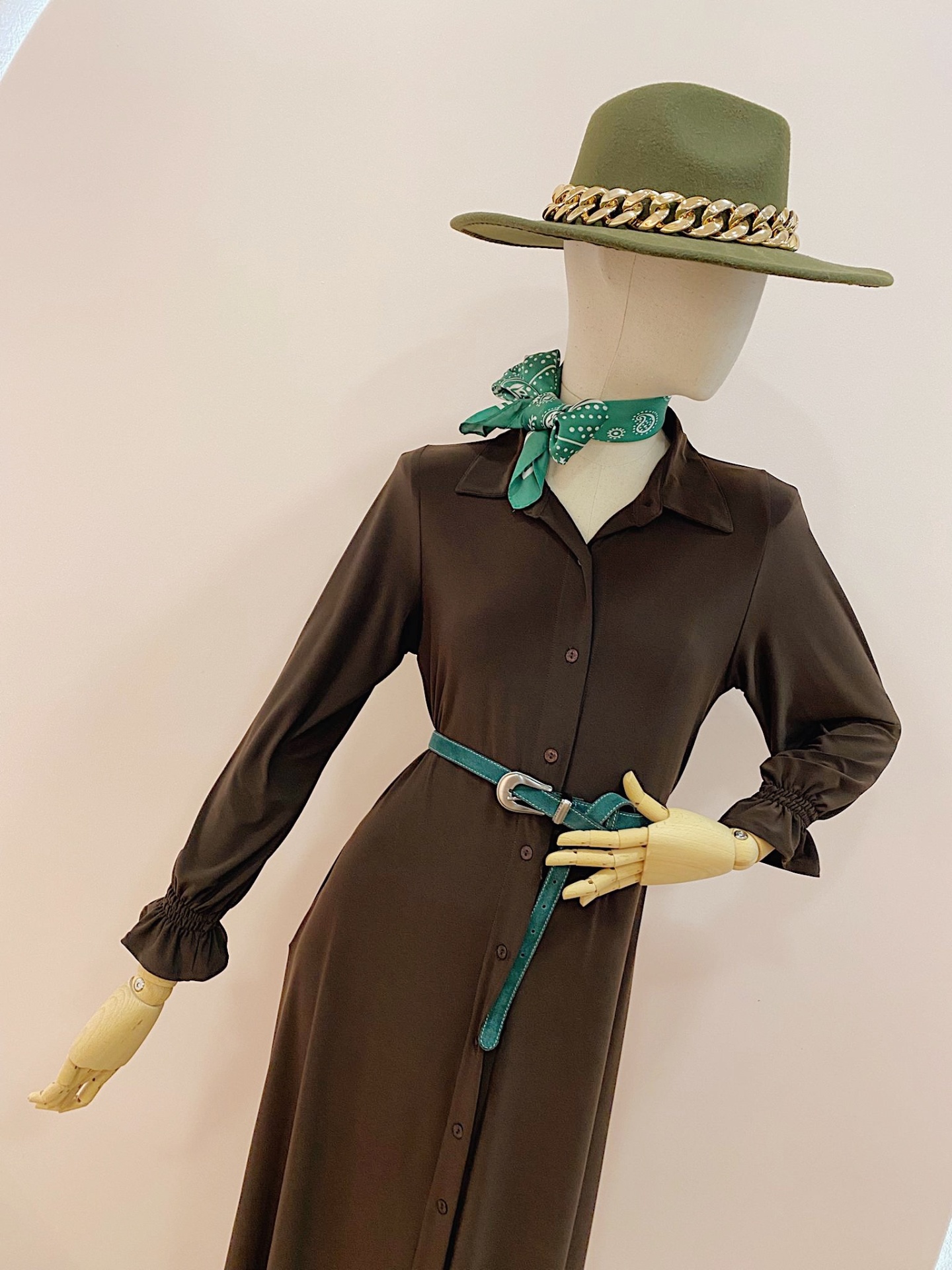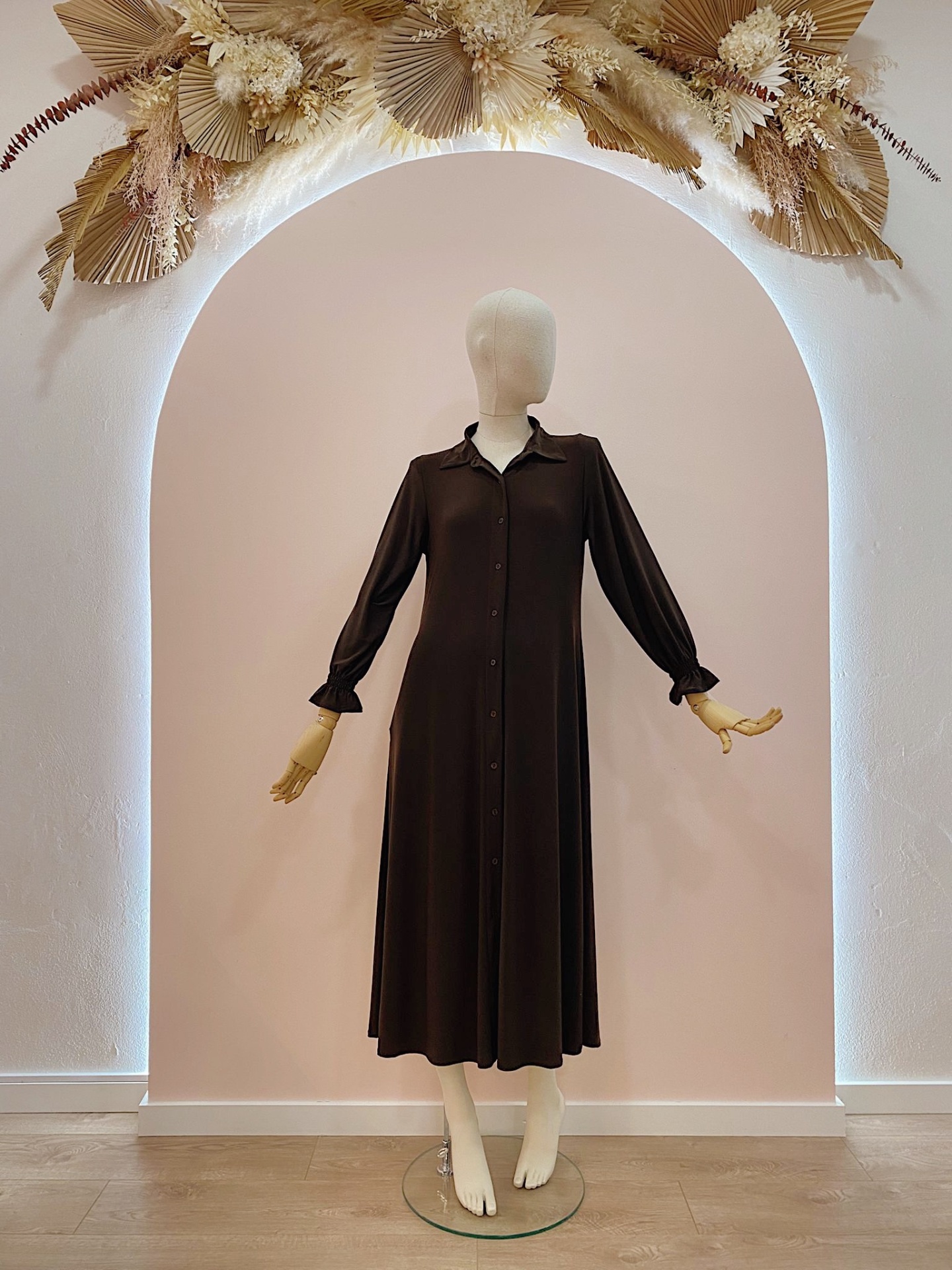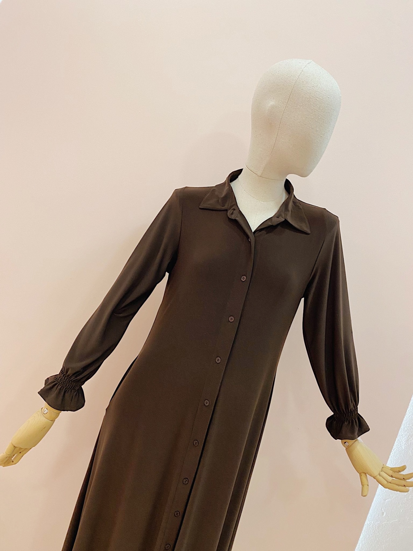 Vestido midi em modelo camiseiro, numa malha (estilo malha de seda) confortável, suave e sedosa.