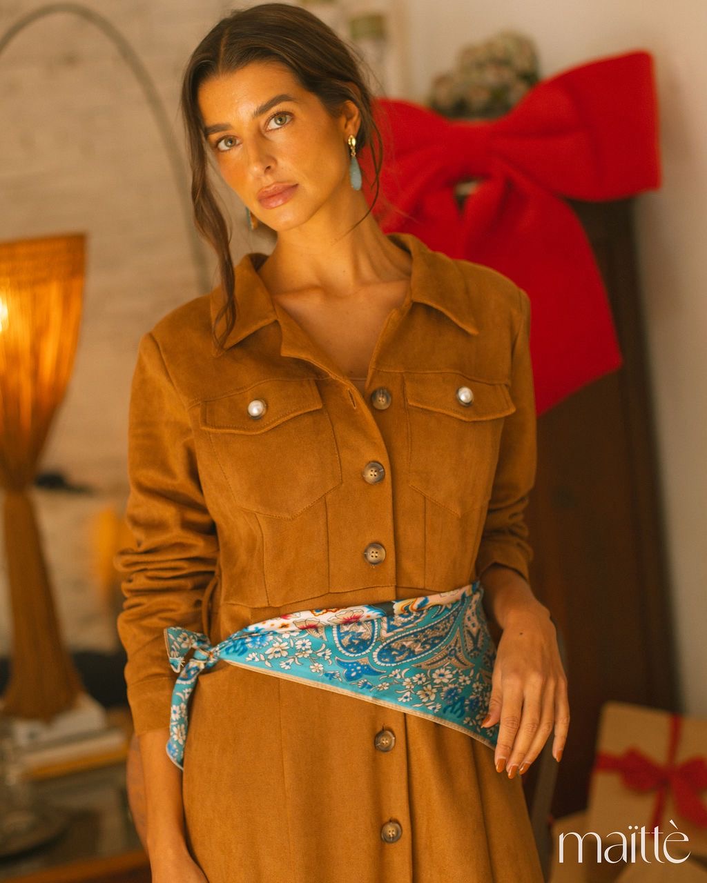 Vestido de comprimento midi em pele de pêssego com corte camiseiro.