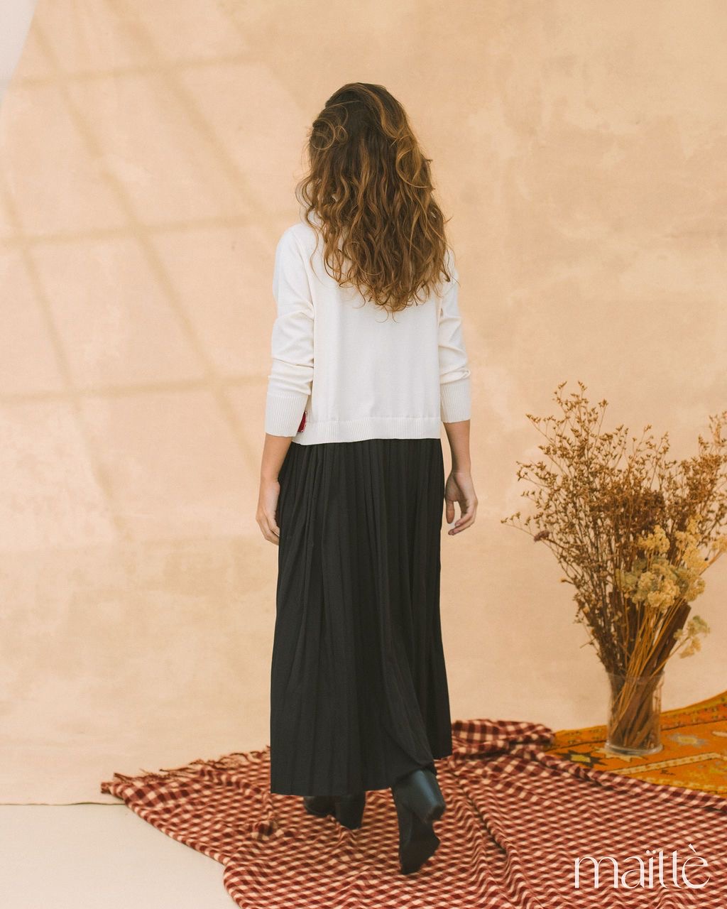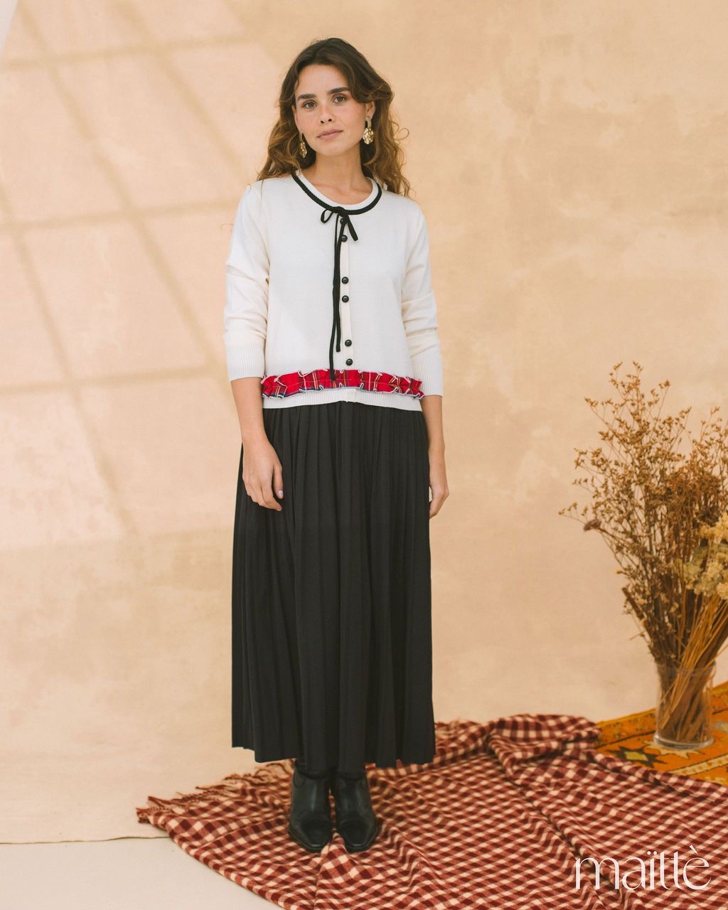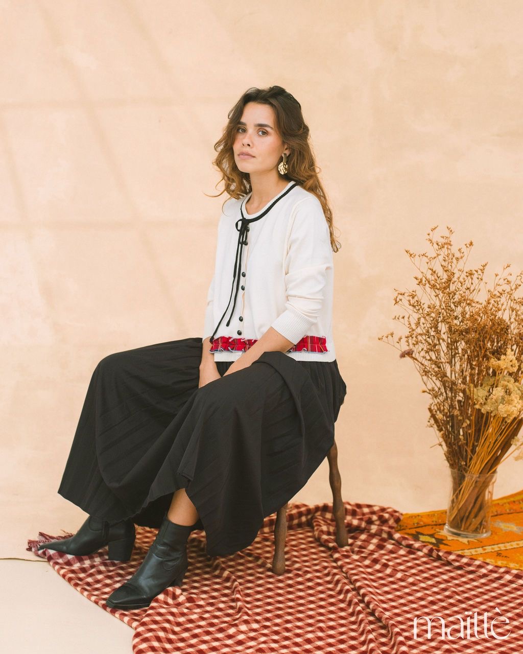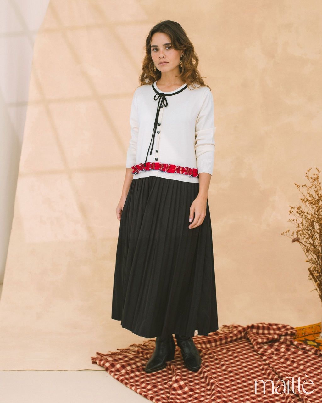 Ajuste solto com folho tradicional em xadrez na zona da cintura e efeito de saia plissada em preto.