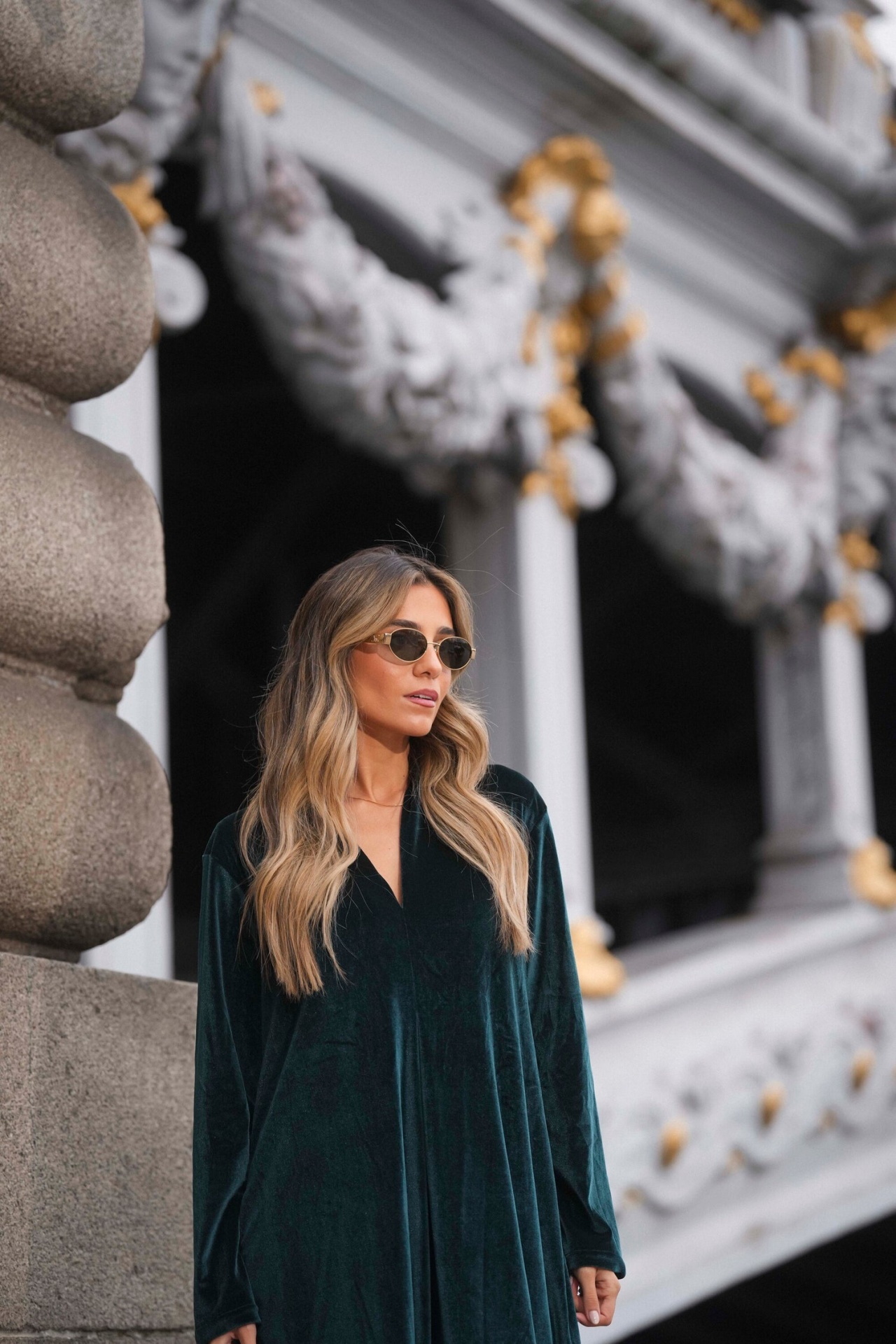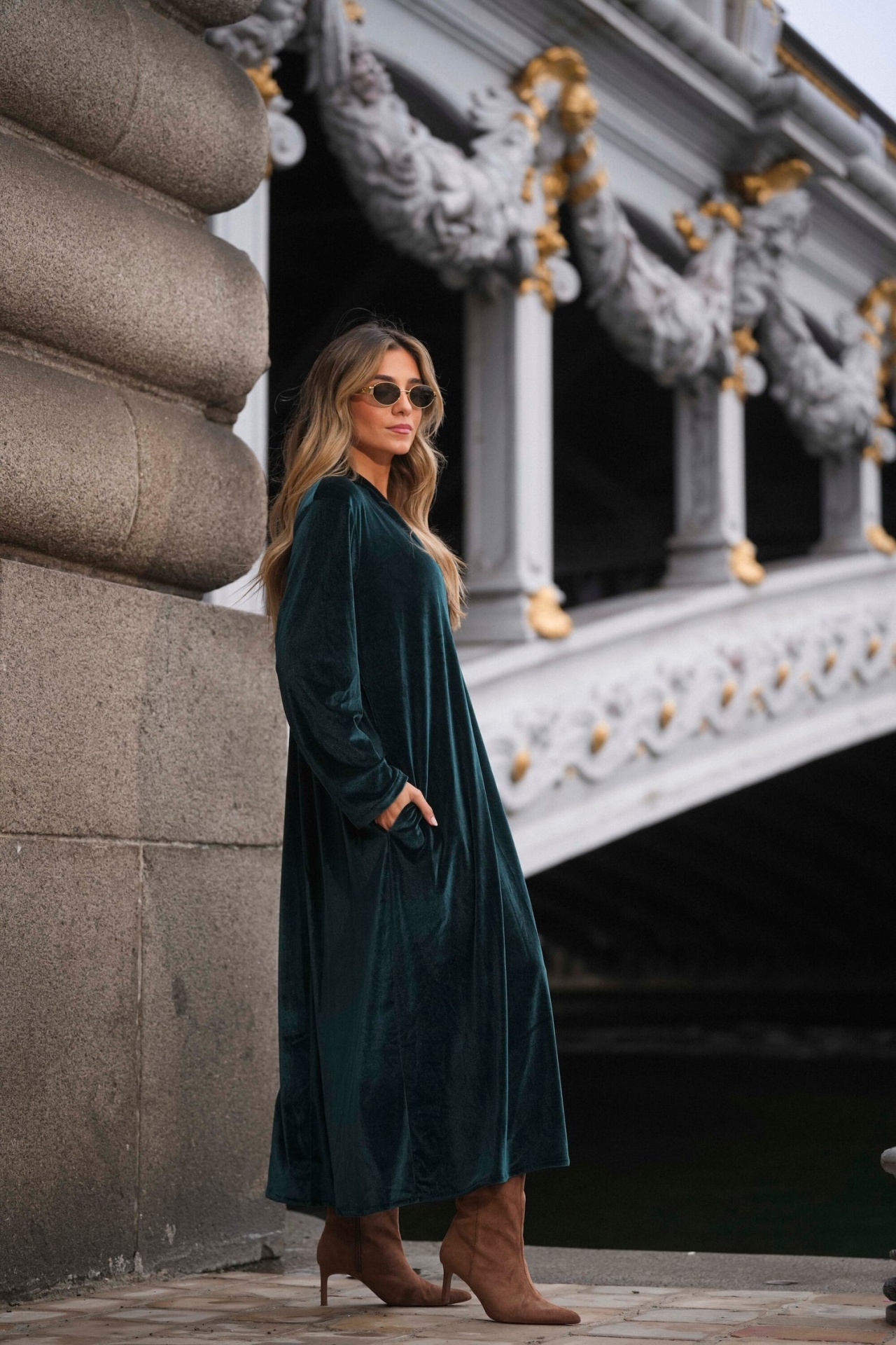 Vestido comprido em veludo com ajuste solto num corte descontraído e elegante.