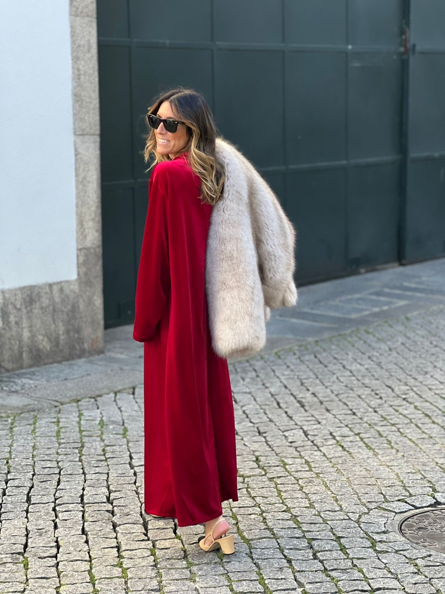 Vestido comprido em veludo com ajuste solto num corte descontraído e elegante.