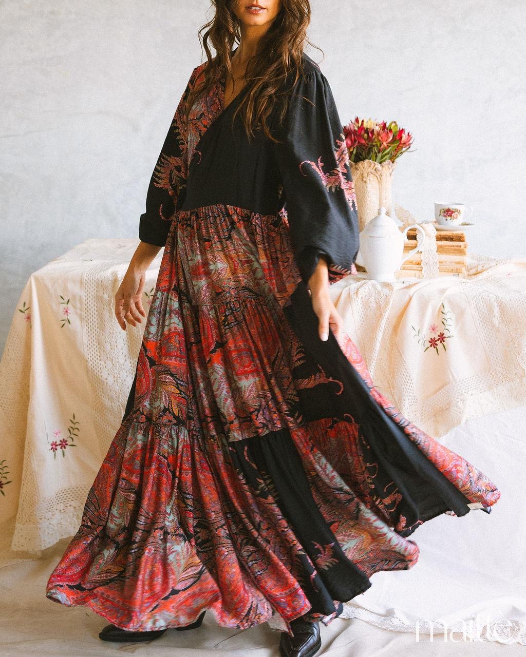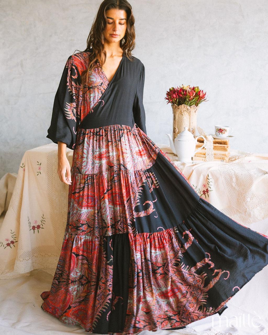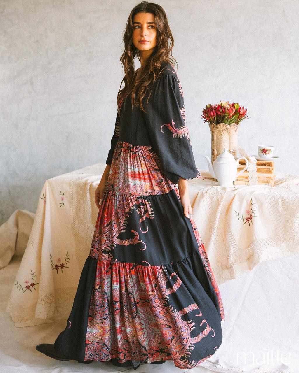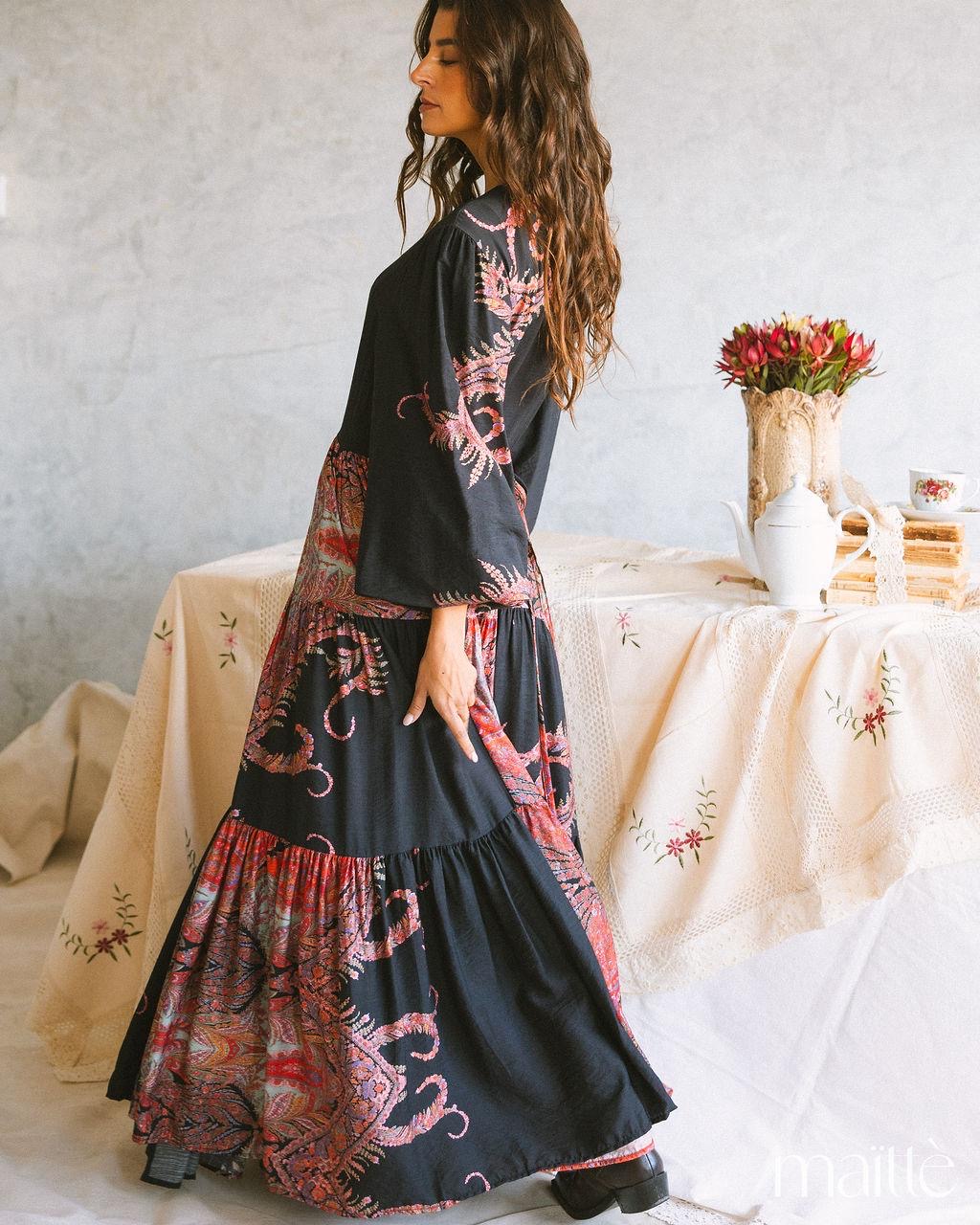 Vestido comprido com padrão bohemio em tons de preto e vermelho.