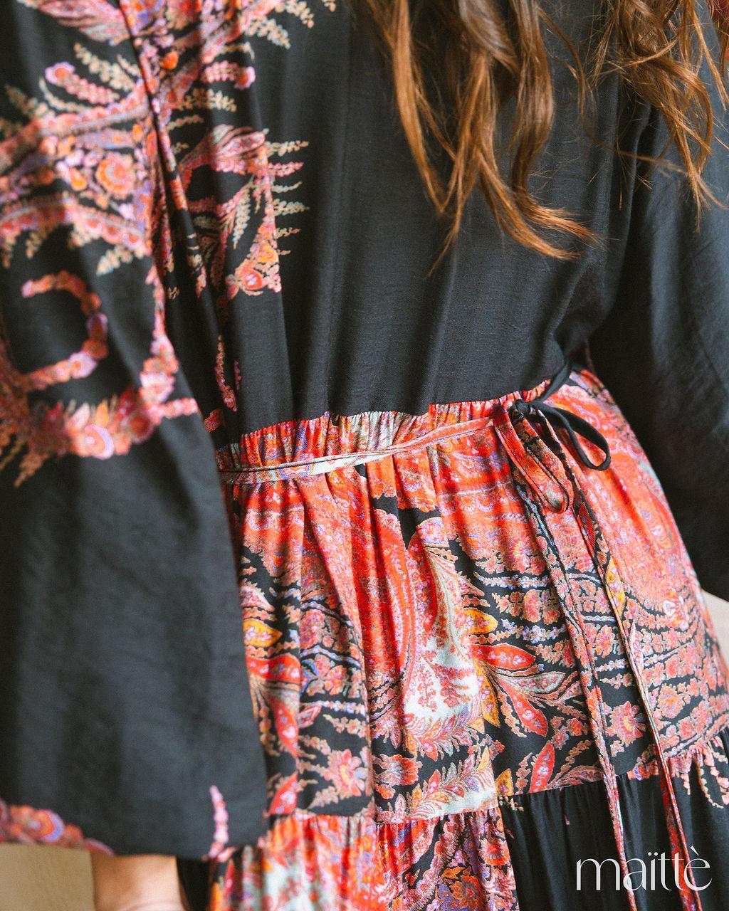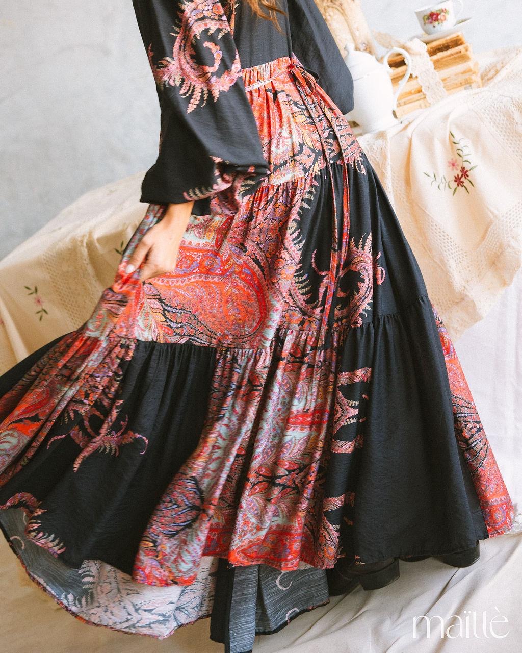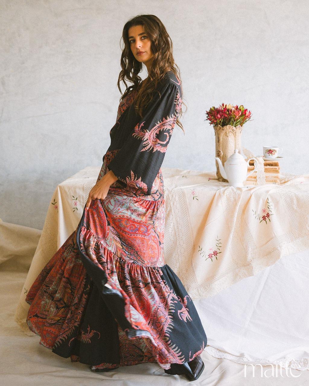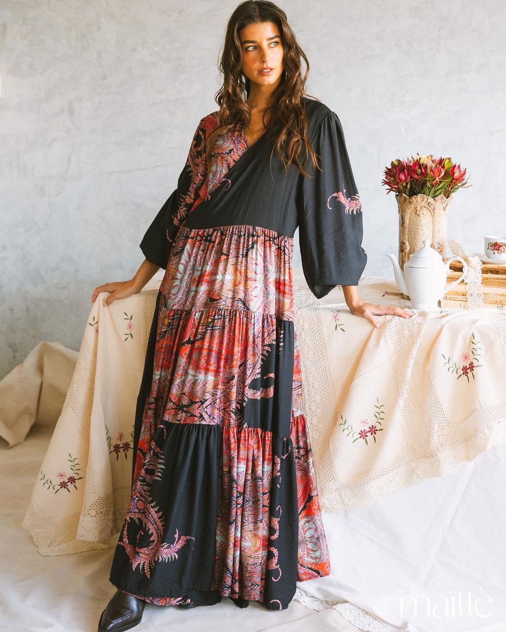 Vestido comprido com padrão bohemio em tons de preto e vermelho.