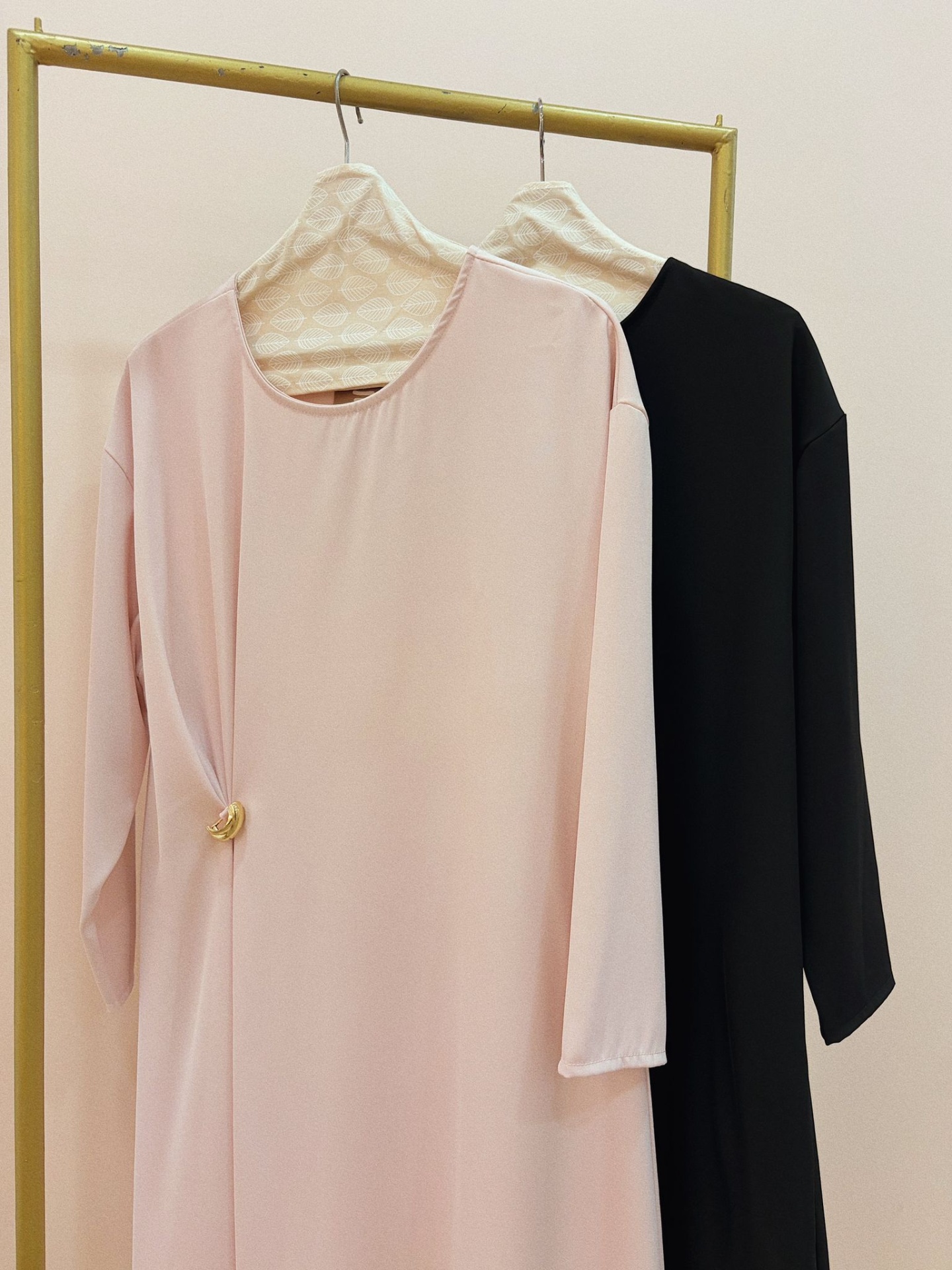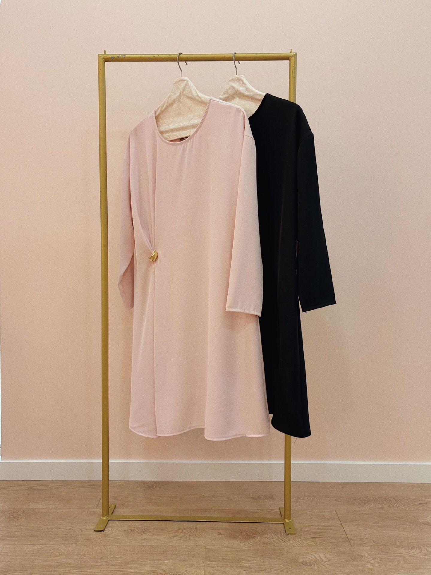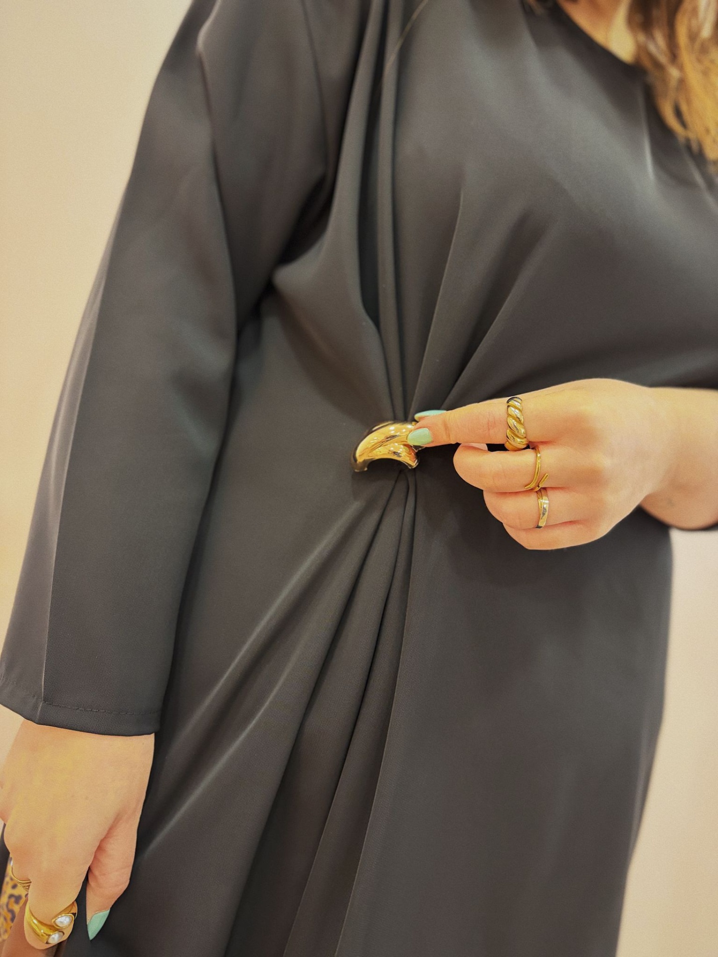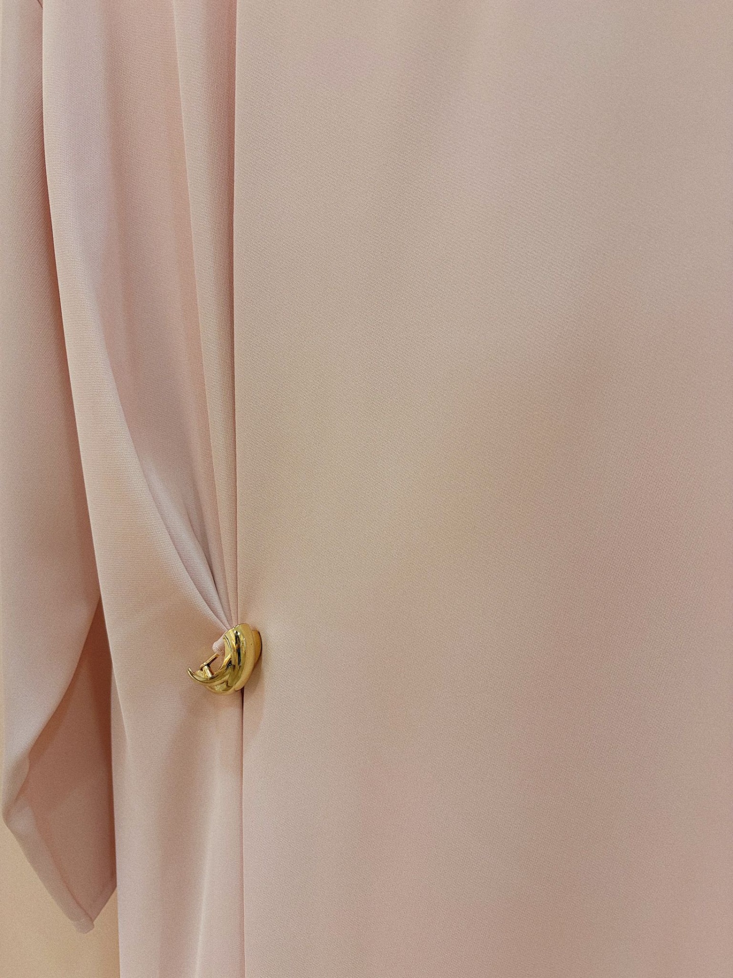 Corte em A, efeito lateral com drapeado e peça lateral dourada.