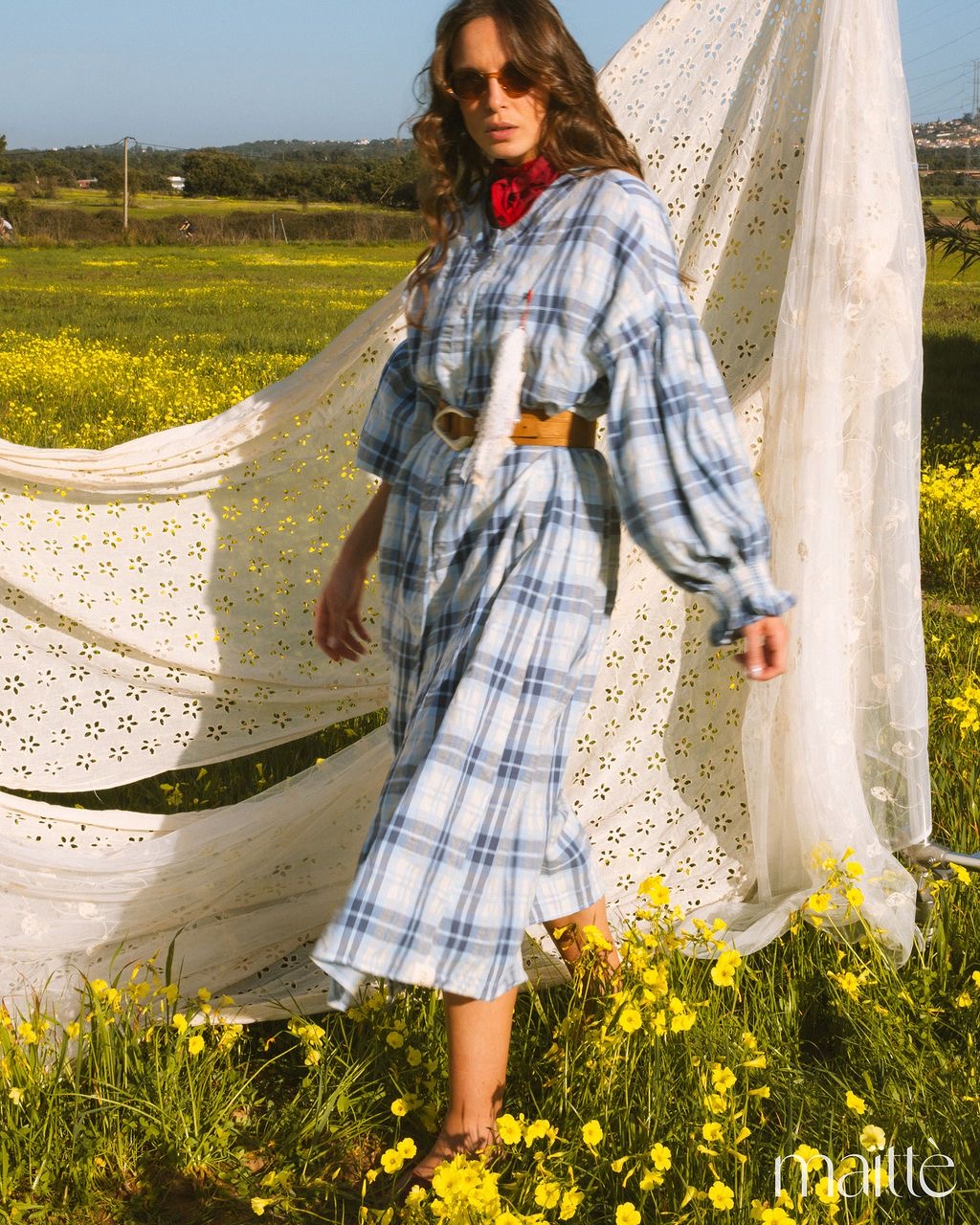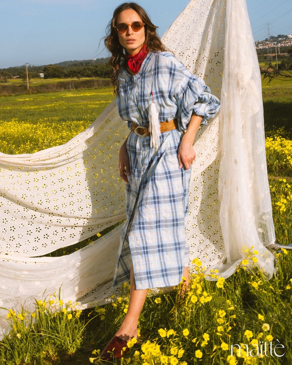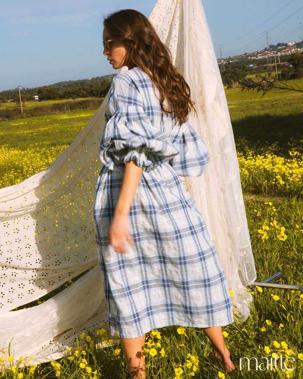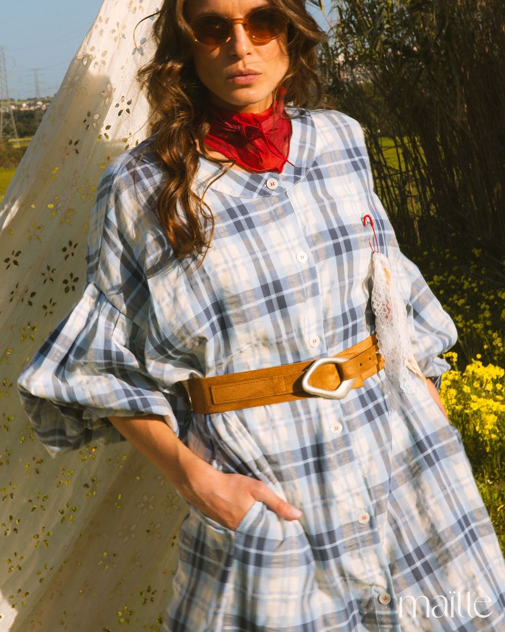 Vestido de comprimento midi com ajuste solto com padrão de xadrez em tons de azul e branco.