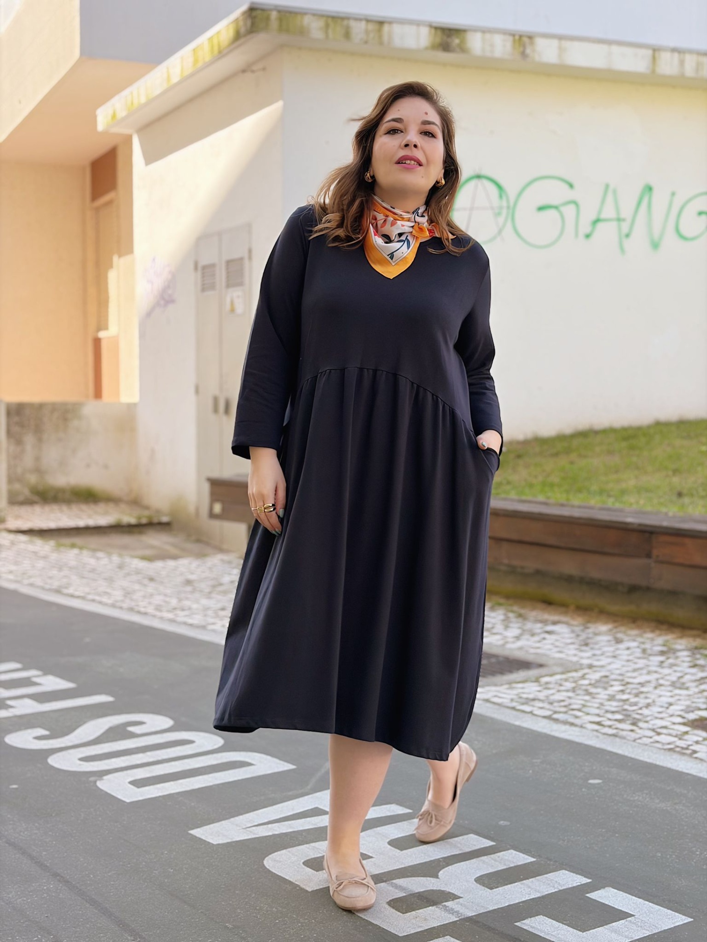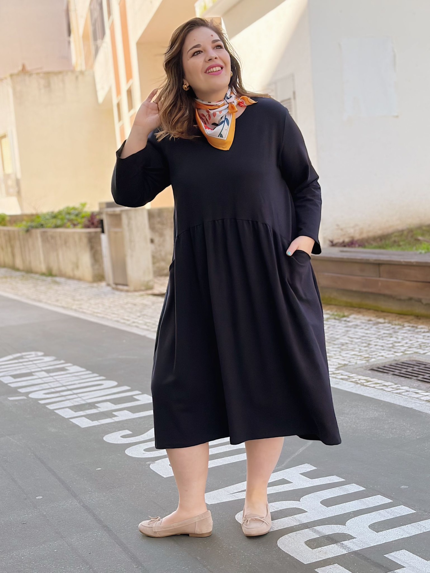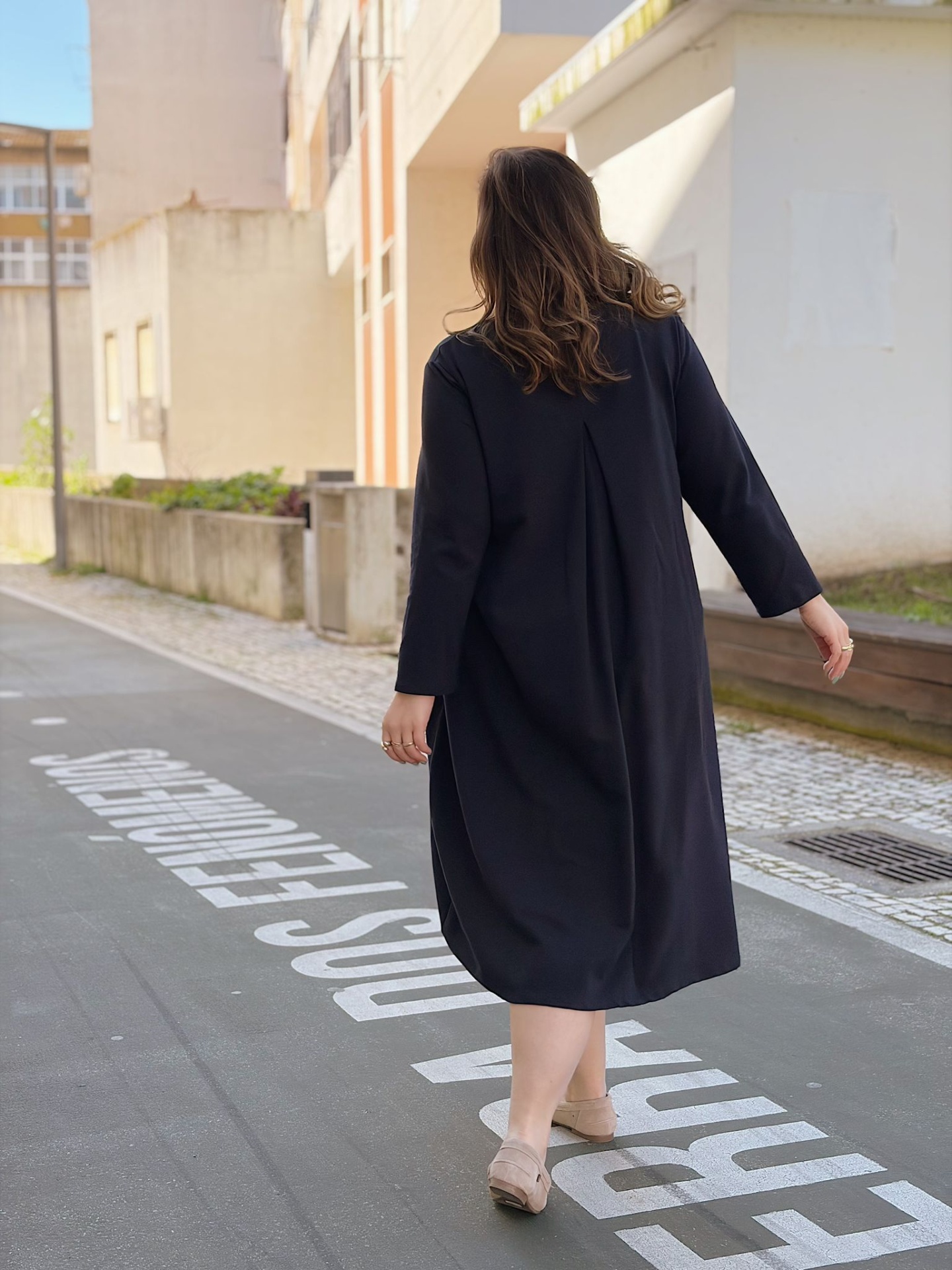 Comprimento midi. Decote redondo. Mangas compridas com efeito de virola (ajustável).