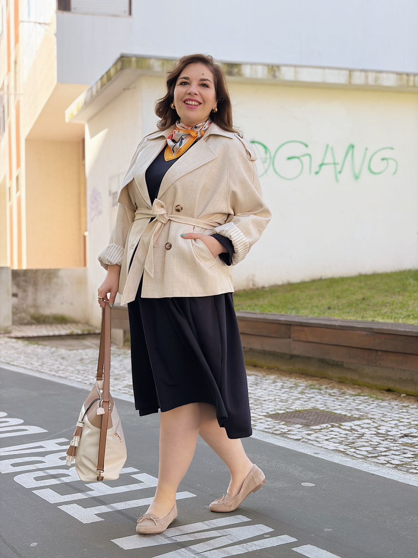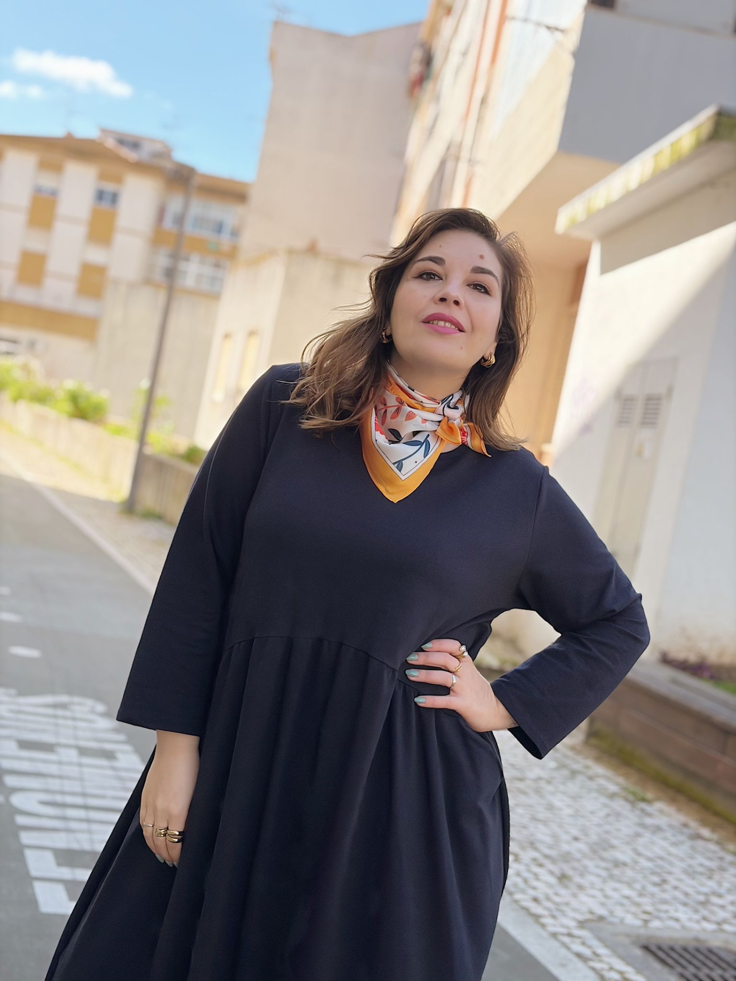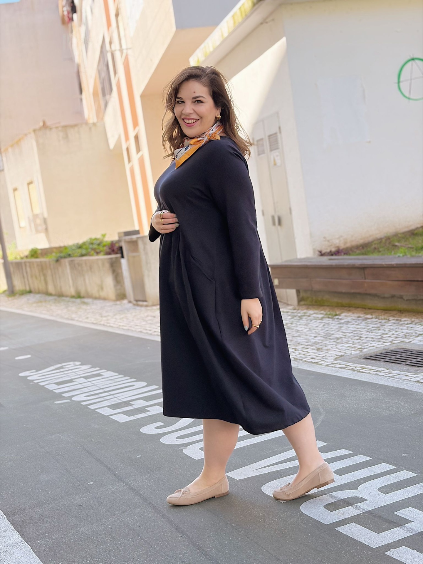 Comprimento midi. Decote redondo. Mangas compridas com efeito de virola (ajustável).