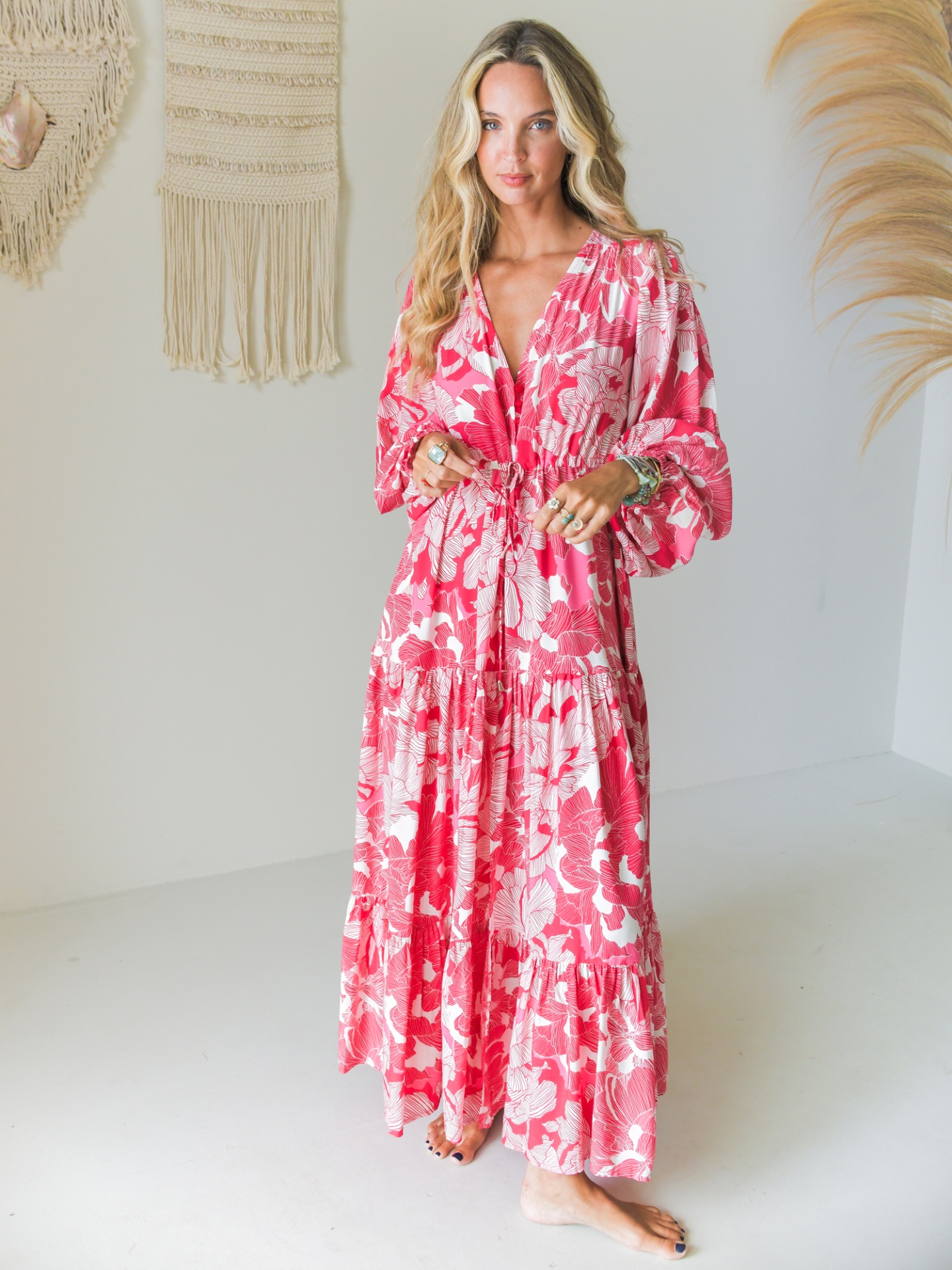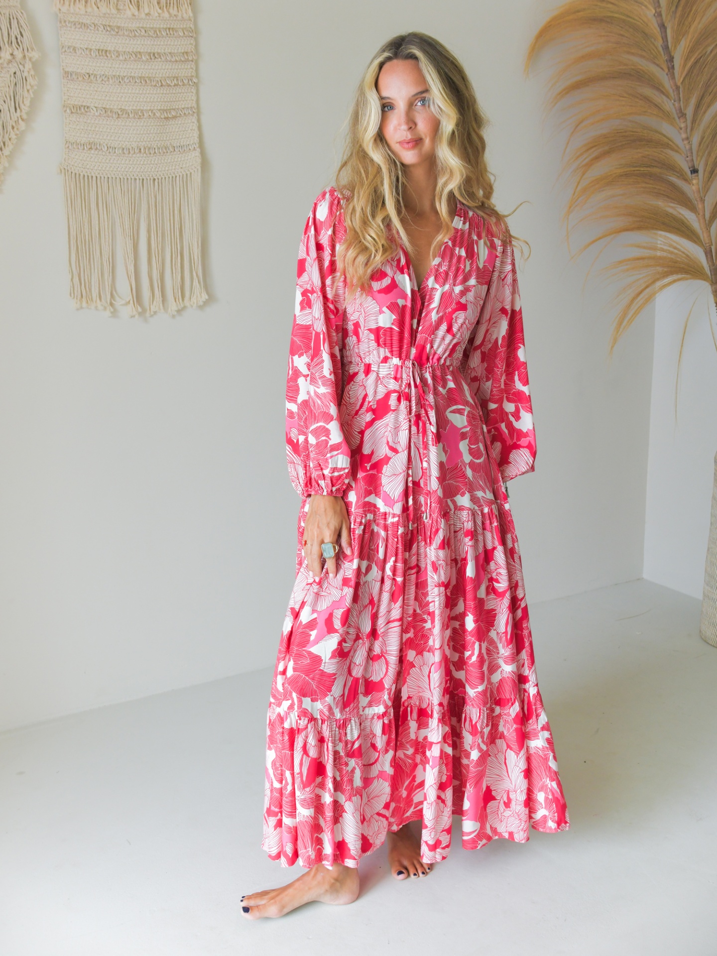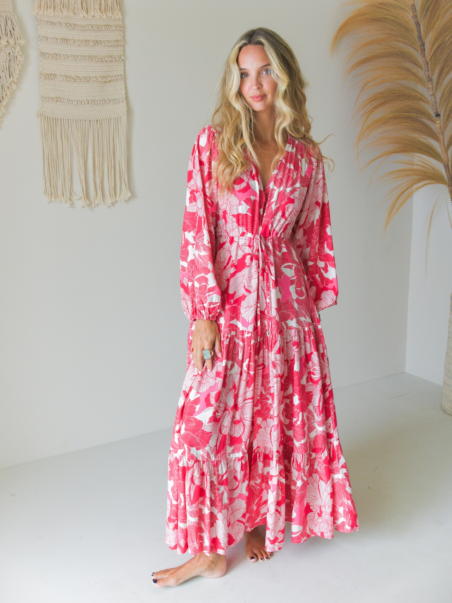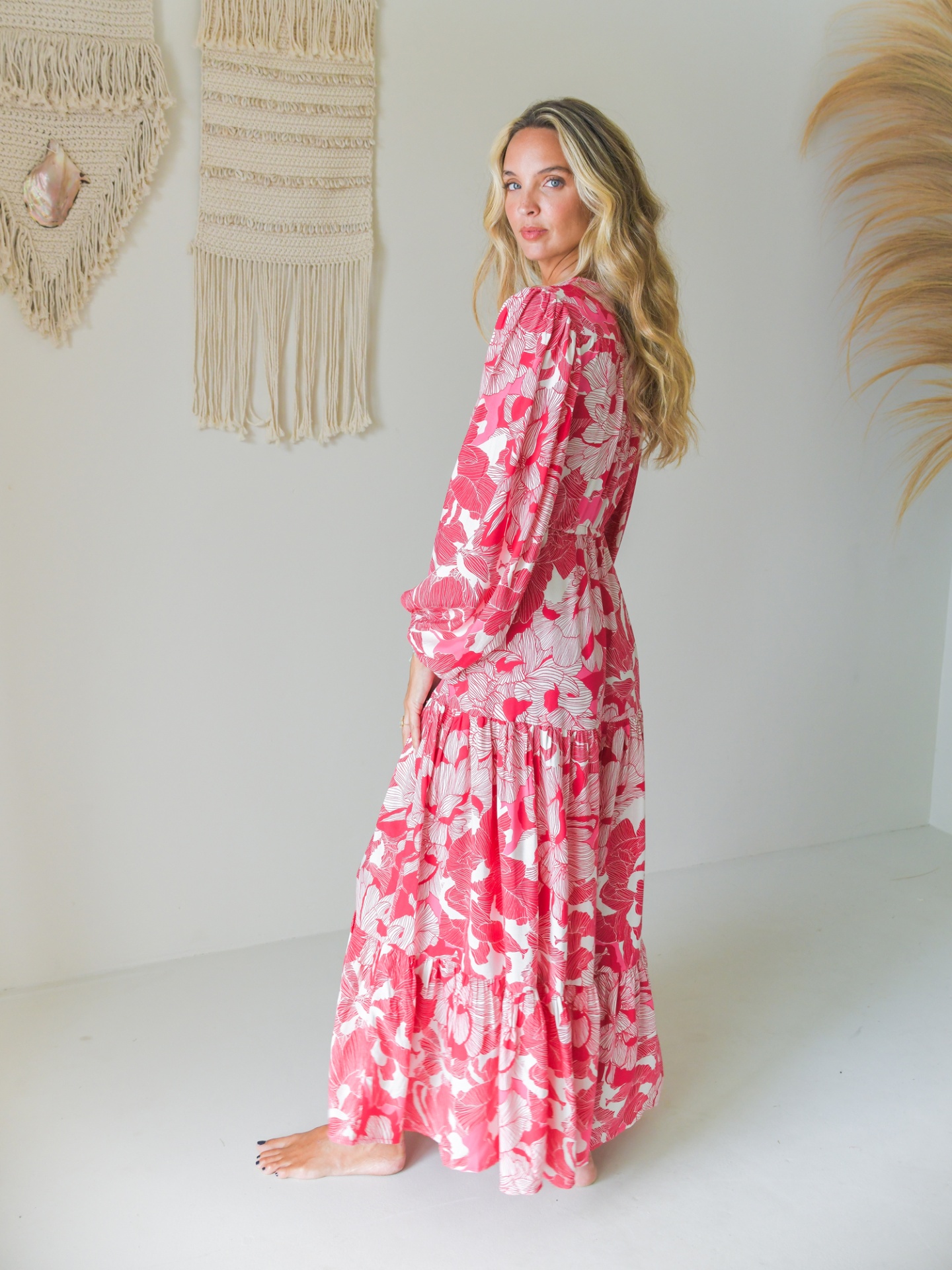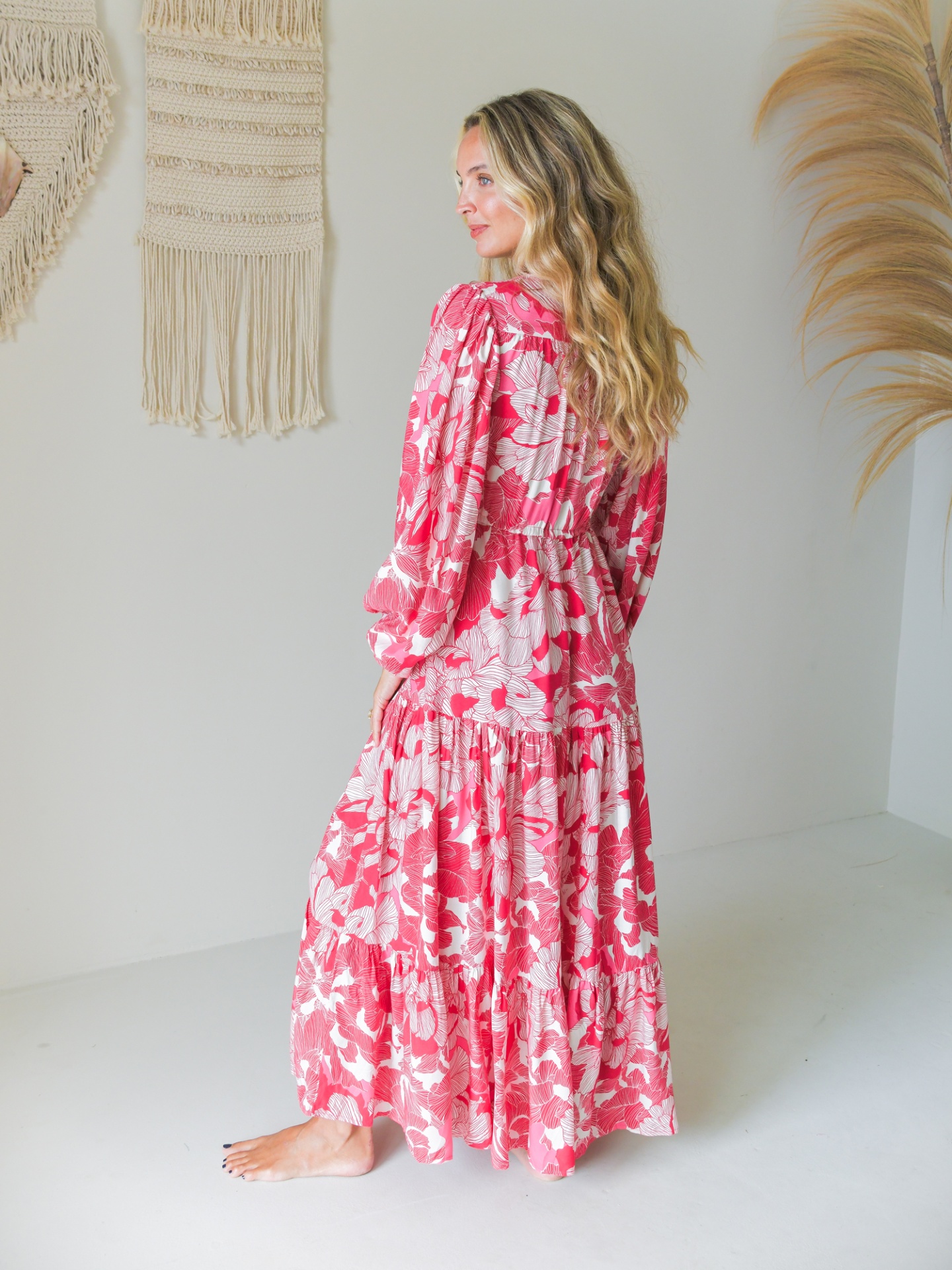 Vestido comprido com padrão floral abstracto em tons de rosa.